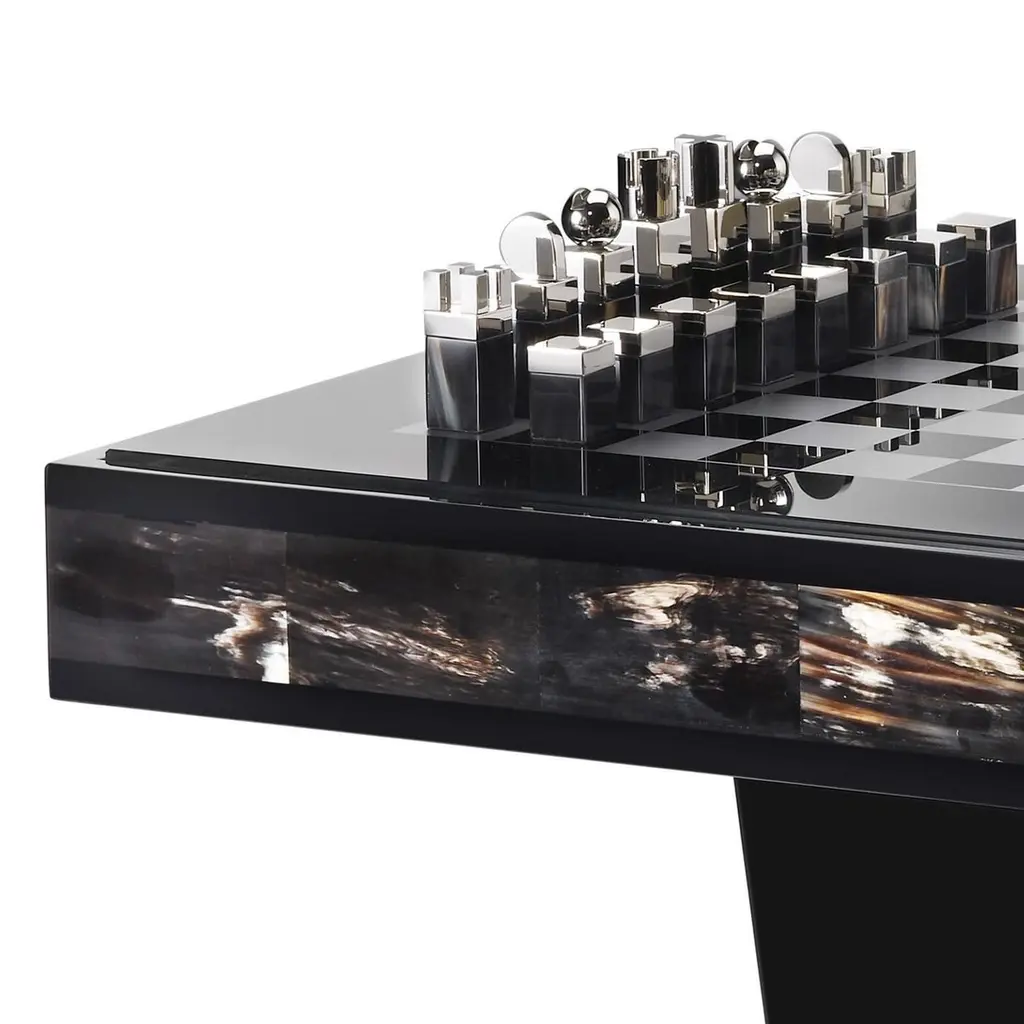 This stunning Alfio Chess Table is crafted in dark horn and black lacquered wood and features a top in smoked tempered glass with a silver chessboard design. The splendid chessboard pieces are made from horn and palladium plated brass. Designed by Arcahorn, the table measures 55 x 55 cm and is 60 cm in height.