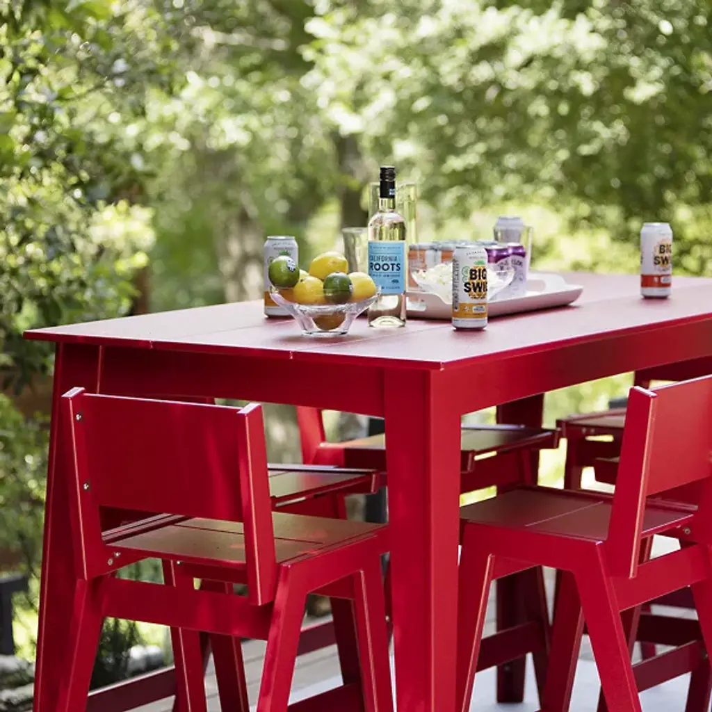 Take in the fresh, open fair while seated at the Alfresco Rectangular Outdoor Bar/Counter Table from Loll Designs. This table feels up-to-date in its uniform color and clean edges while feeling familiar with its slatted design. The slatted tabletop helps water or spills pass through for quick, continued use. The legs share a tidy silhouette that invites one to sit comfortably or mingle. Both the tabletop and the splayed legs share a high-density polyethylene construction that’s rugged and promotes color health. This polyethylene material promotes sustainability as it comes from recycled milk jugs.