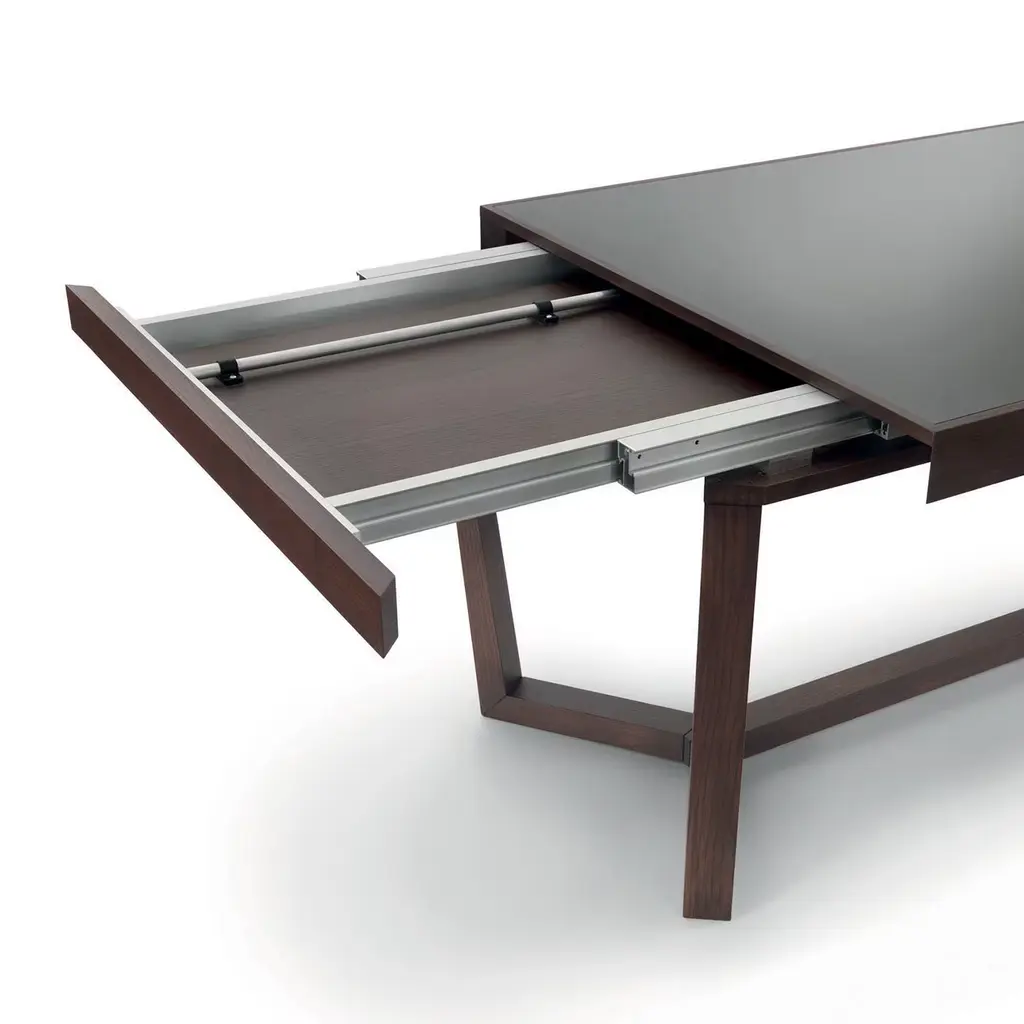 A highly functional furnishing item, the extendable Aliante Table features a clean and elegant design by Pacinie e Cappellini. With a structure in solid ash and a top in ash wood veneer or painted glass, it is also available in wenge, walnut, black stained, tobacco or open pore matt lacquer finishes. An aluminum mechanism holds the internal extension panel.