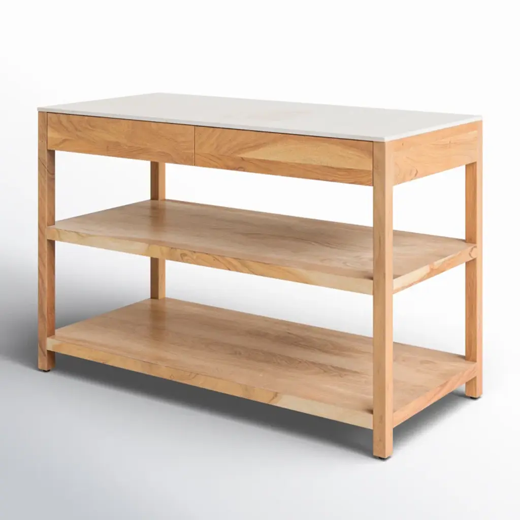 This 54'' kitchen island offers a versatile work surface and storage for your cooking essentials. Crafted from a blend of solid and engineered wood, this piece showcases a brown base with a white marble countertop that adds a touch of refinement to your kitchen. Two exterior shelves provide ample space for cookbooks, mixing bowls, or small appliances, while the 120 lb. weight capacity ensures it can handle your culinary needs. With its natural wood grain color variation, this rectangular prep table brings a warm and inviting atmosphere to your home.