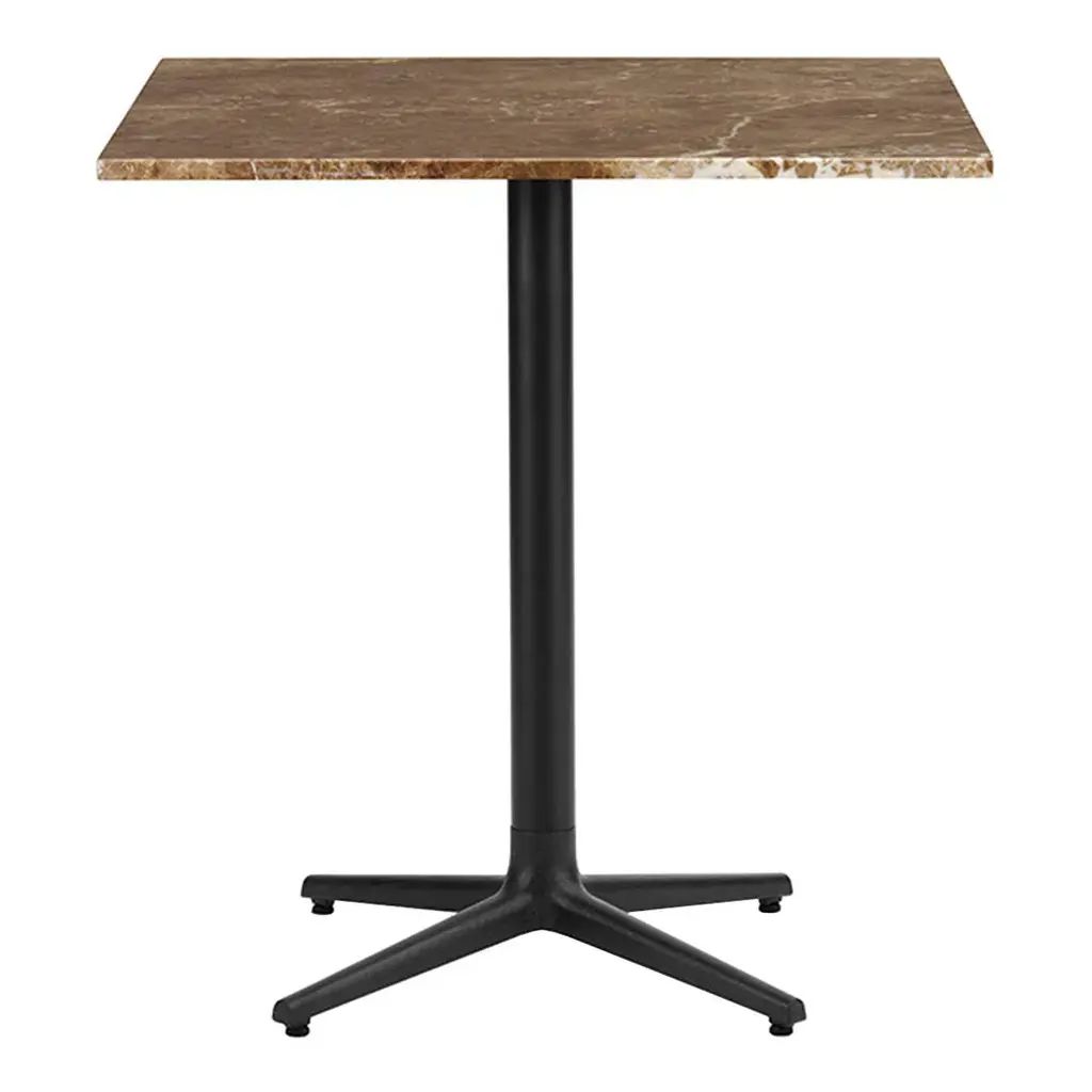 Allez table consist of a center base in cast iron with three or four legs. The tabletop comes in various sizes and shapes available in marble, Veneer, or brushed stainless steel. Allez table is suitable for indoor or outdoor use. The table is delivered flat-packed and must be assembled using the included tools. The tabletop is mounted with four screws.The marble tabletops are treated with a surface treatment that penetrates into the material and thereby provides a long-term protection. The surface should not be exposed to acidic foods or beverages, which can leave stains on the surface.