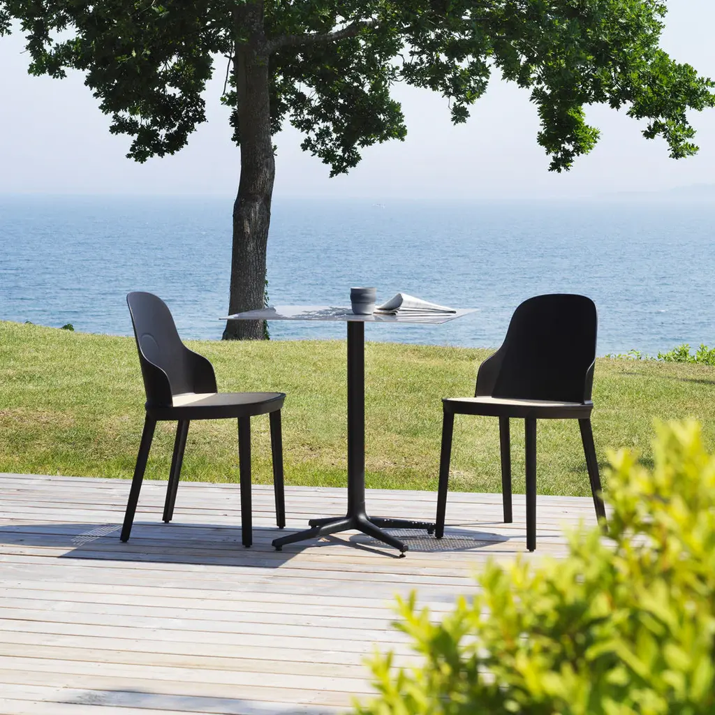 Allez table consist of a center base in cast iron with three or four legs. The tabletop comes in various sizes and shapes available in marble, Veneer, or brushed stainless steel. Allez table is suitable for indoor or outdoor use. The table is delivered flat-packed and must be assembled using the included tools. The tabletop is mounted with four screws.The marble tabletops are treated with a surface treatment that penetrates into the material and thereby provides a long-term protection. The surface should not be exposed to acidic foods or beverages, which can leave stains on the surface.