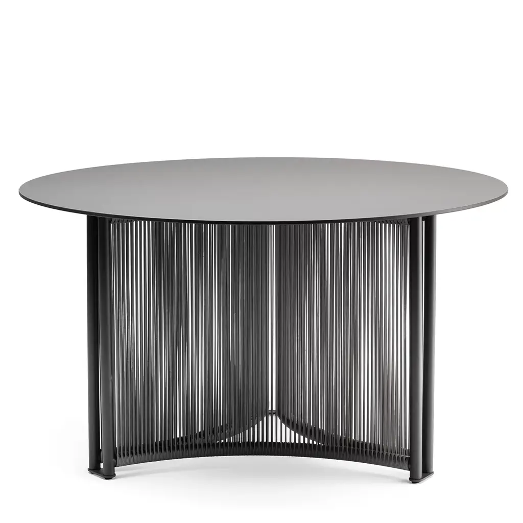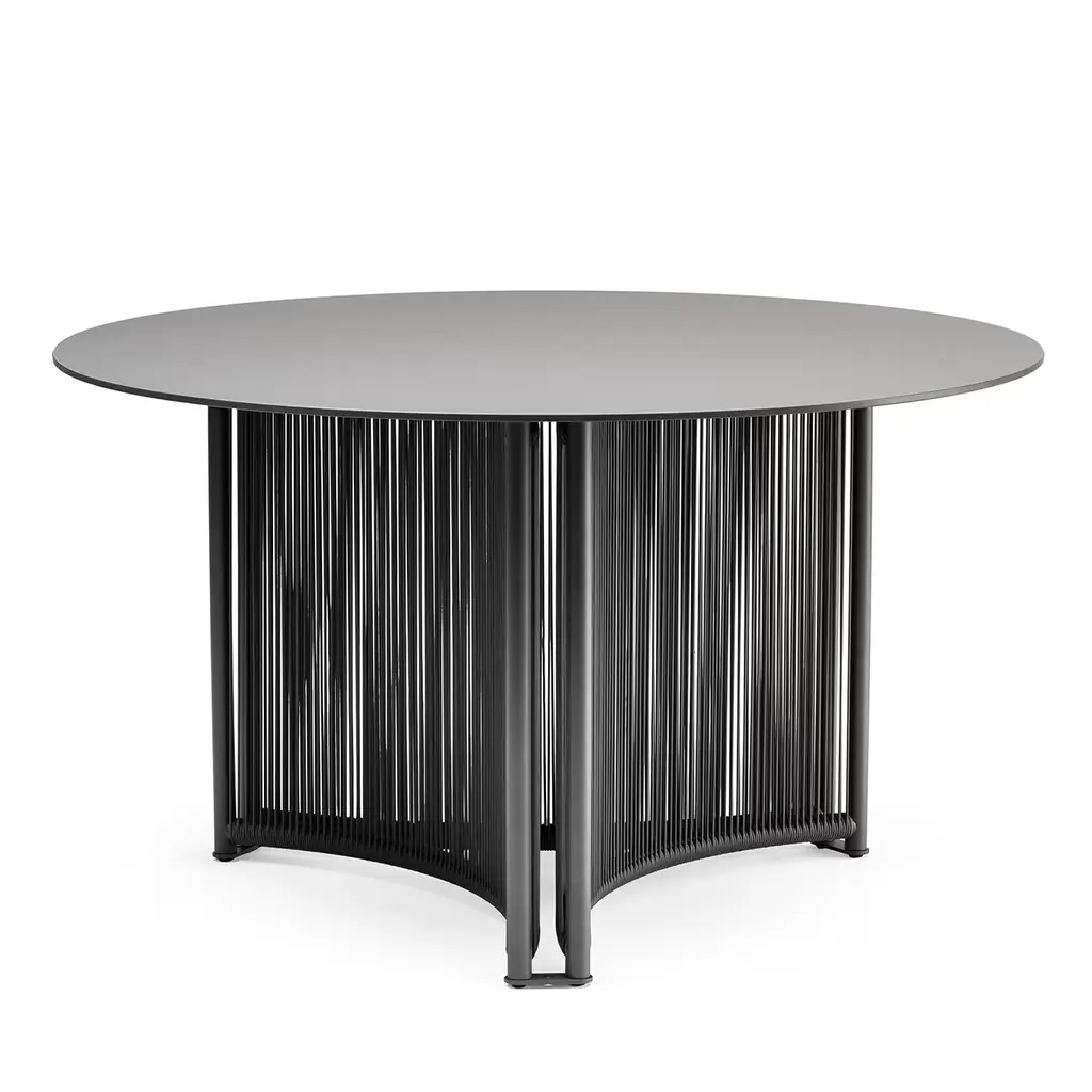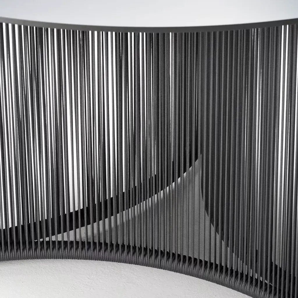 A triumph of curves tracing a silhouette of exceptional dynamism marks this circular table Antonio De Marco designed for the Altana Collection. The anthracite-powder-coated steel frame features inward-curved sides that are adorned with a hand-woven design of gray marine ropes revealing its nautical inspiration. Suitable for outdoor use, the piece is sealed by a round gray HPL top.