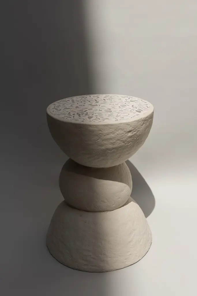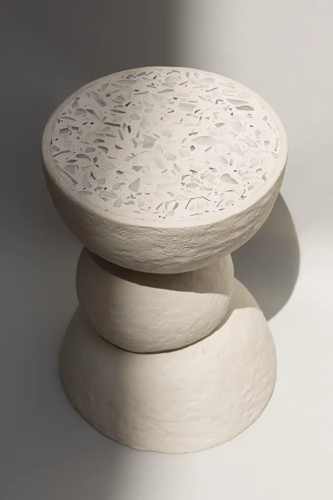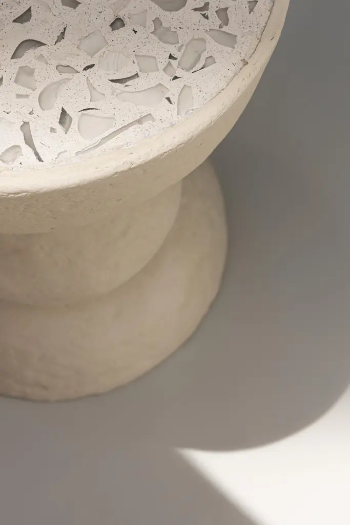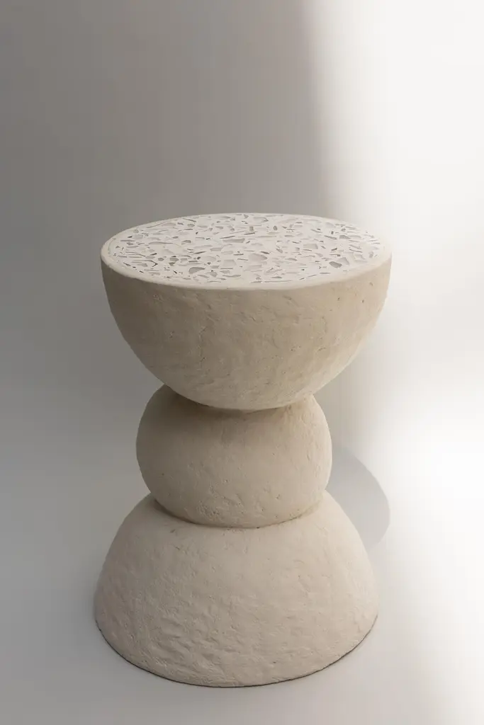 Amanita table II by Ana Tron.Limited Edition of 5Dimensions: D 35 x H 55 cmMaterials: Recycled paper with paste, paint chalk, and matt water-based varnish. Glass.Recycled paper table with concrete cover and pieces of reused glass.Ana Tron is an interior designer and an imperfect environmentalist.Relatively recently, she entered the world of sustainability and she realized that as an interior designer her work left an important environmental footprint, so she decided to look for products and processes that were much more sustainable and friendly to the environment.Along the way, she found that there is very little supply of sustainable products in terms of interior design and that we as consumers are not aware of the impact of what we buy for our homes.That is why she decided to explore the possibility of developing quality, well-designed products with recycled materials, to invite everyone to wake up their imperfect environmentalist and do their bit to take care of the planet.