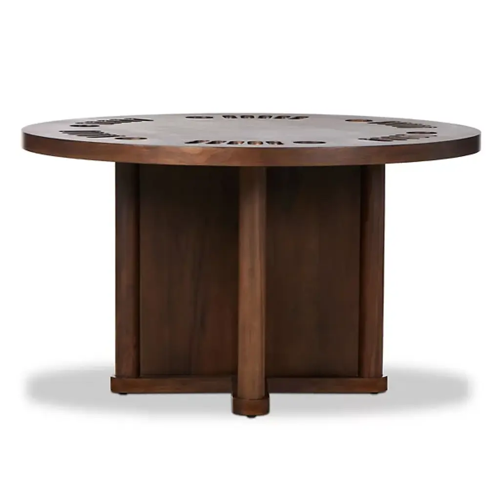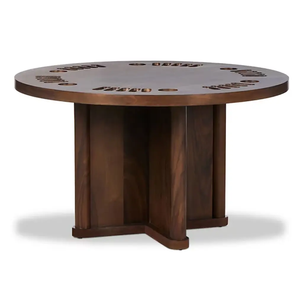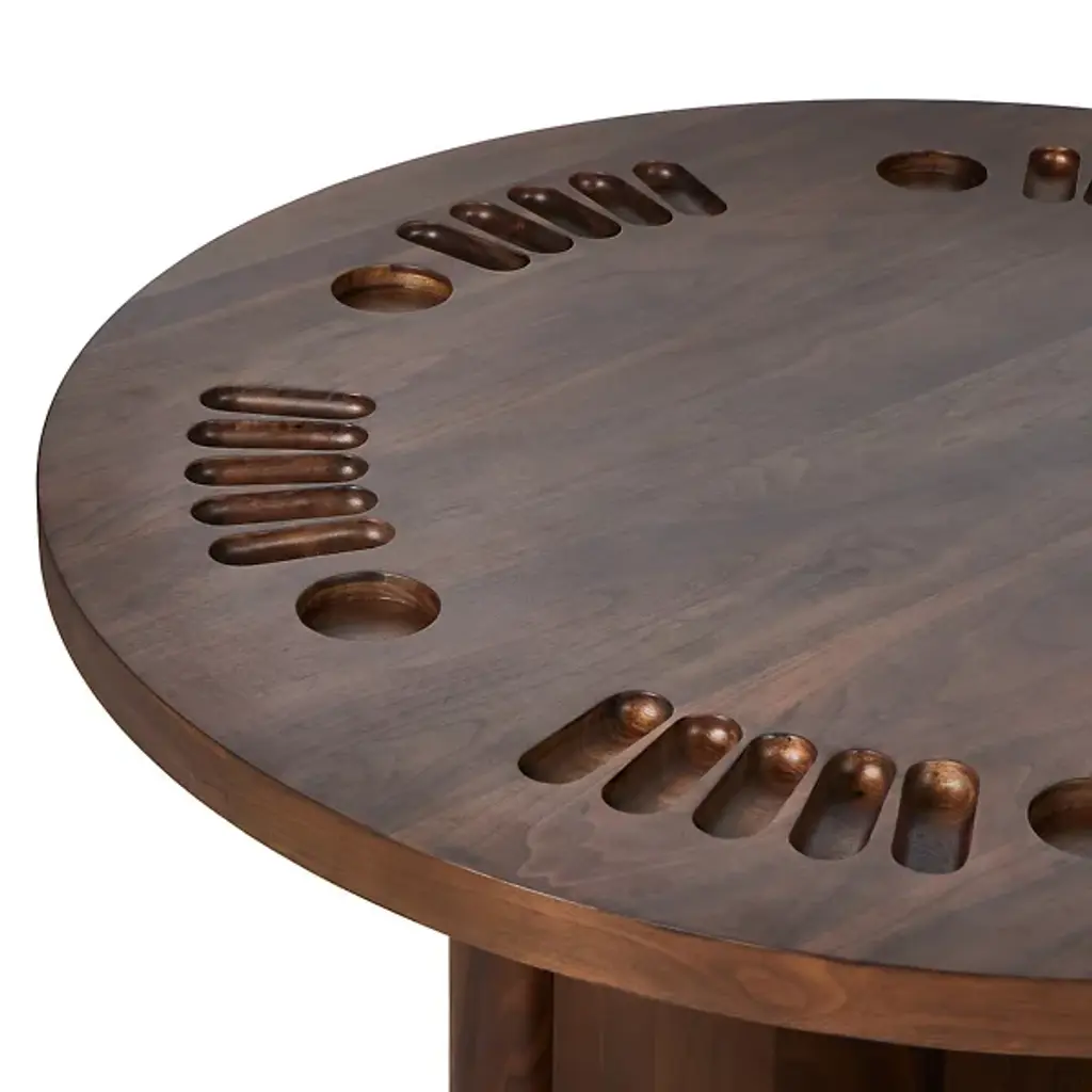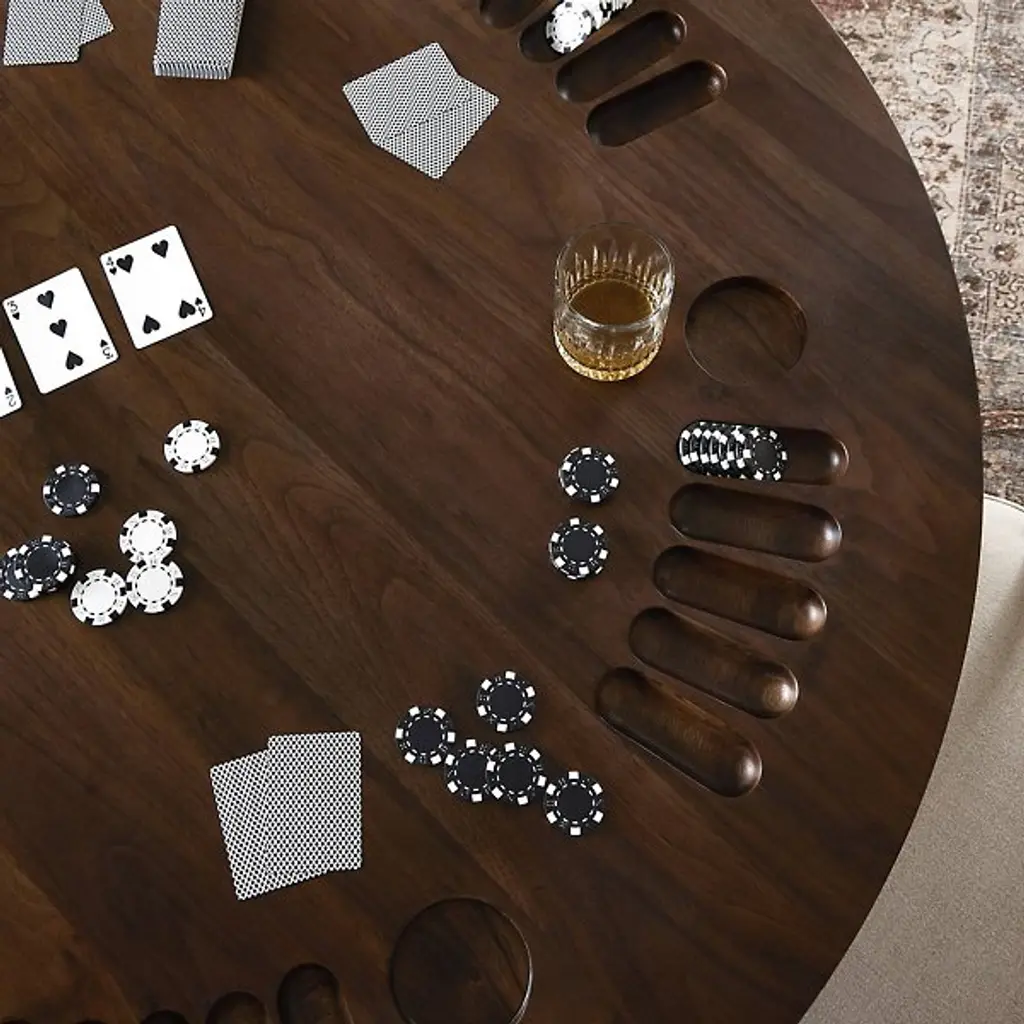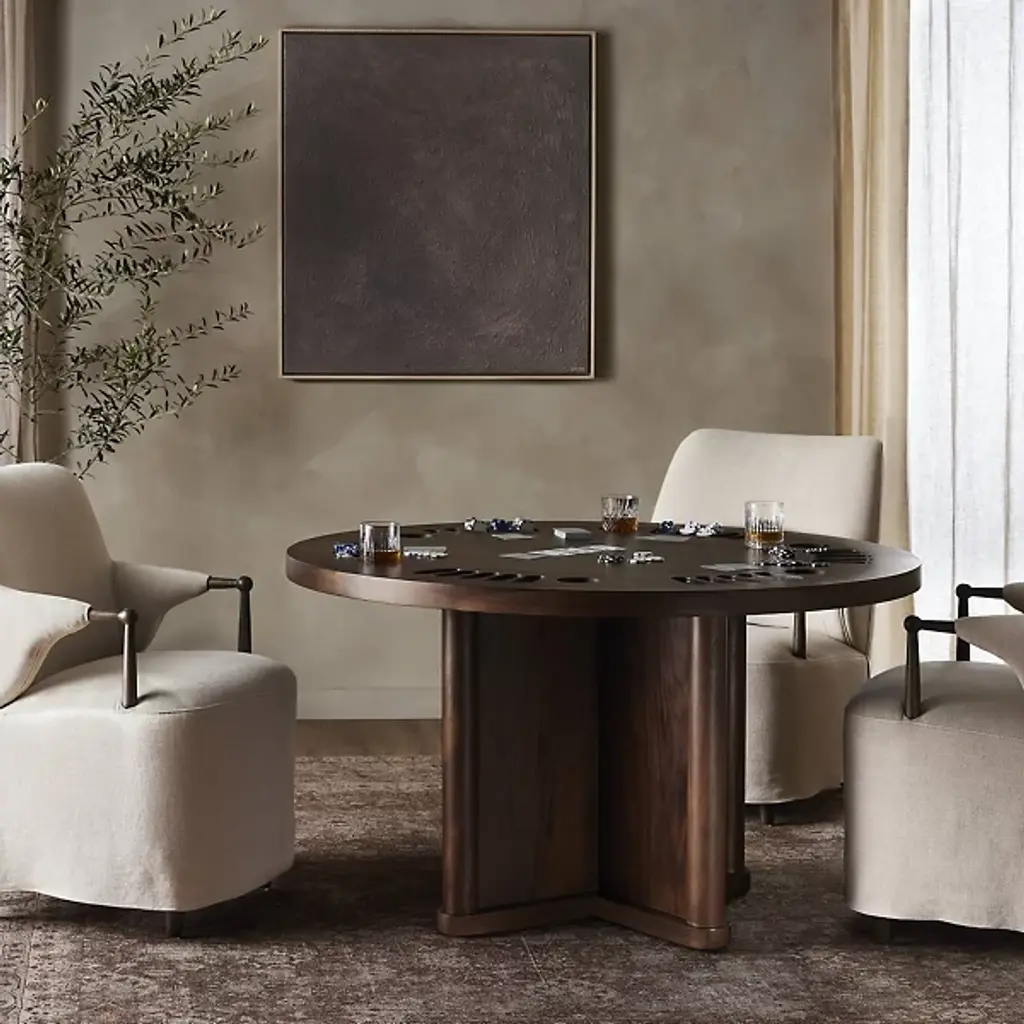 The Amber Lewis x Four Hands Mayfield Poker Table from Four Hands is fashioned with contemporary flair and boasts a sleek, sophisticated design with elegant intricacy. Made from thick walnut veneer, this table features a cross-shaped base with rounded cutouts for chips and other essentials in its disc-shaped top, giving a stylish and functional appeal to your gaming experience. The curving wood contours of the table create an elegant aesthetic, blending modern aesthetics with timeless craftsmanship. Whether for casual game nights or formal gatherings, the table impresses with its contemporary yet classic appeal.