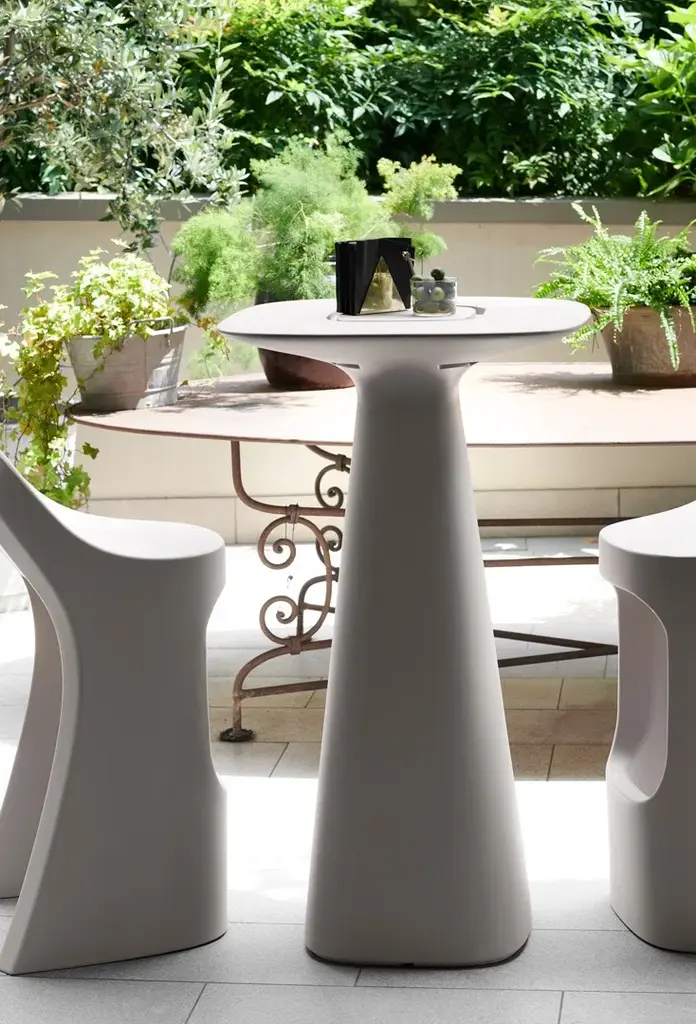 The conical shape characterizes the whole Amélie collection: Amélie Up is a high table and it has a conical stem. The cone is symbol of essentiality and stability: the shape is ideal to create a perfect element for contract projects, events and it could be matched with Amélie Sit Up high stool.Versions:- standard- lacquered- with light E27 - 1 x 15W- LED: RGBW LED module with rechargeable battery
