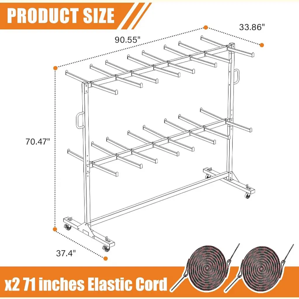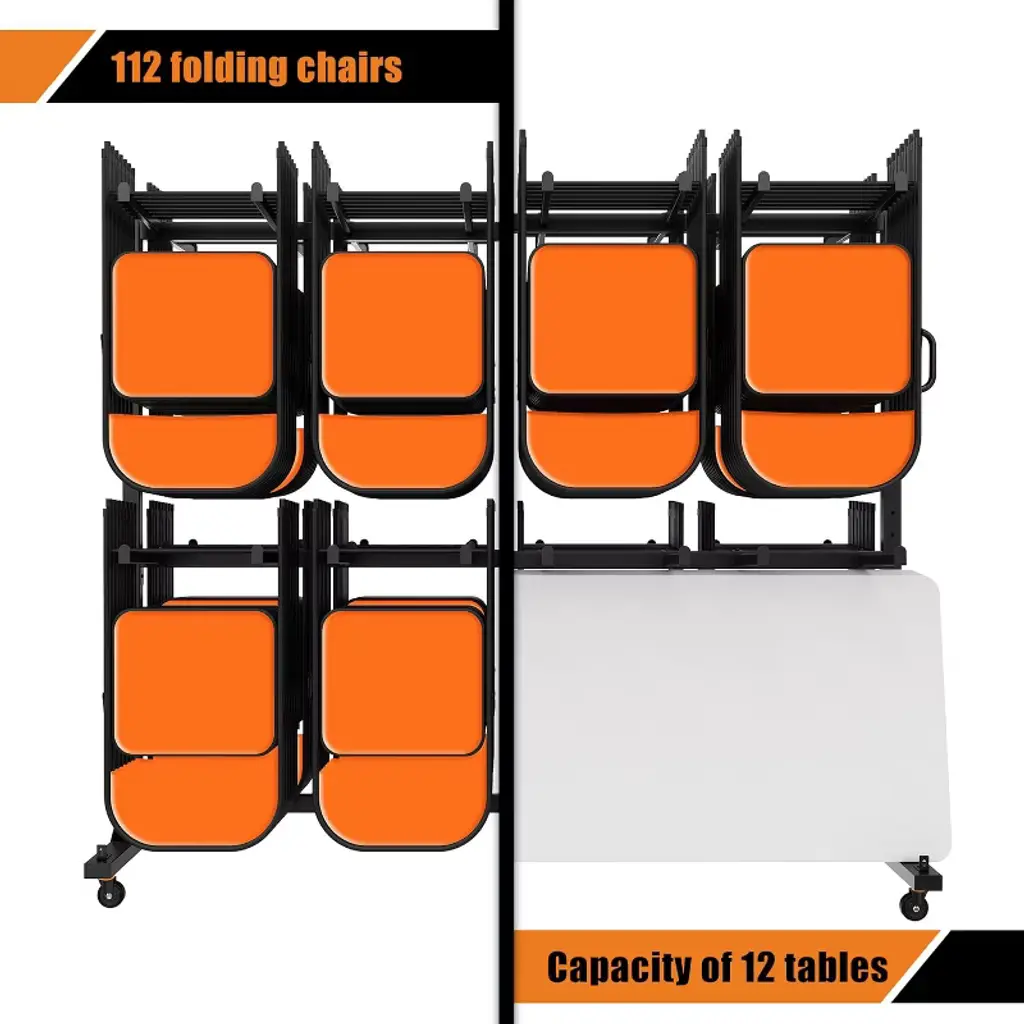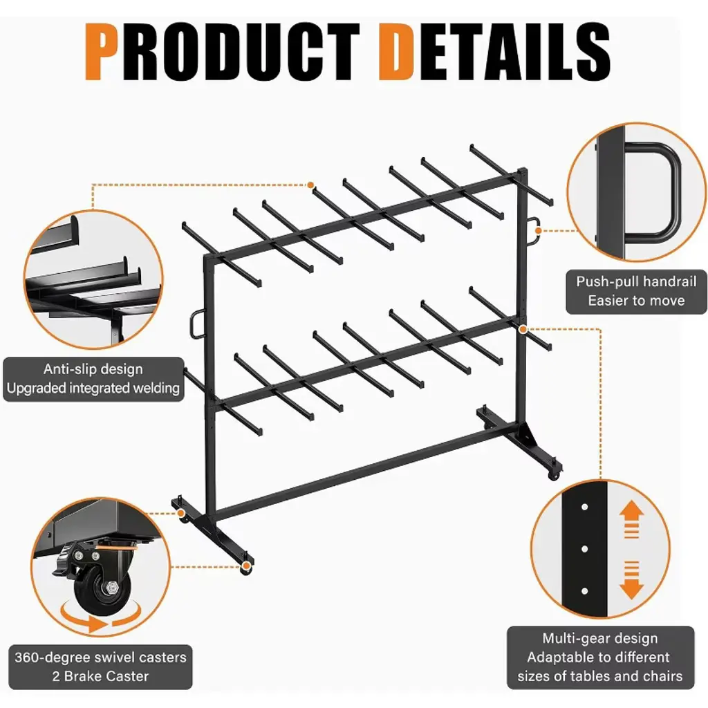 This folding chair storage rack is designed for durability and stability, with reinforced crossbars and triangular support plates to handle up to 1250 pounds. Its high capacity accommodates up to 112 chairs or a combination of chairs and tables, with adjustable height settings to fit different sizes. Equipped with four smooth-gliding PU wheels, two of which have brakes, the rack ensures easy maneuverability and stability, making it ideal for events like weddings, meetings, or church gatherings. The included Oxford fabric dust cover keeps the rack clean, while elastic cords prevent movement when not in use. Assembly is quick and easy, with all necessary hardware and instructions included. The rack can be set up in just 20 minutes, and we’re always available for any support you may need.