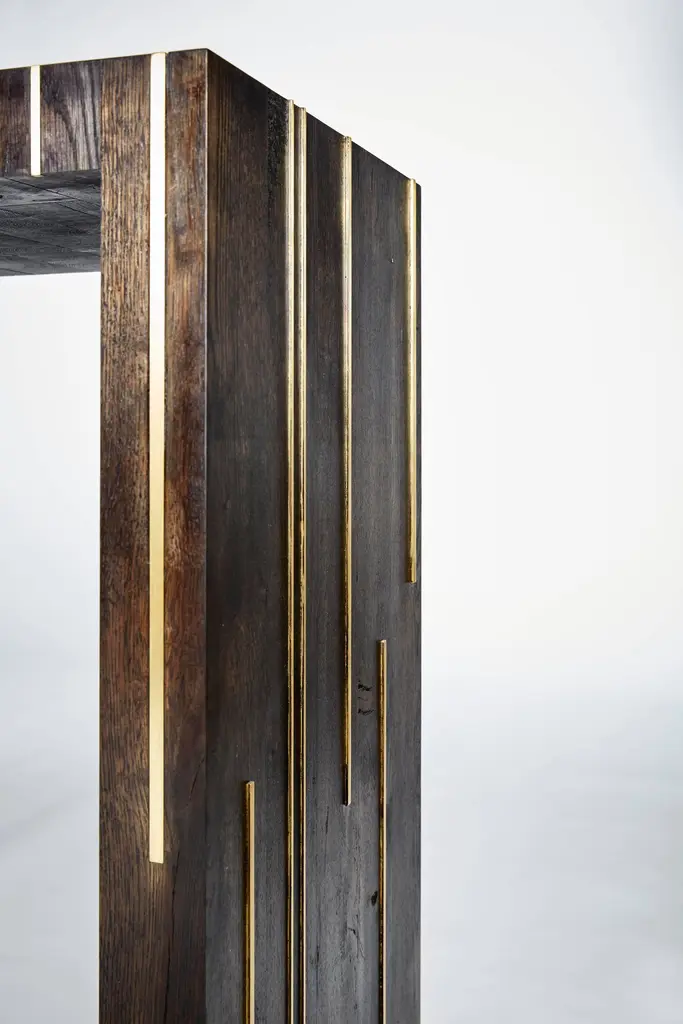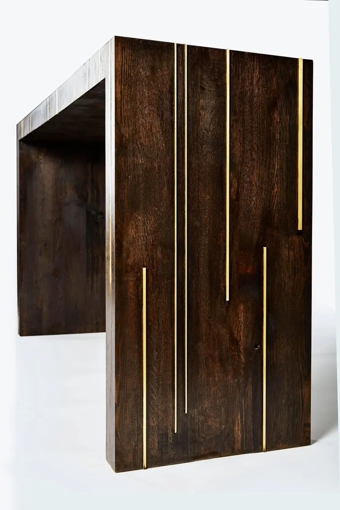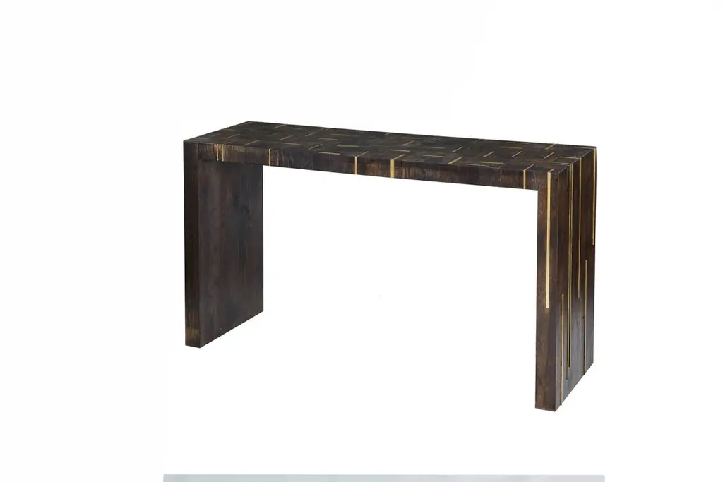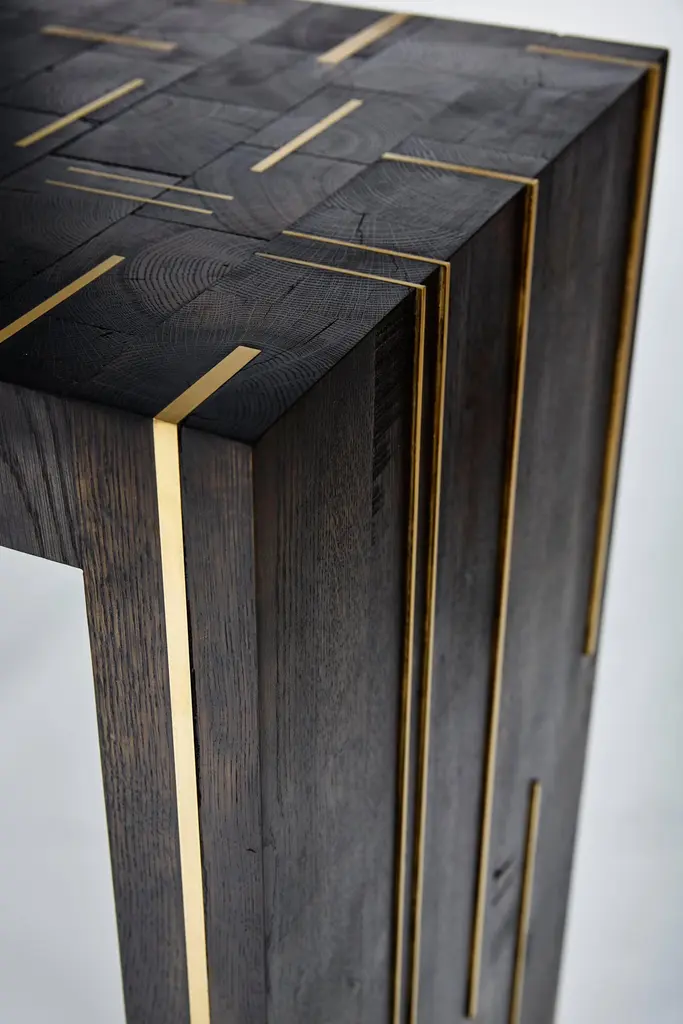 Amuneal’s modern butcher block console table is constructed from white oak endgrain cuts and solid bronze inlays. The finish on these handmade tables is highlighted by wire-brushing and burning the reclaimed endgrain assemblies, once fabricated, making the final finish on each table truly one-of-a-kind. The inlaid brushed bronze pieces are hand-set into each table creating unique compositions and allowing for custom sizes. Each table is fully burnished and receives three coats of oil to seal and protect the surface while adding a deep luster to the surface of each table. The simple lines of the tables’ geometry are complemented by the longer bronze elements that project from the surface on each vertical leg. Each console table is handcrafted in our Philadelphia furniture studio.