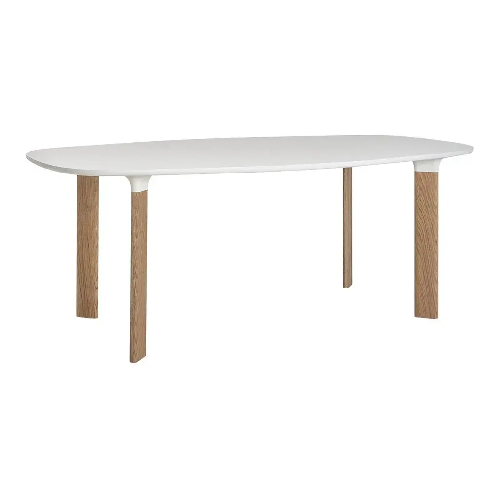 Analog is not a square, not a circle, not an oval – it is a new form that takes the best from the three classic shapes and brings them together in a new, organic form. There is no hierarchy, just a beautiful platform for conversations which is a perfect match for modern relationships among family members, friends and colleagues. The Analog table comes in 3 sizes with a table top in white laminate, oak or walnut veneer. The base consists of 4 legs made of solid wood in the following finishes: black coloured oak, oak or walnut. The legs are attached to the table top with a 'trumpet' in either white or black coated aluminum. The underside of the table top is lacquered in colours matching the trumpet.
