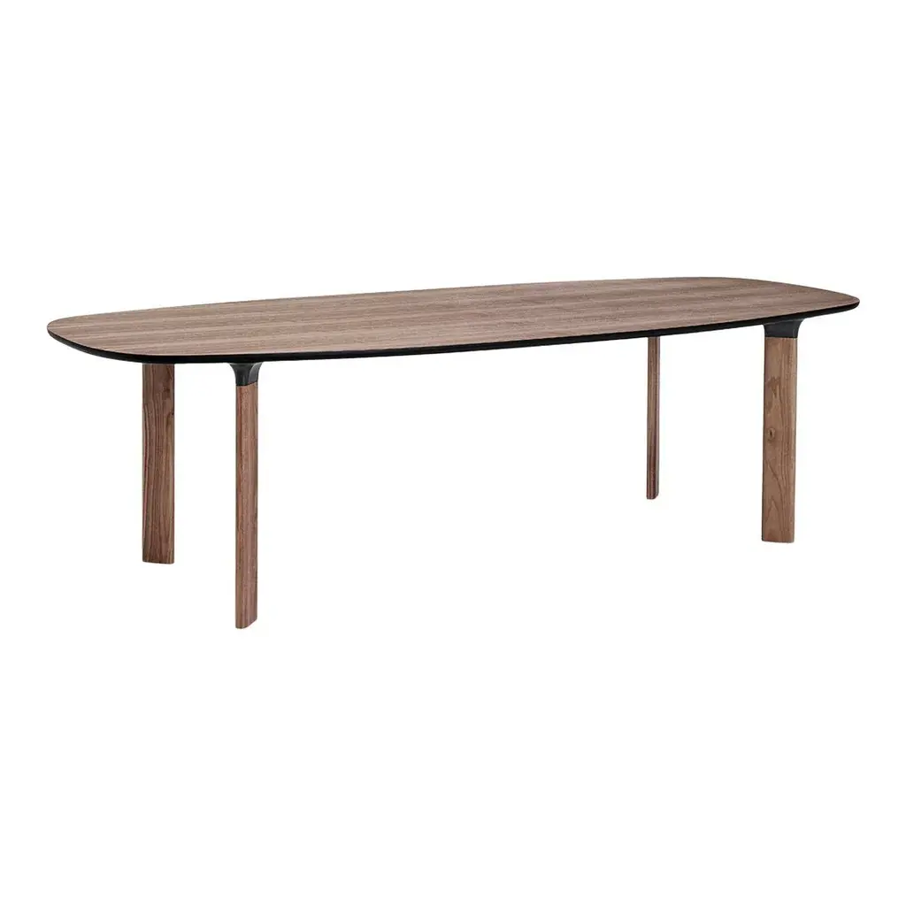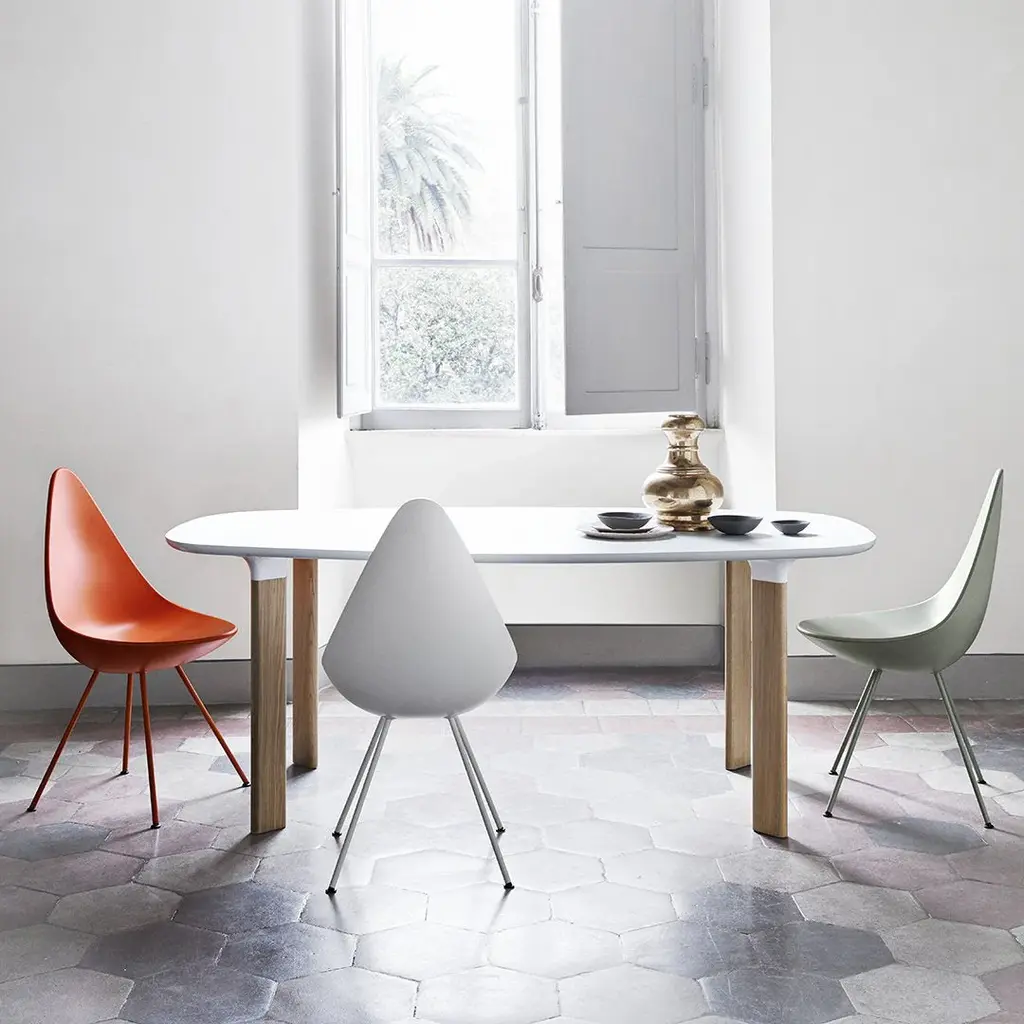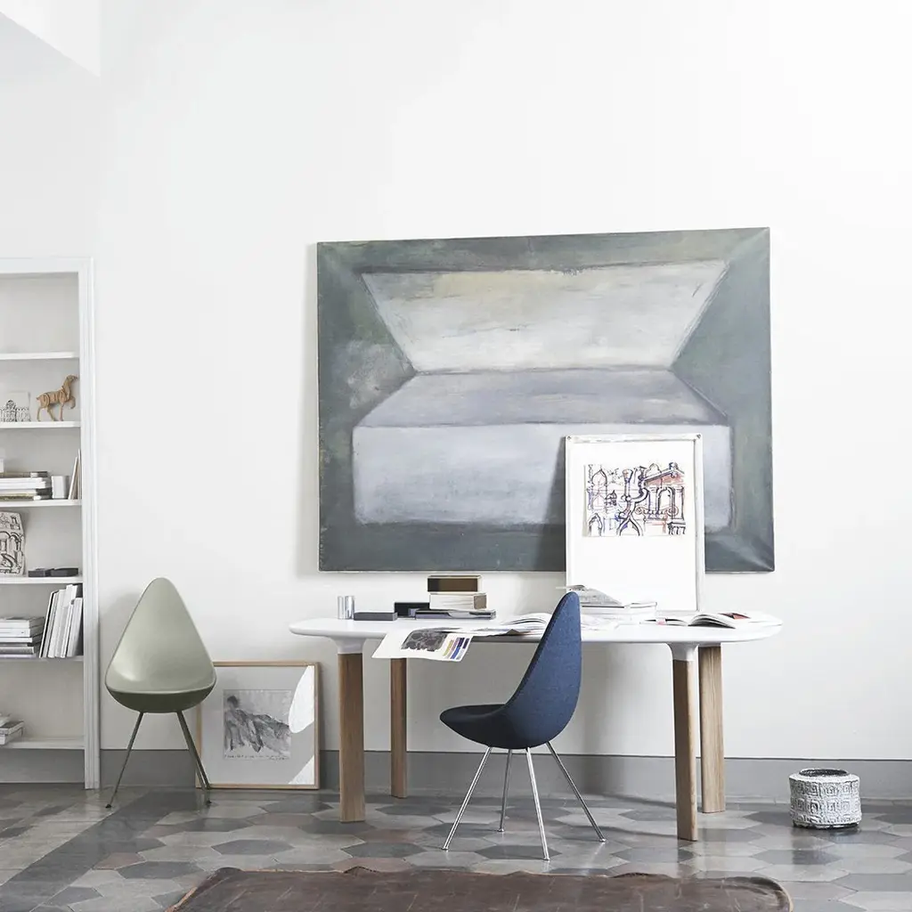 Analog is not a square, not a circle, not an oval – it is a new form that takes the best from the three classic shapes and brings them together in a new, organic form. There is no hierarchy, just a beautiful platform for conversations which is a perfect match for modern relationships among family members, friends and colleagues. The Analog table comes in 3 sizes with a table top in white laminate, oak or walnut veneer. The base consists of 4 legs made of solid wood in the following finishes: black coloured oak, oak or walnut. The legs are attached to the table top with a 'trumpet' in either white or black coated aluminum. The underside of the table top is lacquered in colours matching the trumpet.