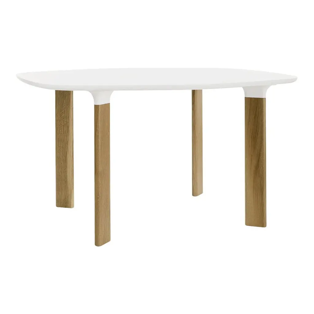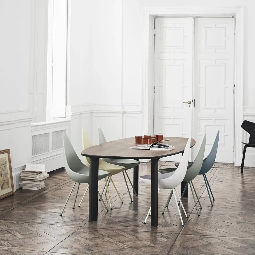 Analog is not a square, not a circle, not an oval – it is a new form that takes the best from the three classic shapes and brings them together in a new, organic form. There is no hierarchy, just a beautiful platform for conversations which is a perfect match for modern relationships among family members, friends and colleagues. The Analog table comes in 3 sizes with a table top in white laminate, oak or walnut veneer. The base consists of 4 legs made of solid wood in the following finishes: black coloured oak, oak or walnut. The legs are attached to the table top with a 'trumpet' in either white or black coated aluminum. The underside of the table top is lacquered in colours matching the trumpet.