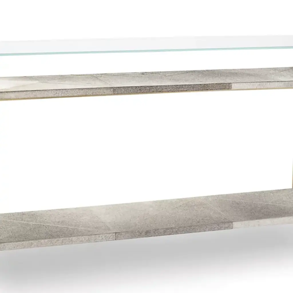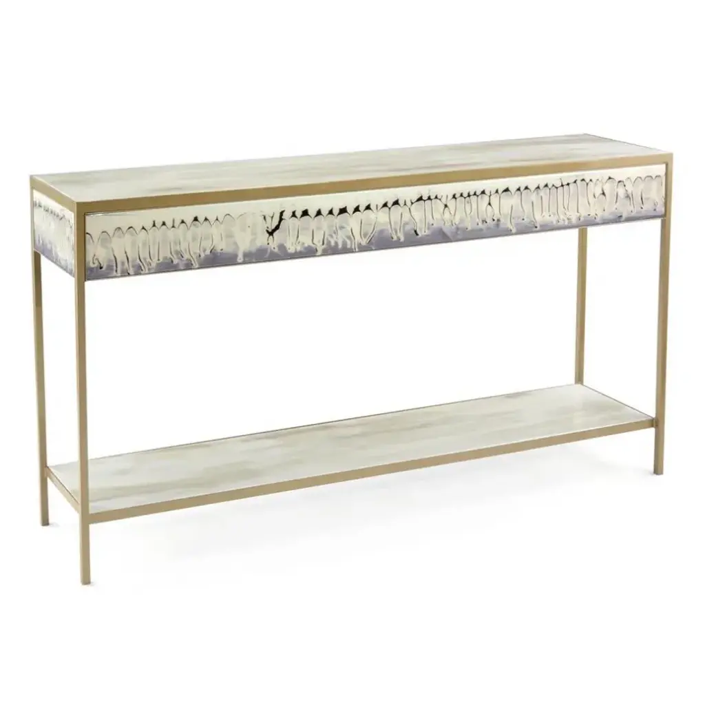 The Andres Hair on Hide Console Table from Regina Andrew masterfully blends rustic, modern, and contemporary styles through its handcrafted natural hair on hide shelves nestled into a sleek metal frame. This console table combines a whimsical design with luxurious surfaces, ideal for enhancing natural elegance in your living room, entryway, or home office. Its versatile aesthetic and quality craftsmanship make it a memorable addition to any space.