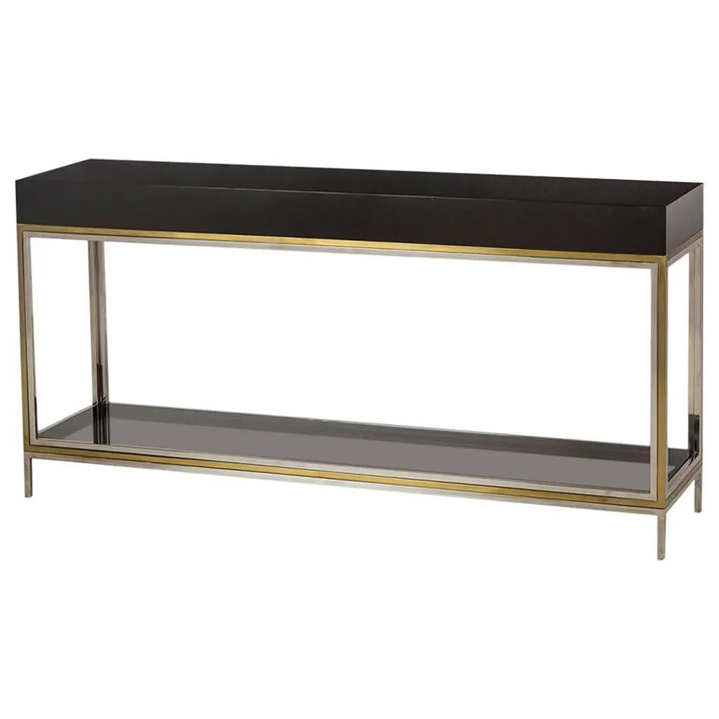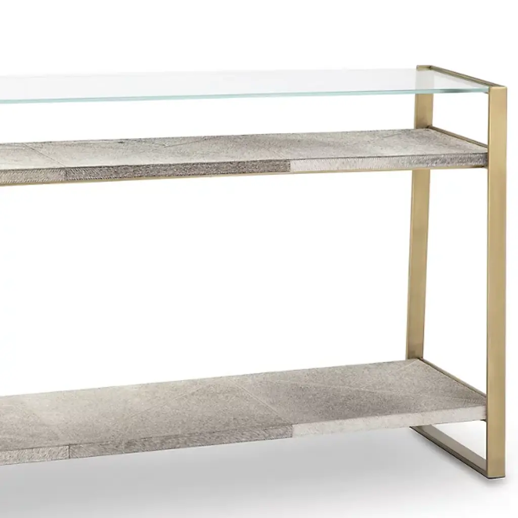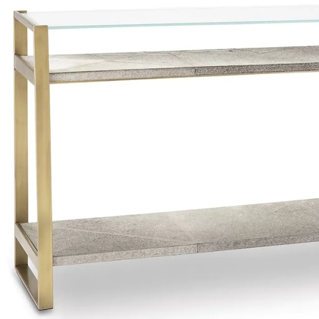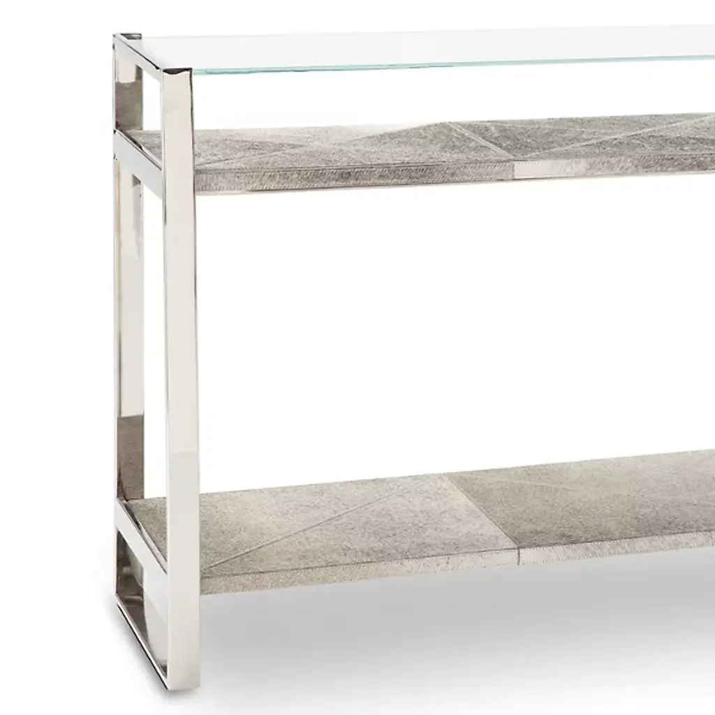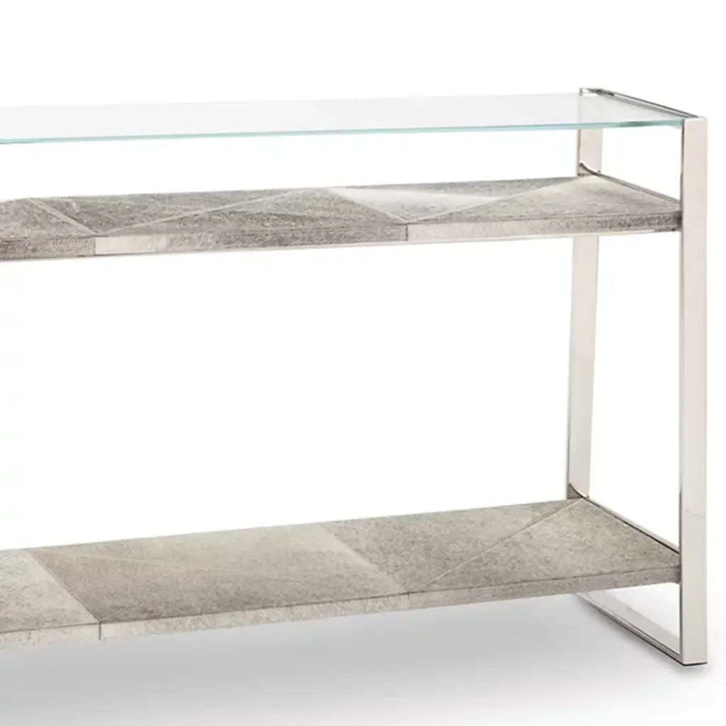 The Andres Hair on Hide Console Table from Regina Andrew masterfully blends rustic, modern, and contemporary styles through its handcrafted natural hair on hide shelves nestled into a sleek metal frame. This console table combines a whimsical design with luxurious surfaces, ideal for enhancing natural elegance in your living room, entryway, or home office. Its versatile aesthetic and quality craftsmanship make it a memorable addition to any space.