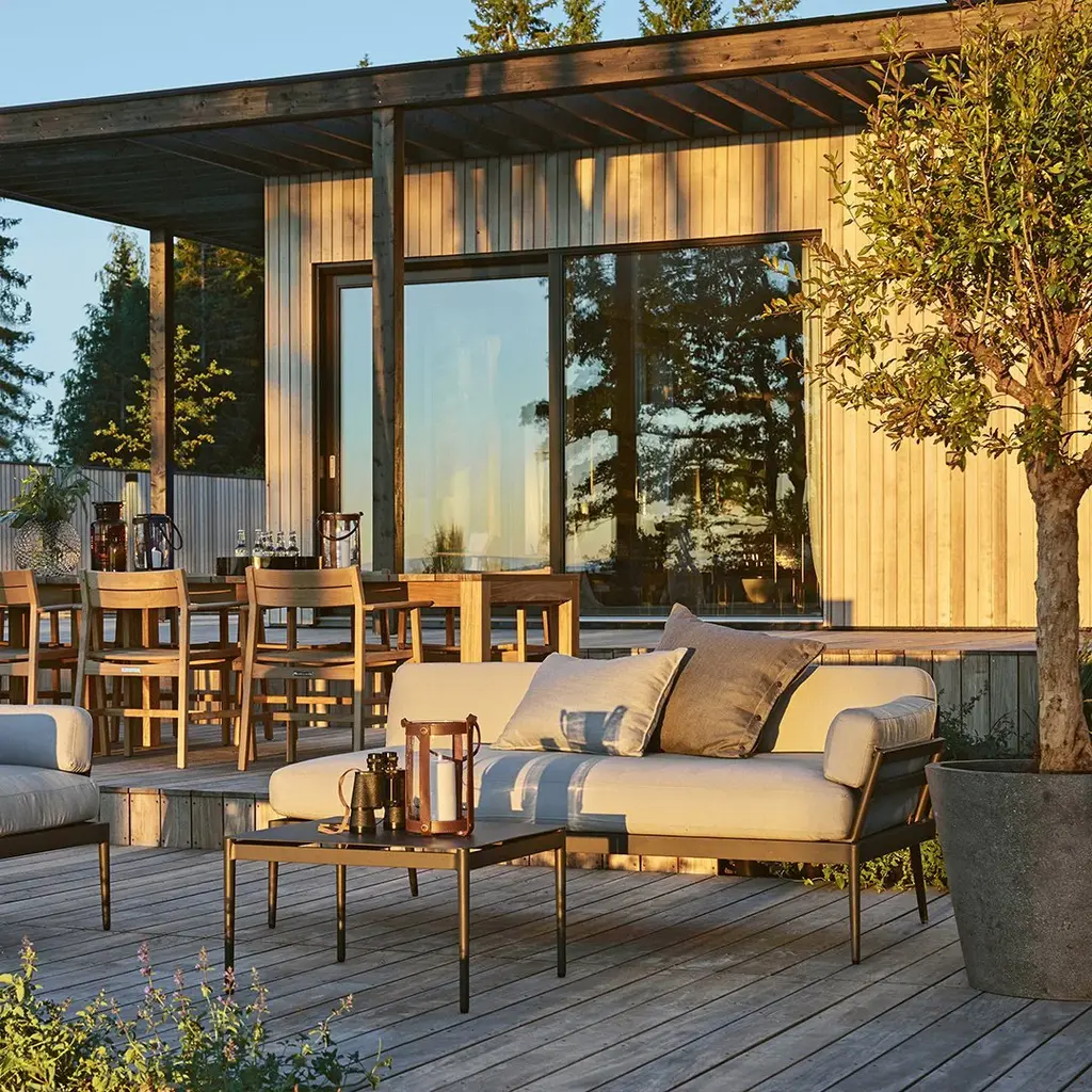 A range of modular lounge furniture, made of aluminum, with cushions in Sunbrella fabric covered outdoor high quality foam filling. Or, put another way, a range that looks good and is also maintenance-free.