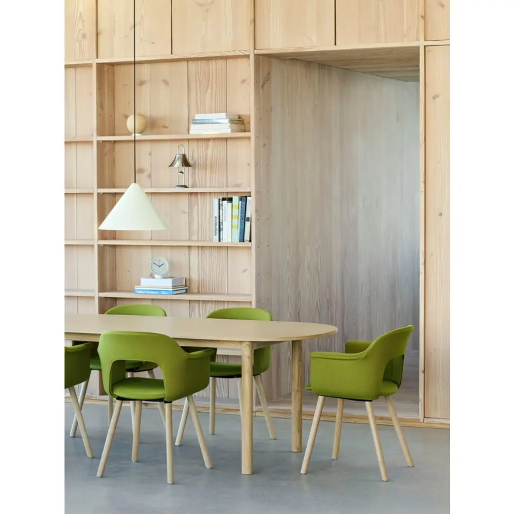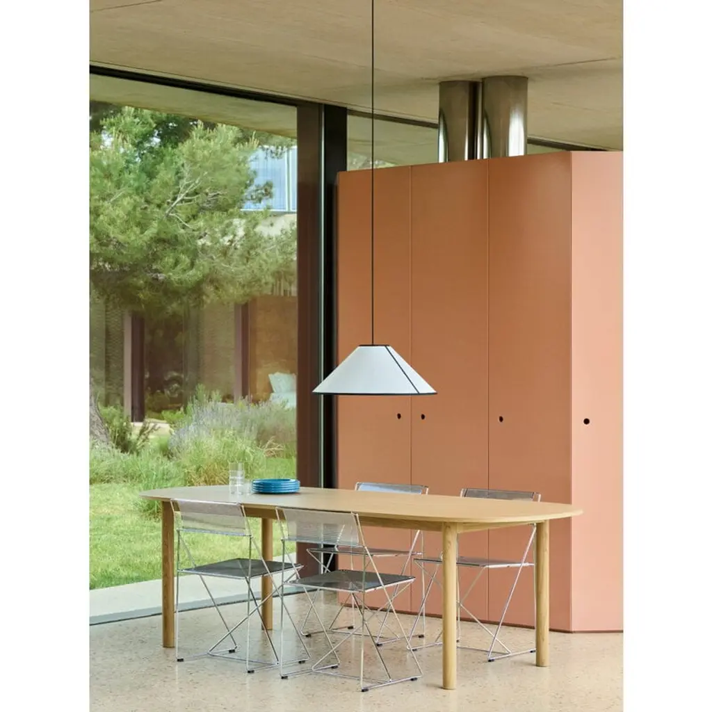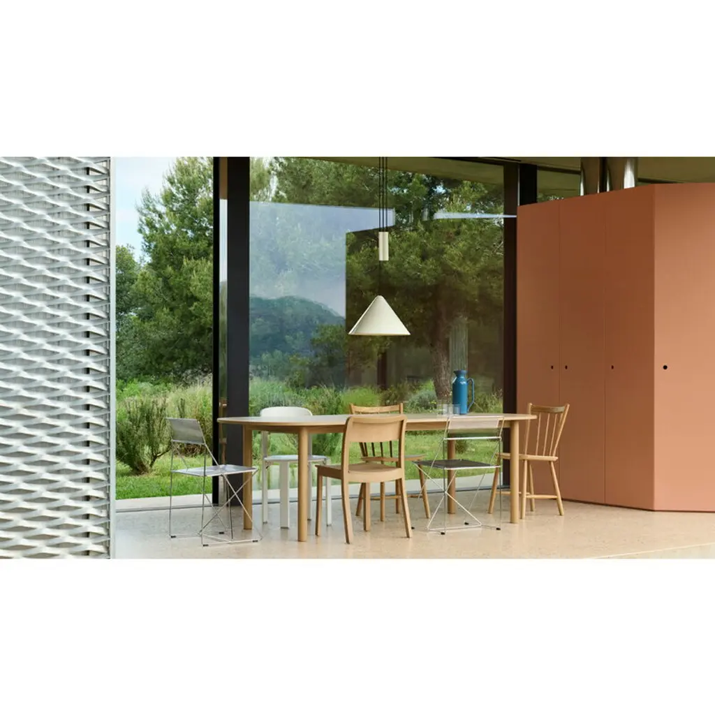 HAY’s Annex table brings a calm, structured rhythm and clean, architectural lines to any space. Created by British designer John Tree, the sturdy four-legged table suits both home and restaurant use, and fits just as well in workspaces or offices. The tabletop is made of oak veneer with subtle wood grain patterns, while the softly rounded legs are made from solid oak. Versatility is at the heart of the Annex table collection, with carefully balanced proportions and a wide range of sizes, shapes and material options. Whether you’re after a round or rectangular table, a wood or metal frame, or a surface in veneer, laminate, linoleum or textile, there’s an Annex table to match your needs. The pared-back, friendly design of the tables pairs effortlessly with both classic and more contemporary seating.