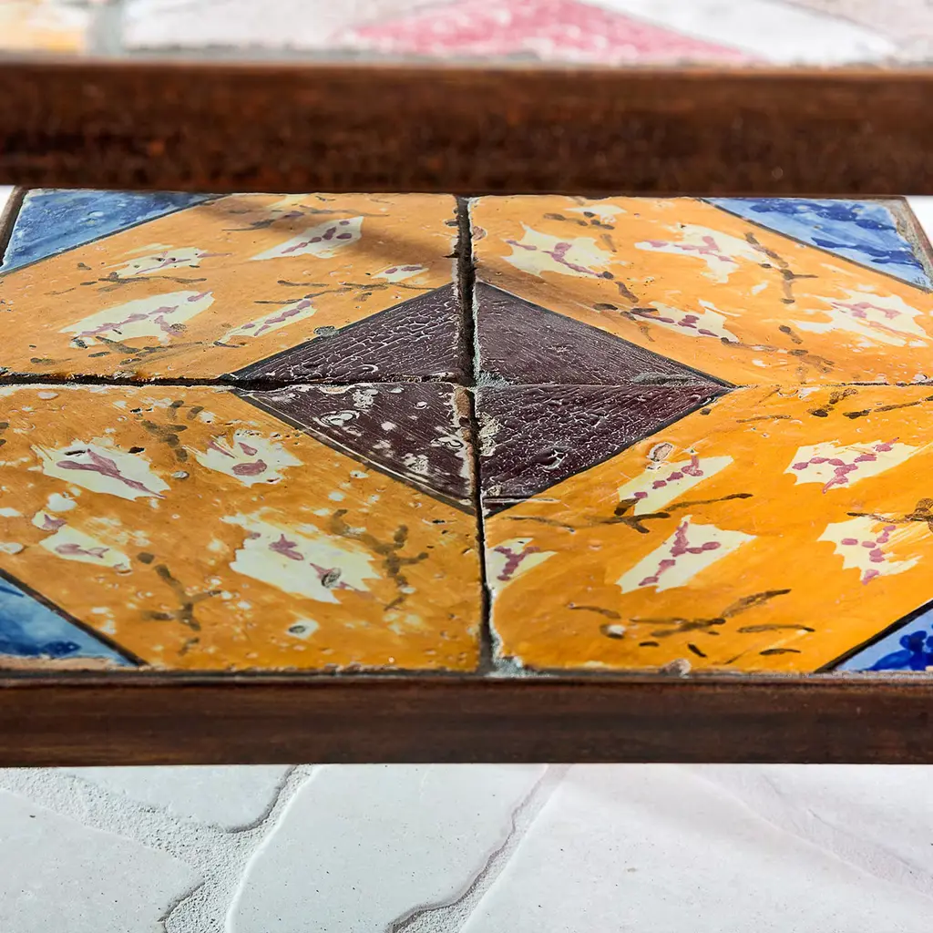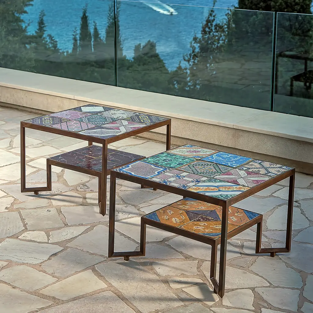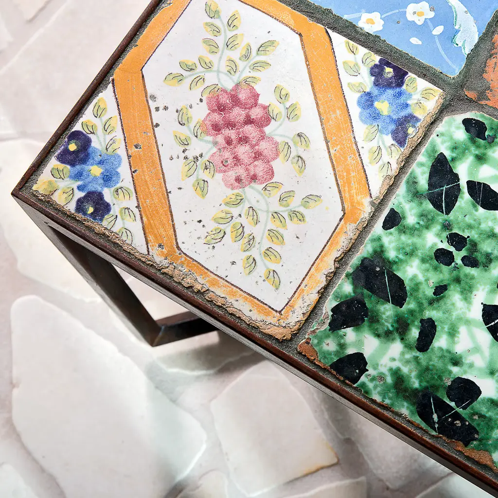 Part of the Spider Collection, due to the shape of its feet, this table by Neapolitan designer Francesco Della Femina features a rusted iron frame handcrafted by Italian artisans, and is protected with a varnish layer making it suitable for both indoor and outdoor use. Yet, the protagonists of this piece are the 13 precious hand-painted antique tiles with different colors and motifs, which were retrieved from an old ceramic workshop in Naples. Each tile is unique so every table is going to be slightly different from the one shown in the picture.