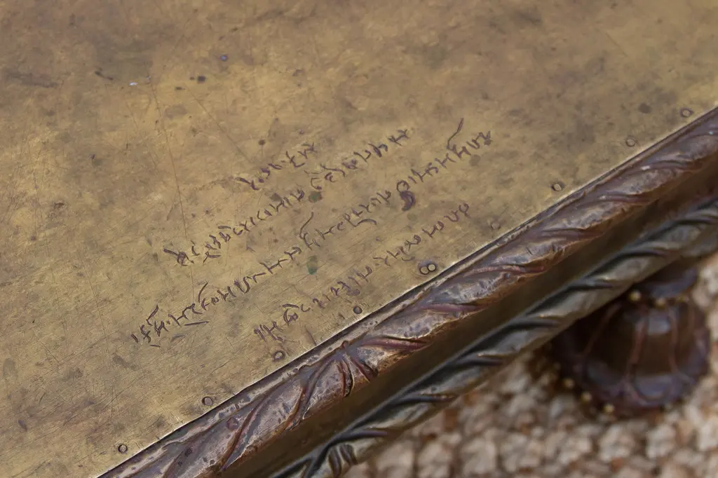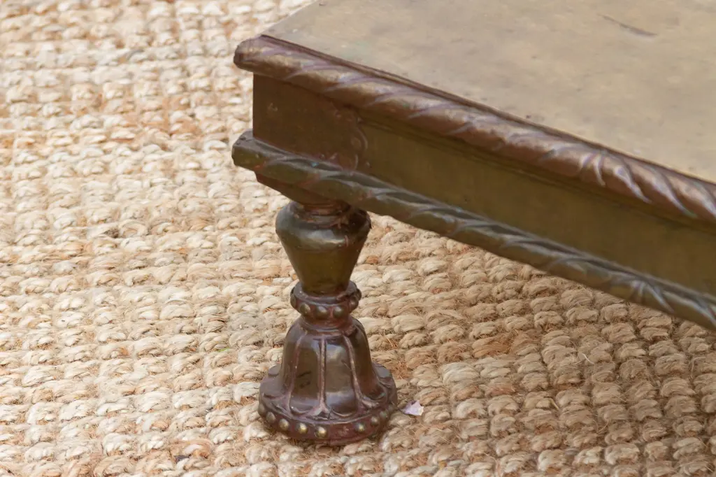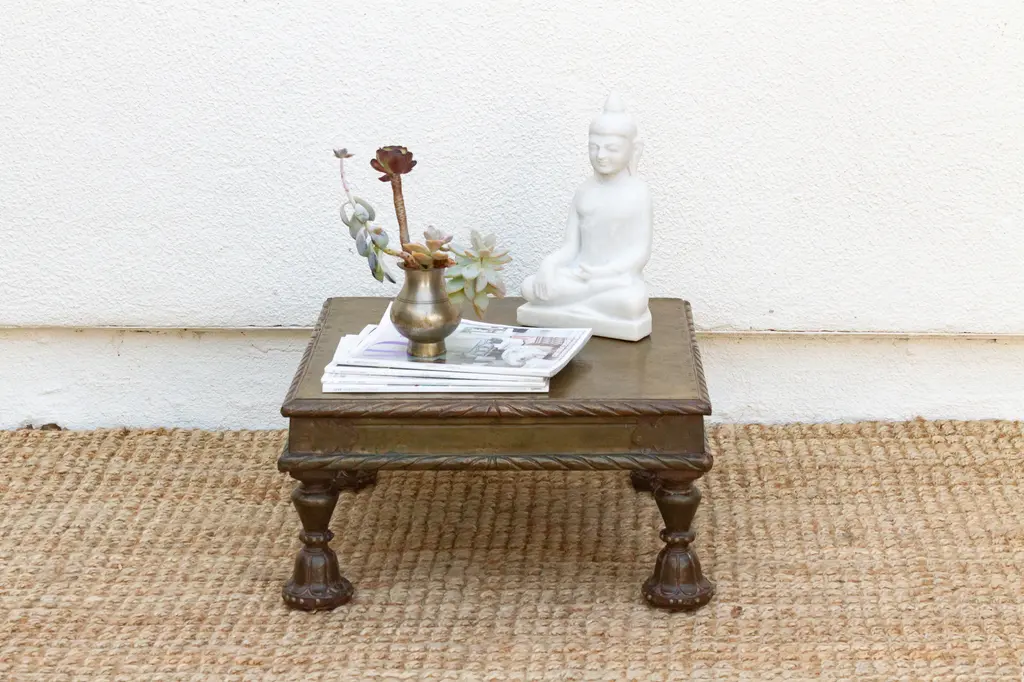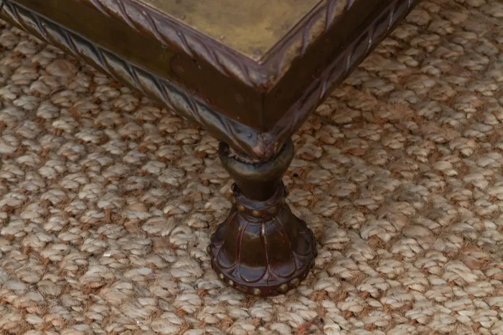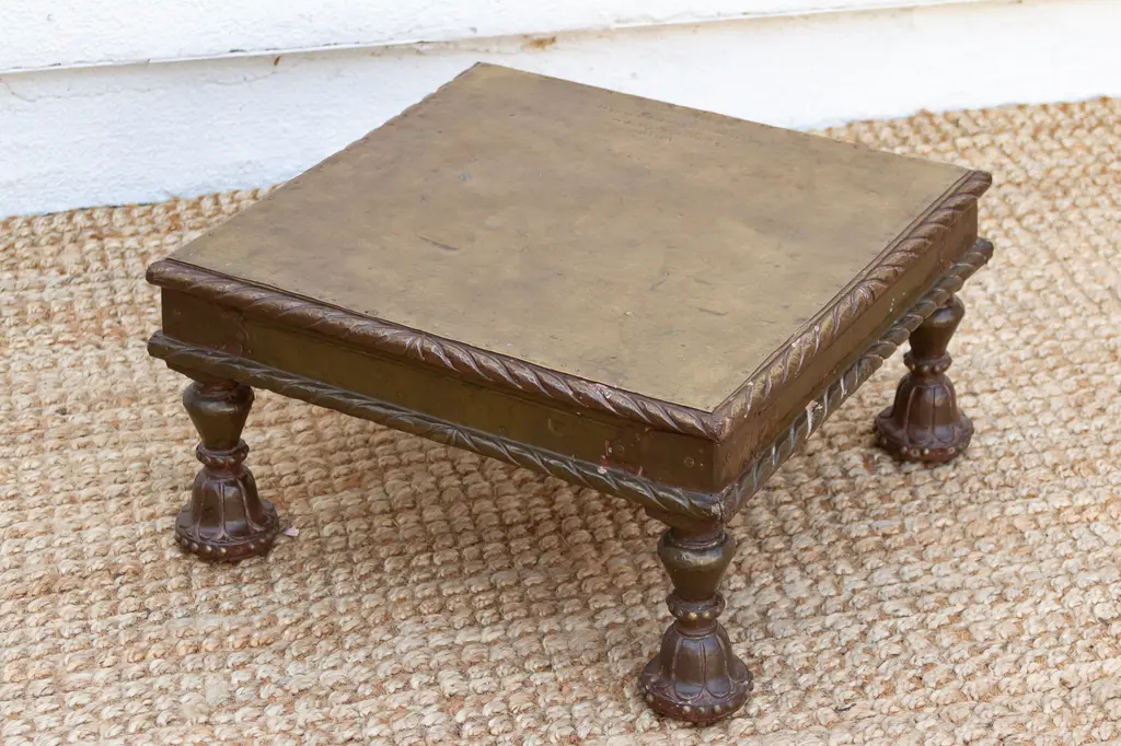 This vintage bajot table, once a cherished possession in an Indian home, exudes a captivating blend of artistry and history. Crafted from wood and completely encased in ornate brass laminate, it features four elaborately carved legs with decorative accents and a spacious square top, perfect for displaying treasures or serving tea. A beautifully embossed rope-like border adds a touch of sophistication, while the inscription on the tabletop hints at the table's rich past and the stories it holds.