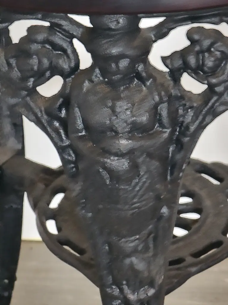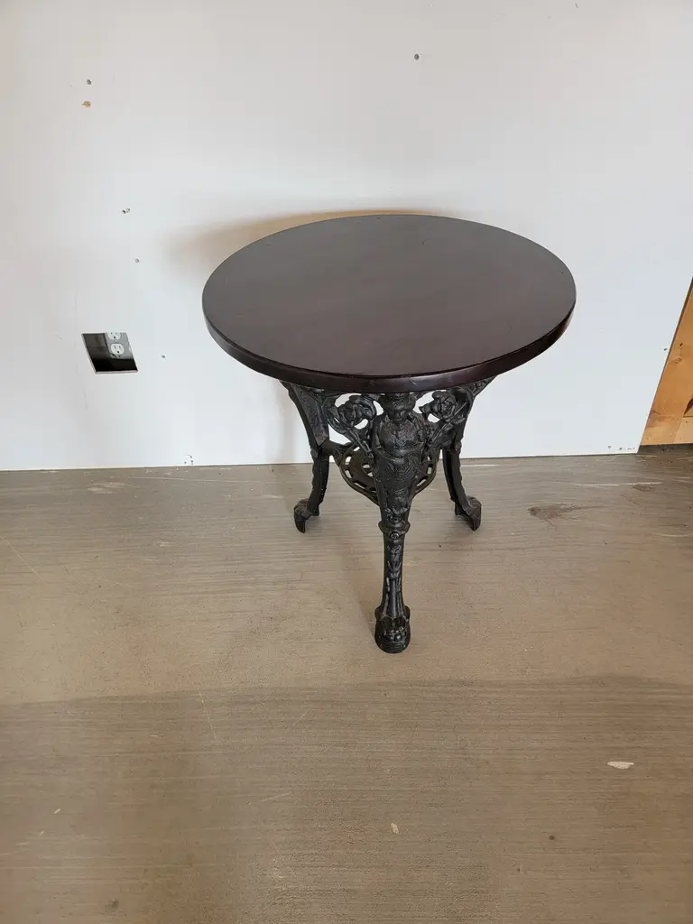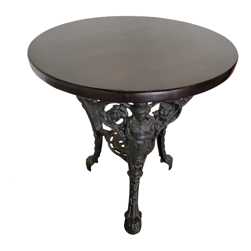 Antique Cast Iron English Pub Table With Thick Wood Top We found these pub tables in southern England. They are both beautifully restored. We particularly like the angel face on the legs. These tables are solid. We are pricing them individually. Measurements: 23.75" diameter x 27.25" high
