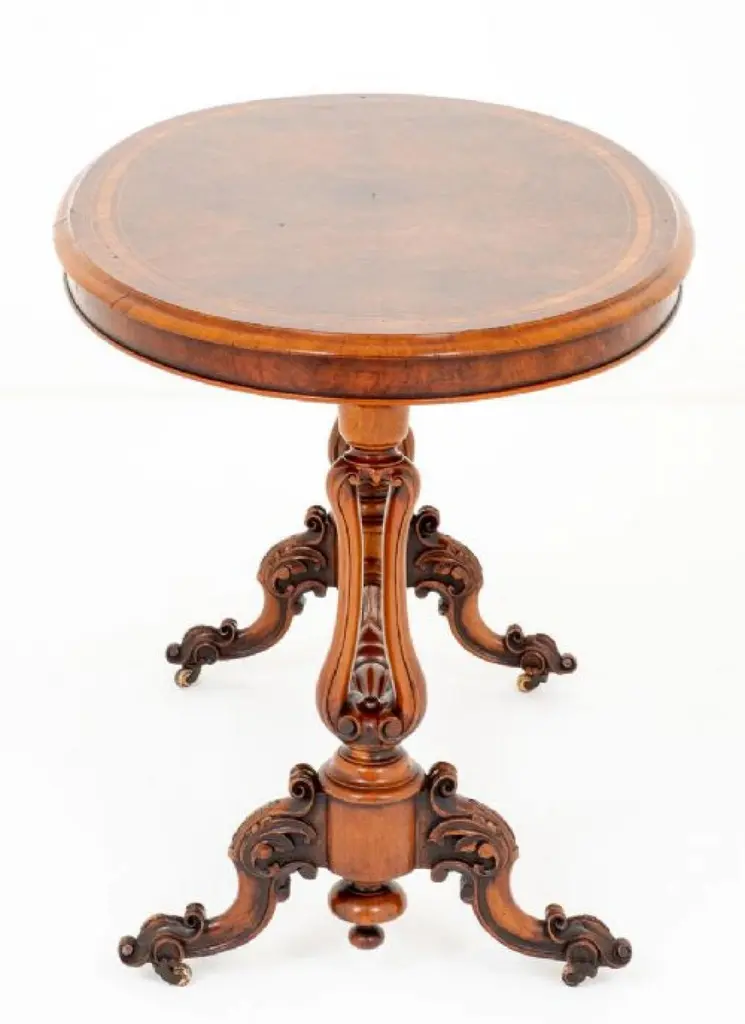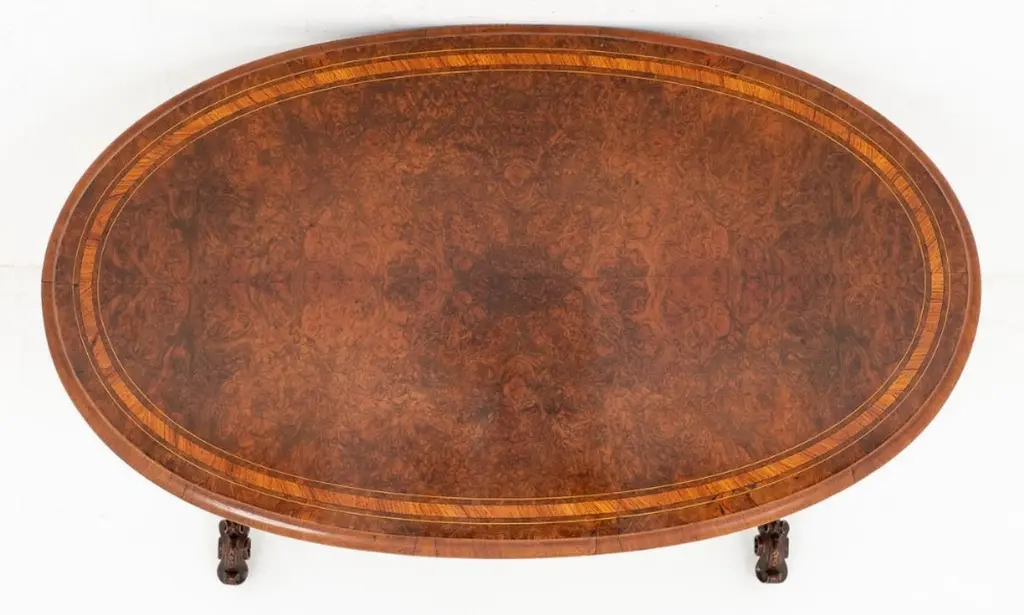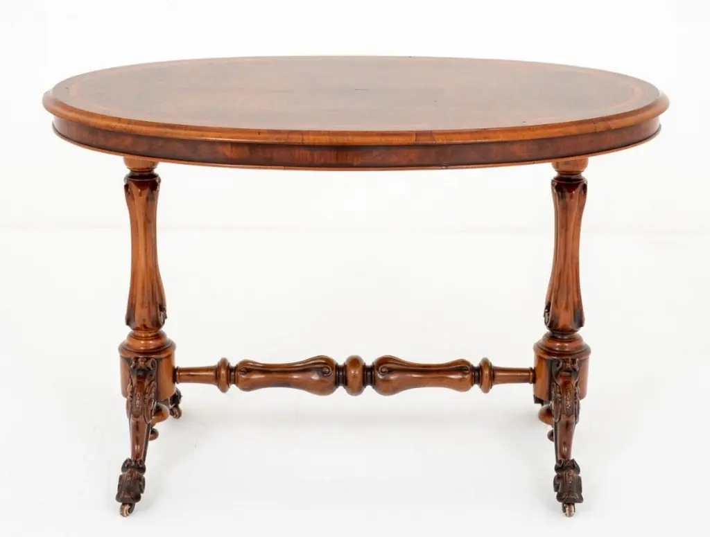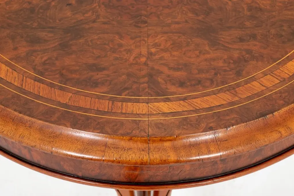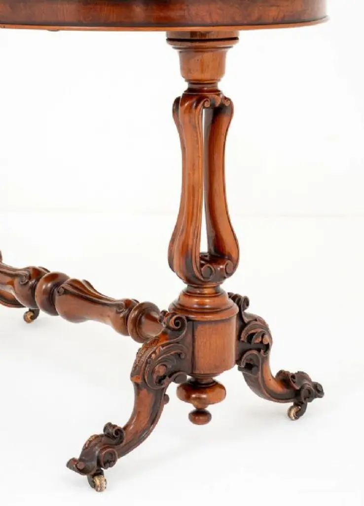 Very Pretty Victorian Burr Walnut Centre table.1860Raised upon shaped and carved legs with a turned and carved stretcher rails and carved supports.The top of the table with high quality Burr Walnut Veneers, satinwood crossbanding and Boxwood inlays.