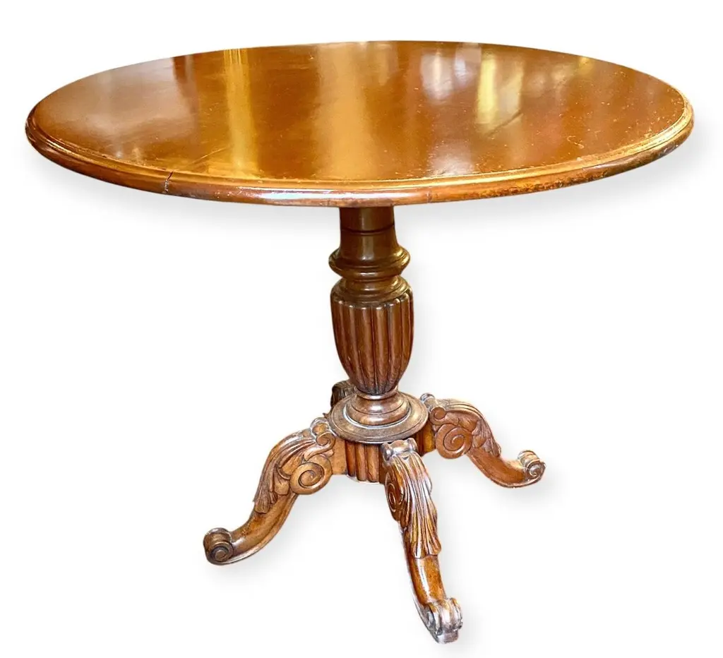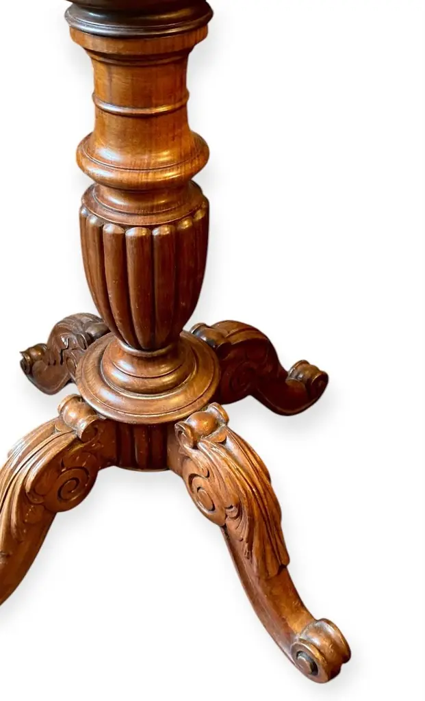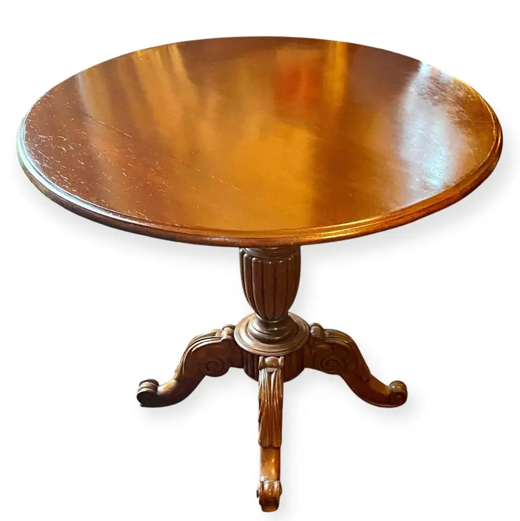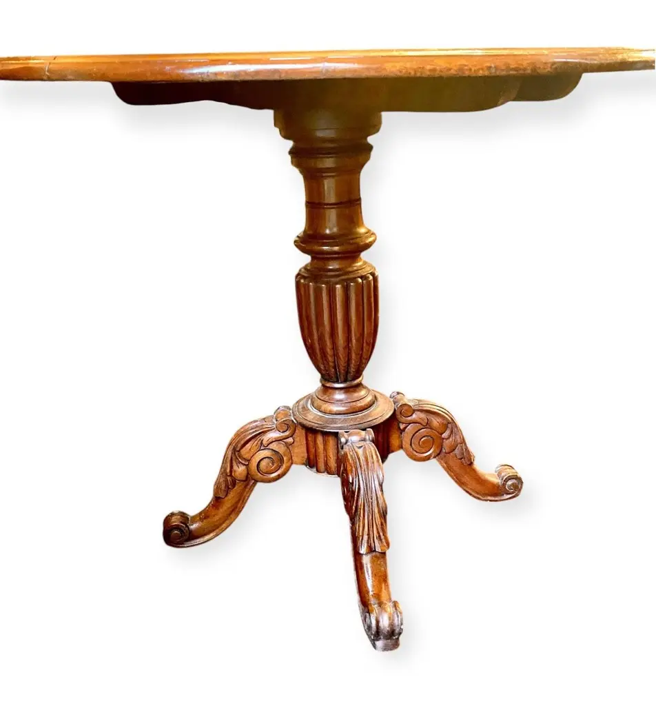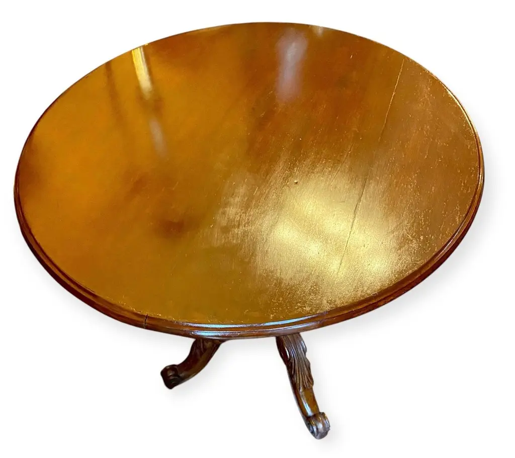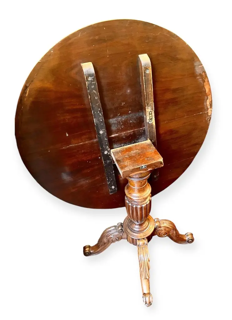 An antique 1860’s French rococo, mahogany and walnut tilt top serving table having a lovely hand carved four support base.