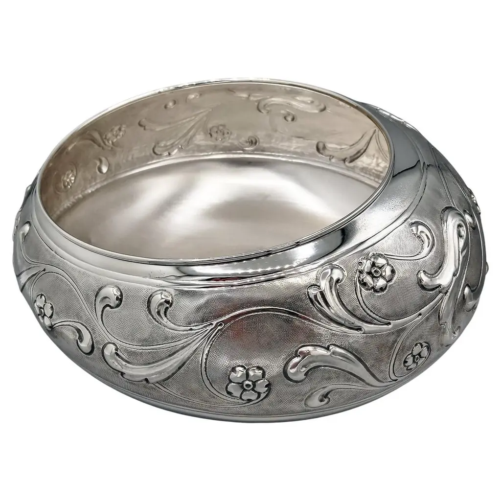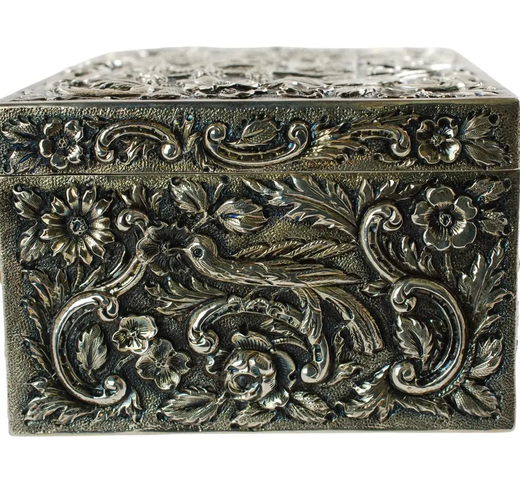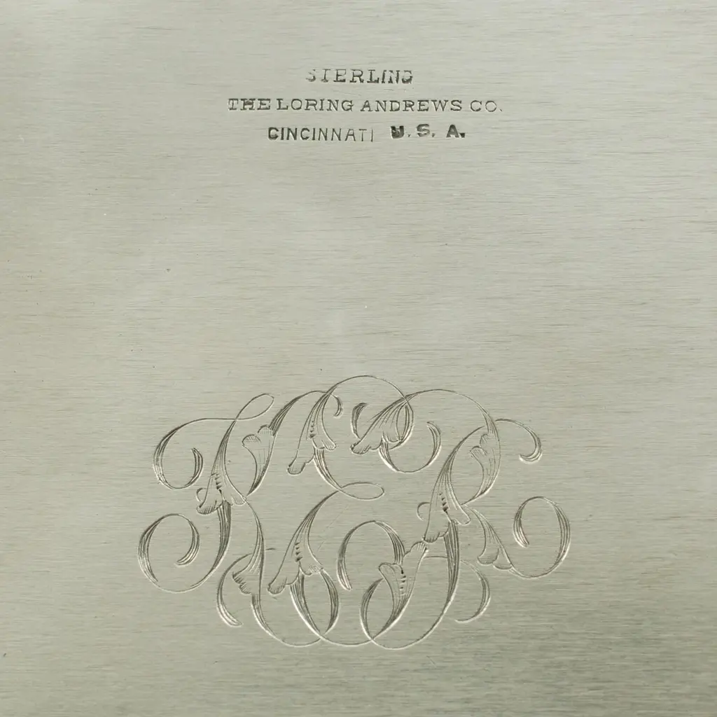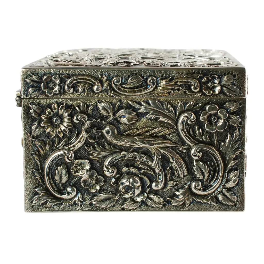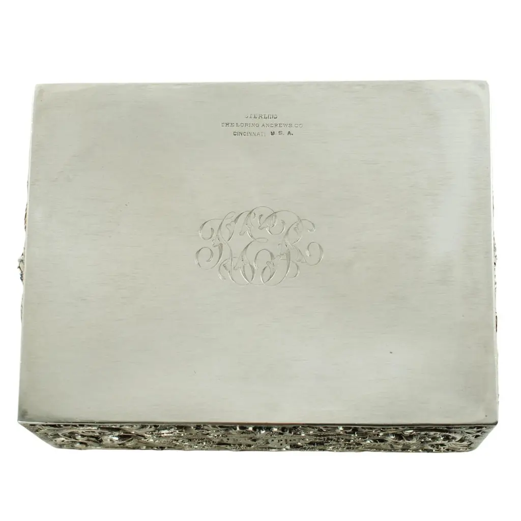 This antique Castle pattern sterling silver table box was made by The Loring Andrews Company of Cincinnati, Ohio. The hinged box is quite ornate and bears highly detailed all-over repoussé decoration featuring turreted castles on the lid, front, and back surrounded by Rococo-style floral motifs. The design includes large exotic birds on the left and right sides. The birds are depicted perched on Rococo-style C-scrolls set amongst a variety of flowers and leaves. The underside bears a beautifully executed foliate-inspired monogram that has been hand-engraved in script. The box is in very good condition with no repairs. There are manufacturer's marks impressed to the underside reading "Sterling The Loring Andrews Co. Cincinnati U.S.A.". As an antique item, the box shows signs of age including tarnish and light, shallow dents/general shelf wear to the underside noted for accuracy. The piece measures 5" wide, 3.75" deep, and stands 2.5" tall. It weighs 395 grams.This exquisite Castle pattern sterling table box displays beautifully and is a wonderful example of Loring Andrews' artistic creativity and exacting craftsmanship. An ideal addition to your decor, whether used for storing small treasures or showcased as a decorative object.