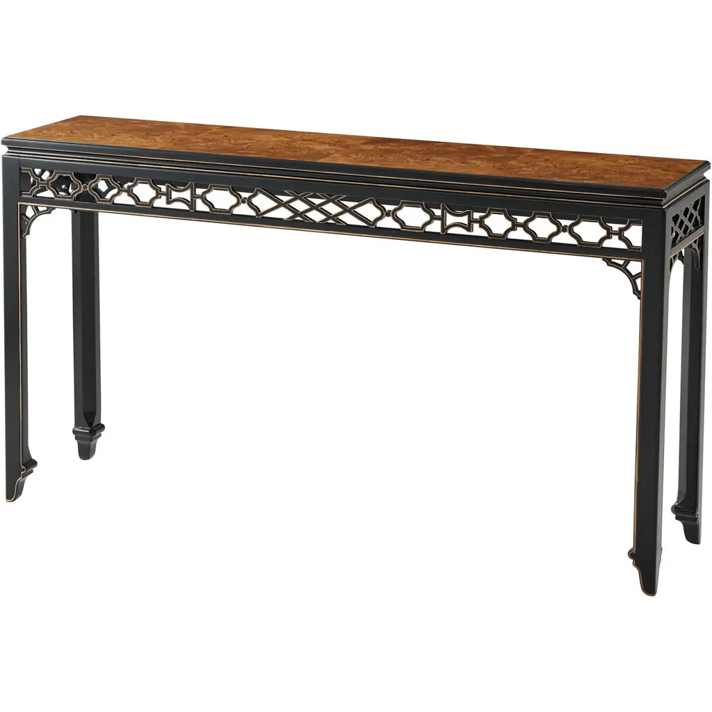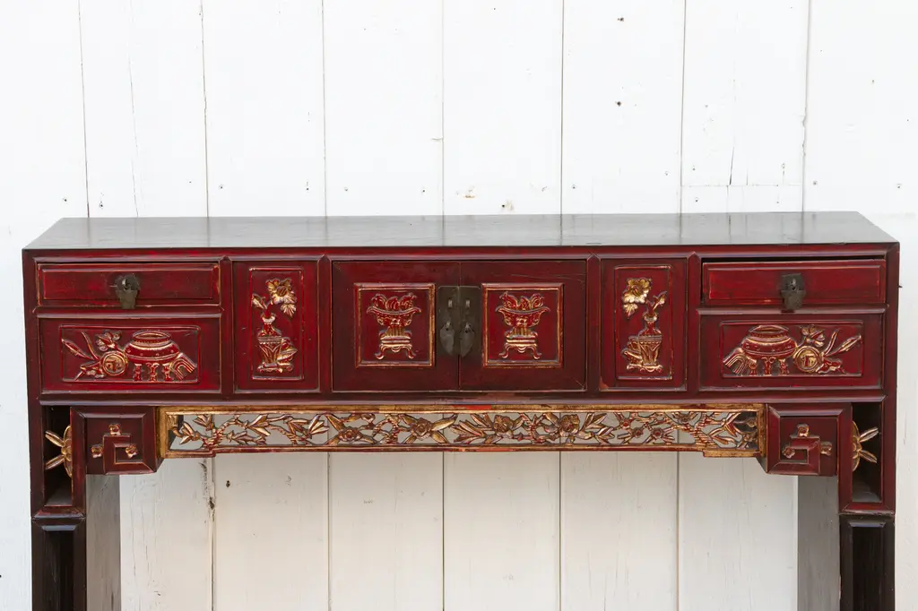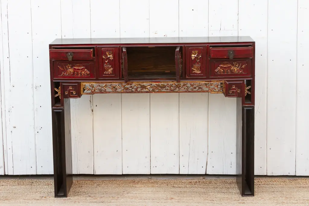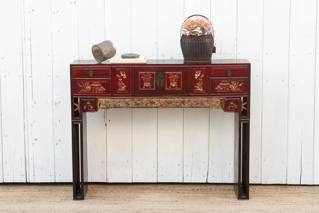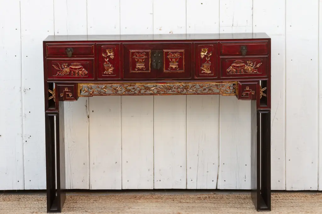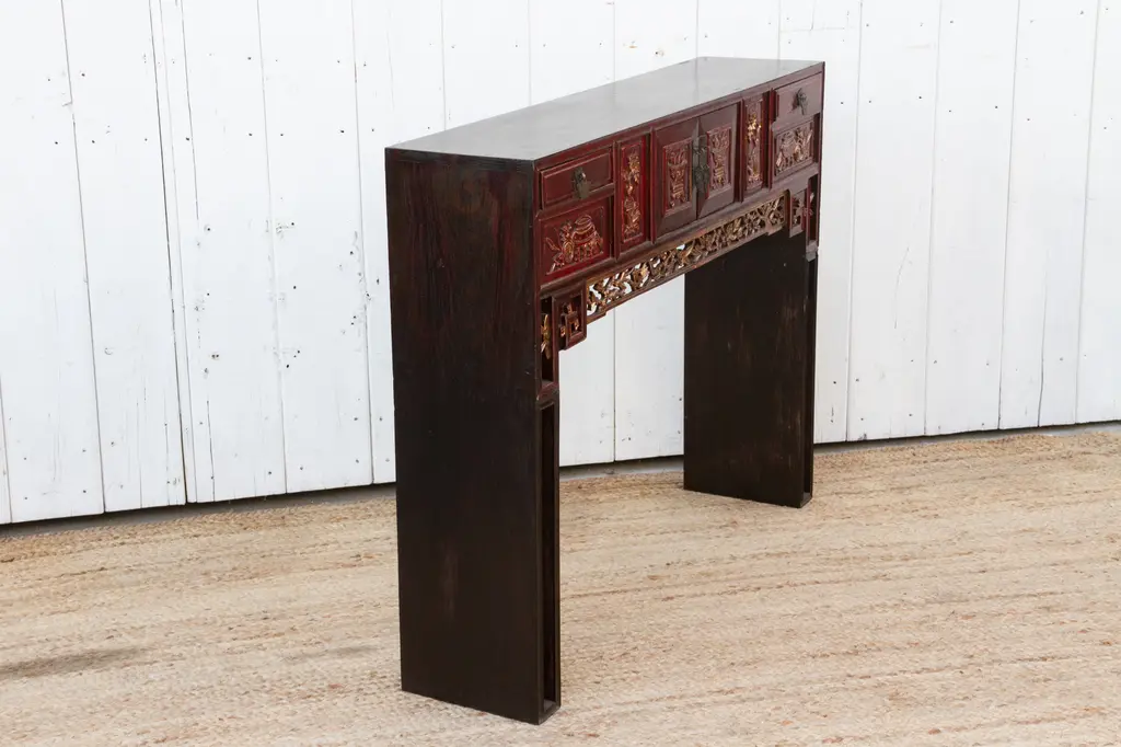 This original Kang table hails from Shanxi province and dates back to the late 19th century. Originally designed for placement on either side of the kang—a raised stone platform utilized as a bed in affluent Chinese households—this Kang table has been raised and repurposed into a one-of-a-kind slim console. Retaining its original lacquer and paintwork, it stands as a functional work of art, showcasing exceptional Chinese craftsmanship.