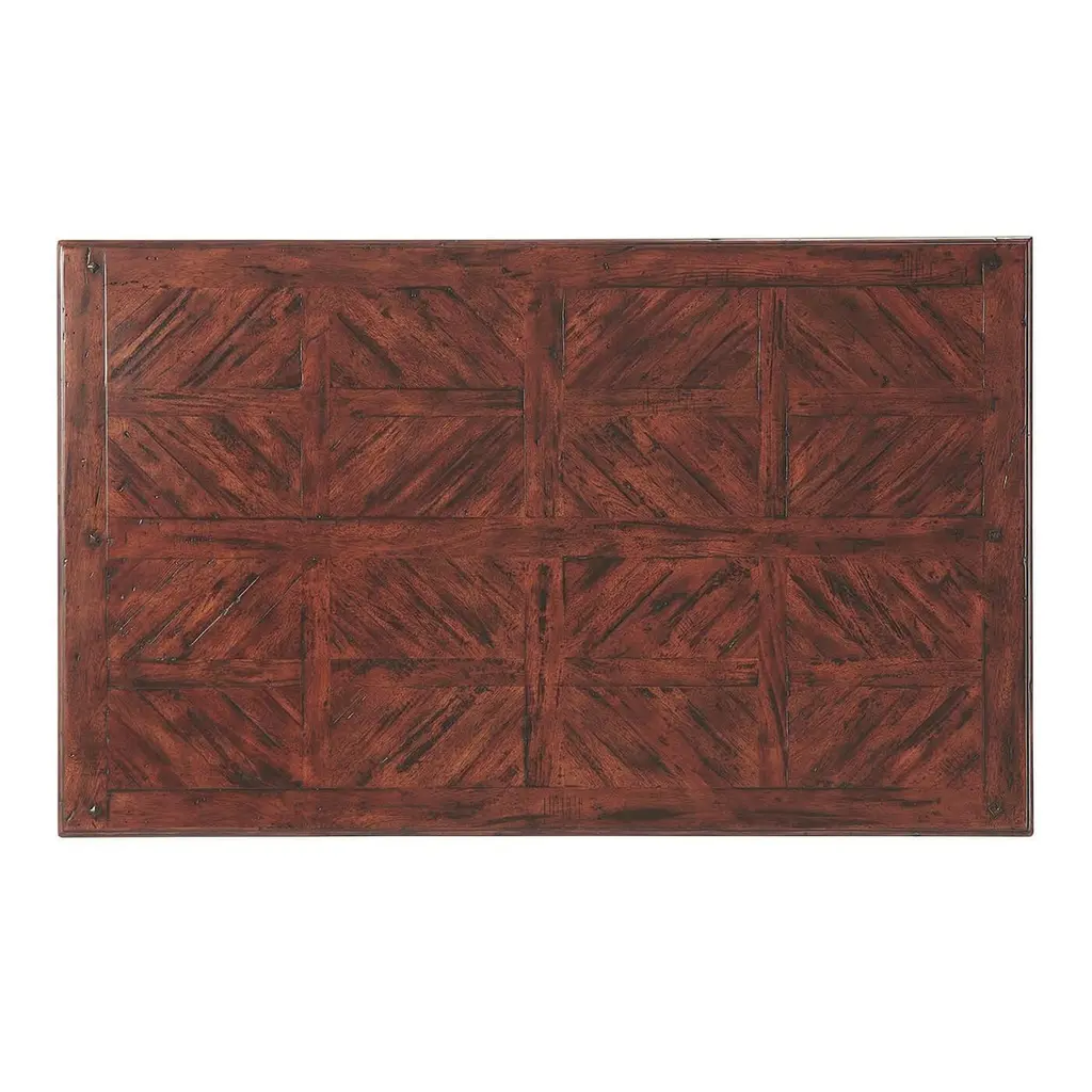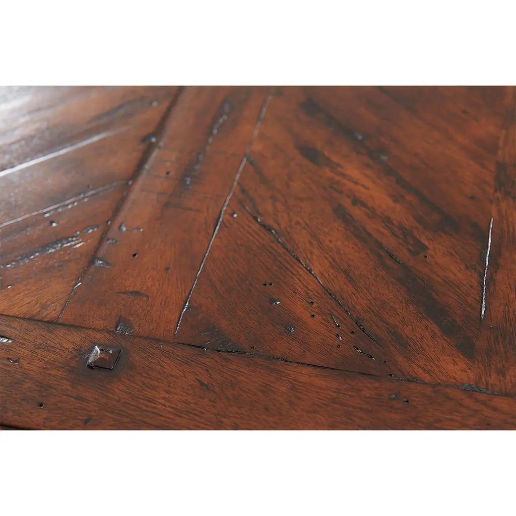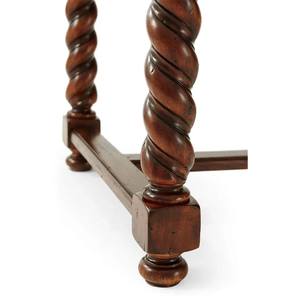 An antiqued wood writing desk, with two frieze drawers, on barley twist turned legs joined by stretchers. This is an antique reproduction of the original 17th century.Dimensions: 44" W x 27" D x 30" HClearance under apron: 25.25".