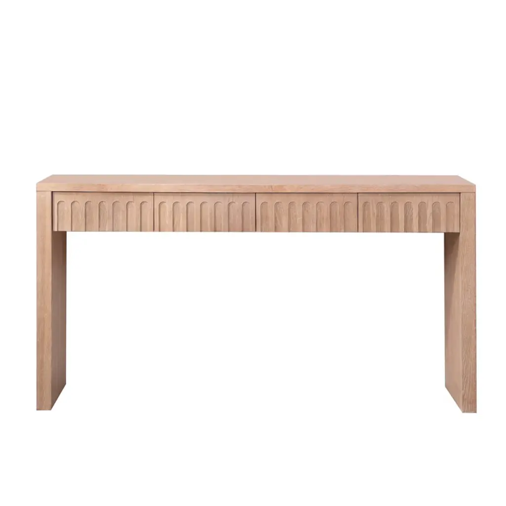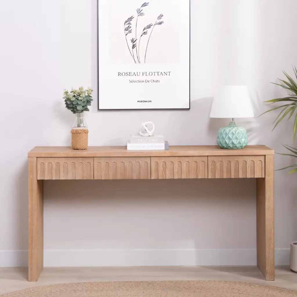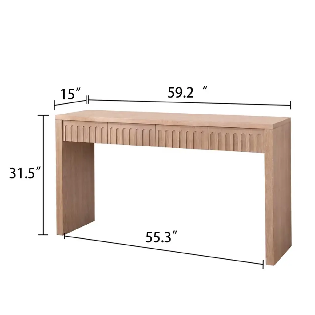 Elevate your home with this sleek, modern console table that combines style and functionality. Featuring clean lines and elegant carved drawer detailing, this piece offers a minimalist design with a touch of sophistication. Crafted from high-quality manufactured wood with a natural finish, this table provides a sturdy and long-lasting addition to any space. The four spacious drawers offer hidden storage for essentials, while the wide tabletop is perfect for displaying décor or everyday items. With space-saving dimensions, it's ideal for narrow spaces like entryways or hallways.