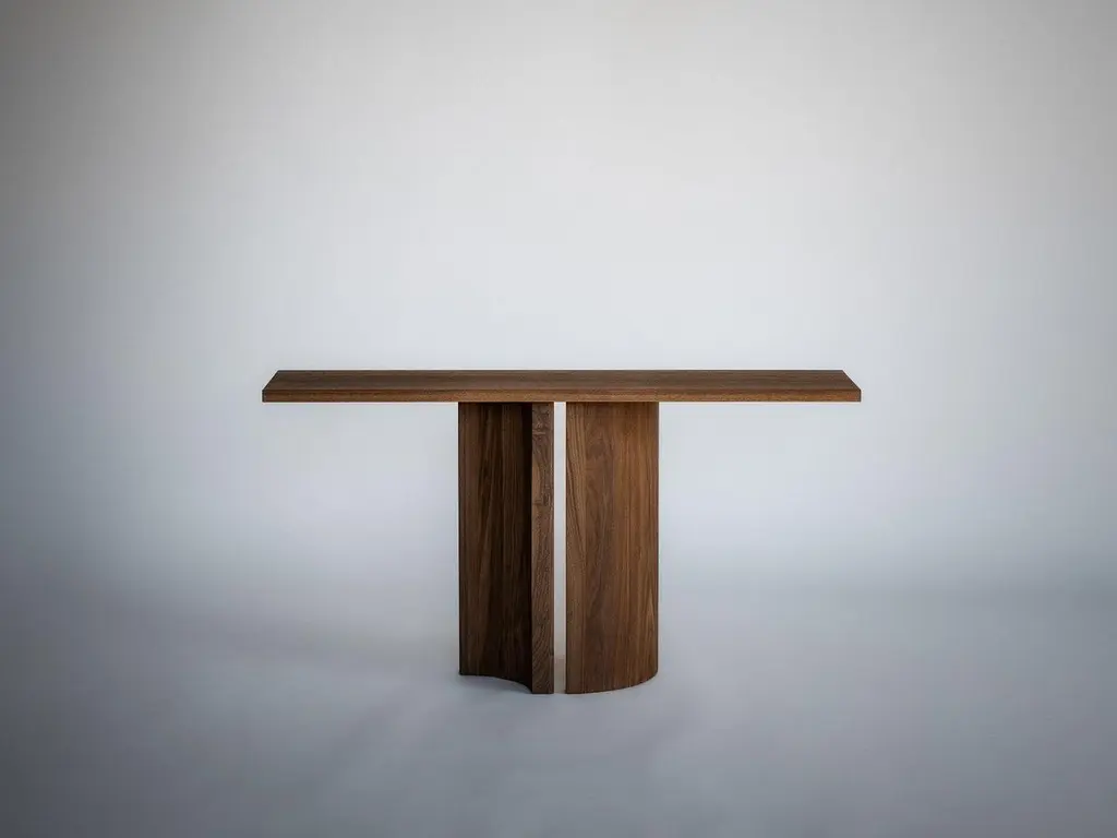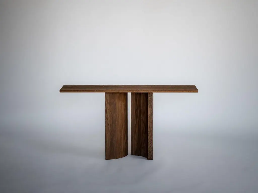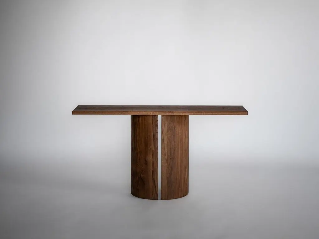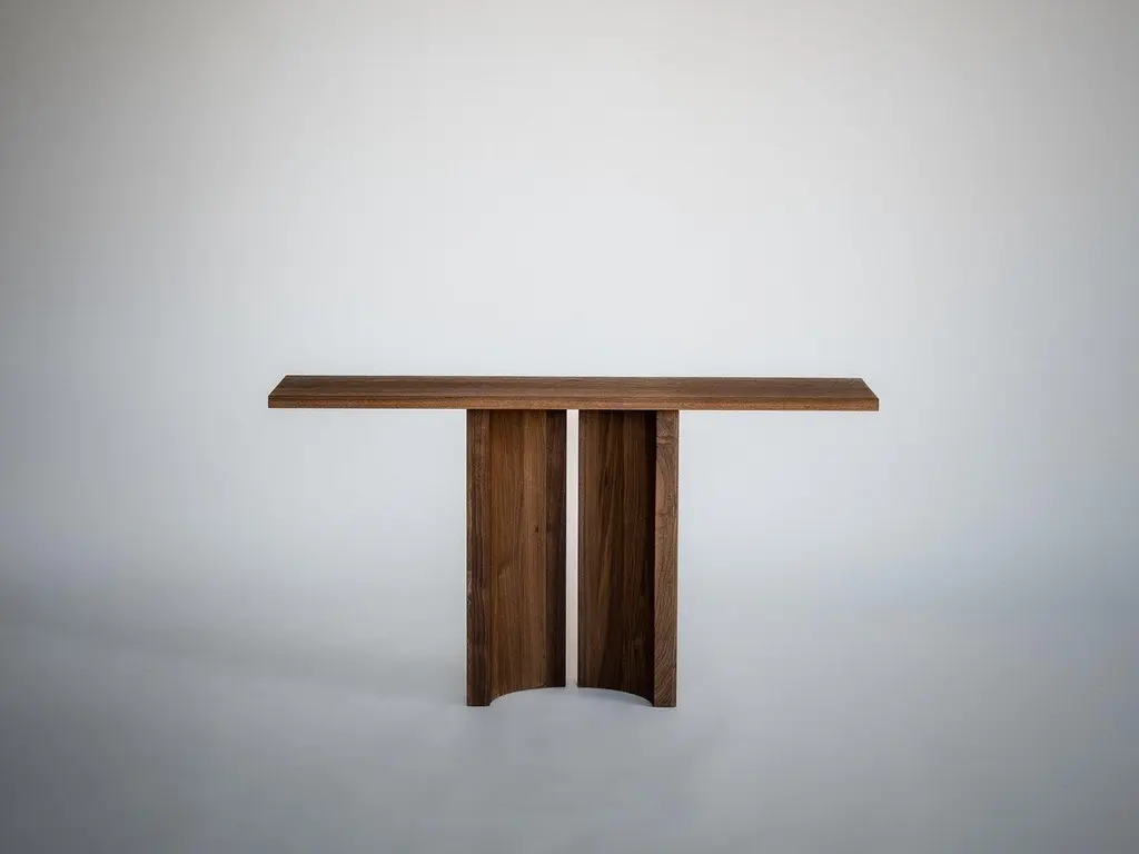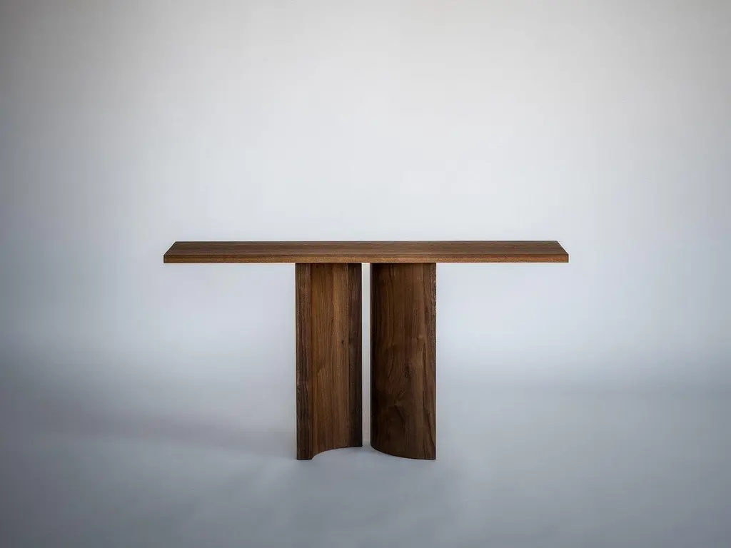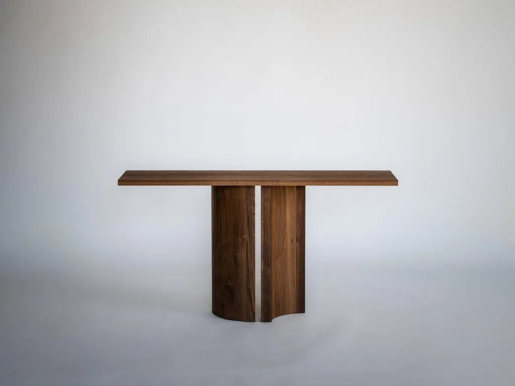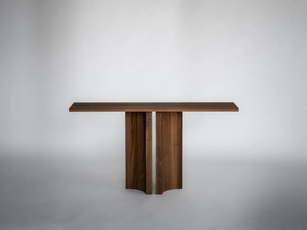 Aperta C1 100 American Walnut Console Table by Mokko AmsterdamDimensions: D 40 x W 100 x H 84 cm. Materials: American walnut.Available in different material options and dimensions. Designed by Aad Bos and crafted in the Netherlands. Please contact us.Aperta ConsoleInspired by light breaking through narrow voids in architectural structures, Aperta features a precise slit, creating a sense of lightness to its solid form. The Aperta Console has manually adaptable legs, allowing for various distinct configurations to alter the table’s expression within the space.Designed by Aad Bos and crafted in the Netherlands out of solid European oak or American walnut. The product is made to order with a production time of 7-8 weeks and customizable in design, size, material and color.We welcome you to our studio to get a feel for the quality and presence of our objects.Mokko represents a collection of interior objects designed by founder Aad Bos. The Amsterdam-based studio was established in 2017 and creates custom products for interior professionals and design enthusiasts internationally.Objects by Mokko feature a rhythm of monolithic form, created through an iteration of volumes and voids. Architectural elements are balanced, weighed and stripped from excess, until the essence of the inspiration is translated into a sculptural object that is emotionally resonant.With respect for nature and robust furniture building, each piece is made in close collaboration with local carpenters in the Netherlands from high-quality, sustainable materials. All objects are custom-made and conceived as future heirlooms; intended to be valued, used and passed down through generations.