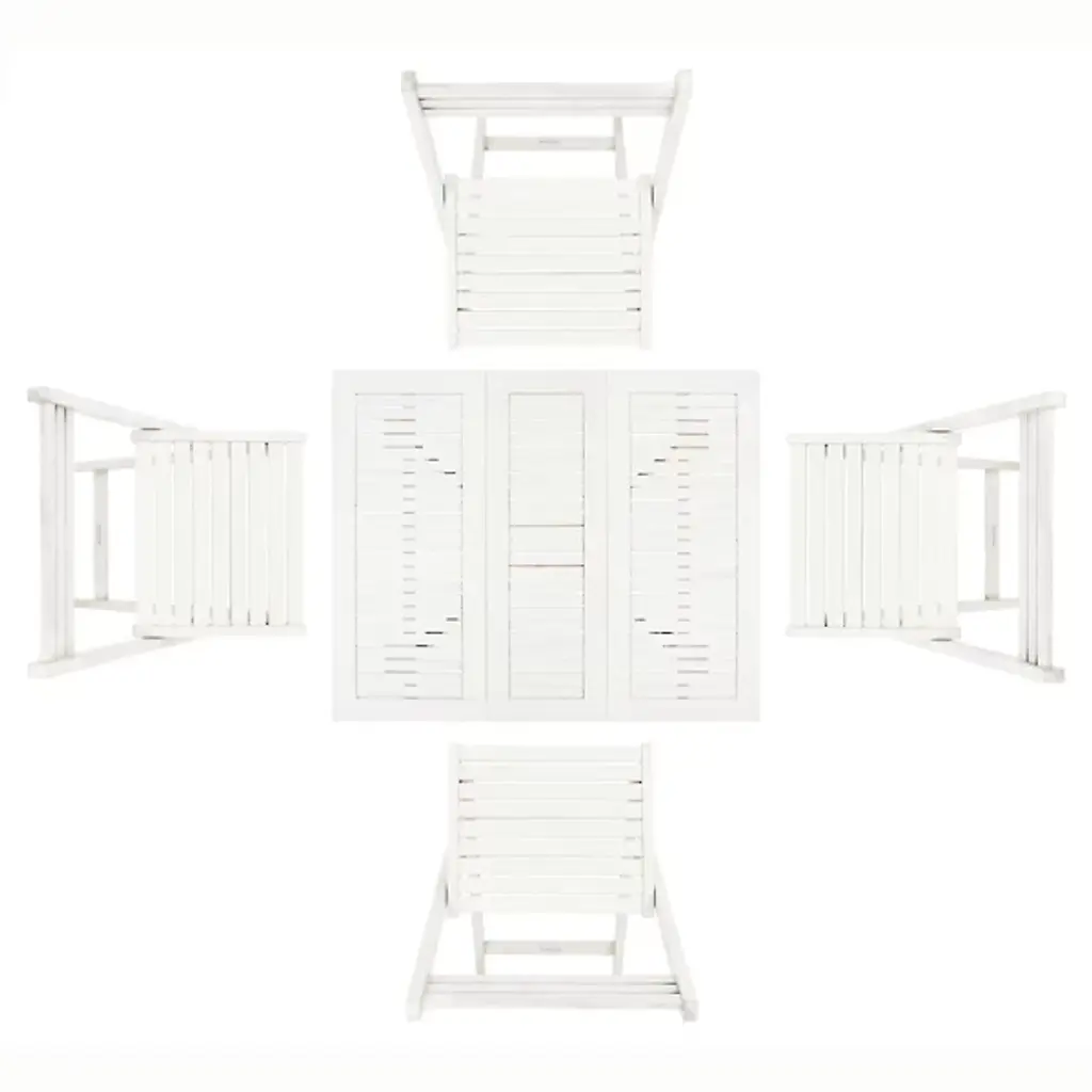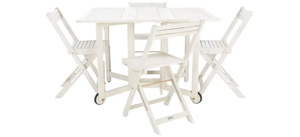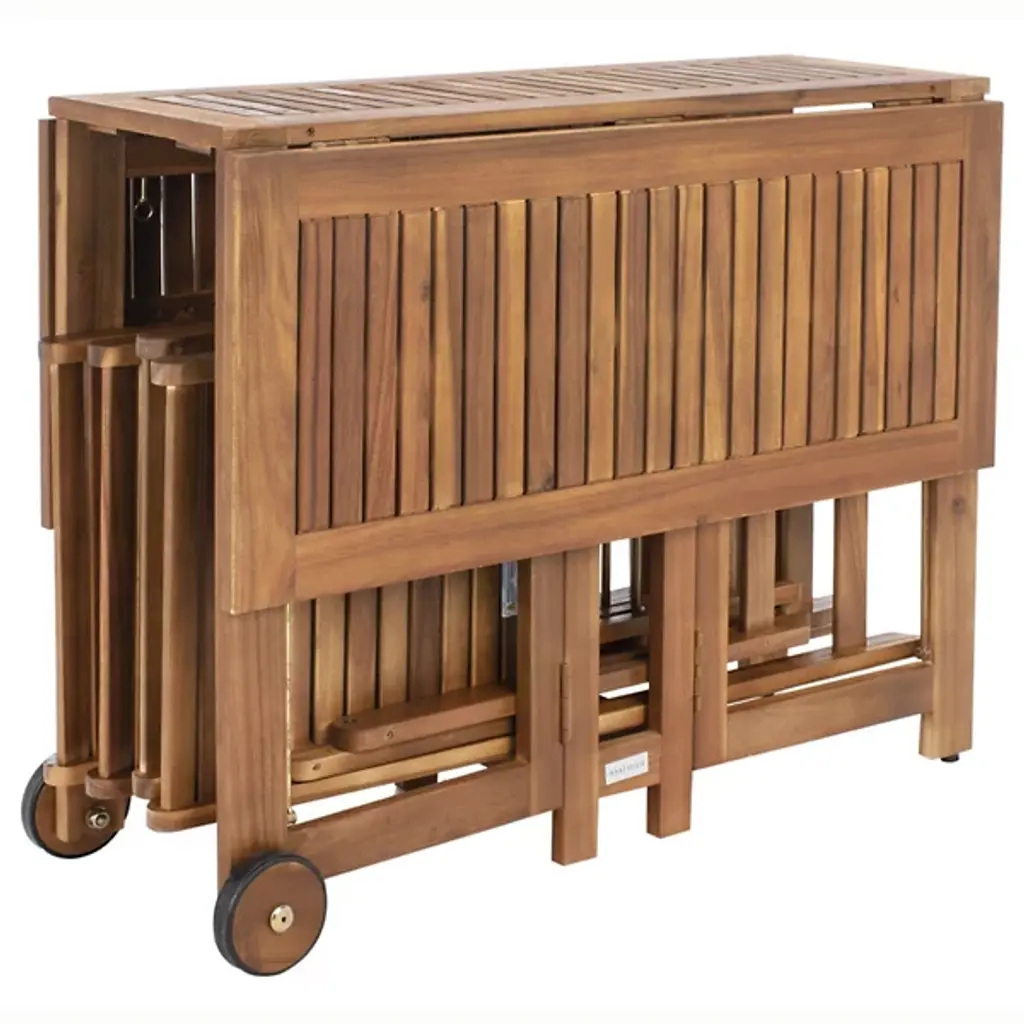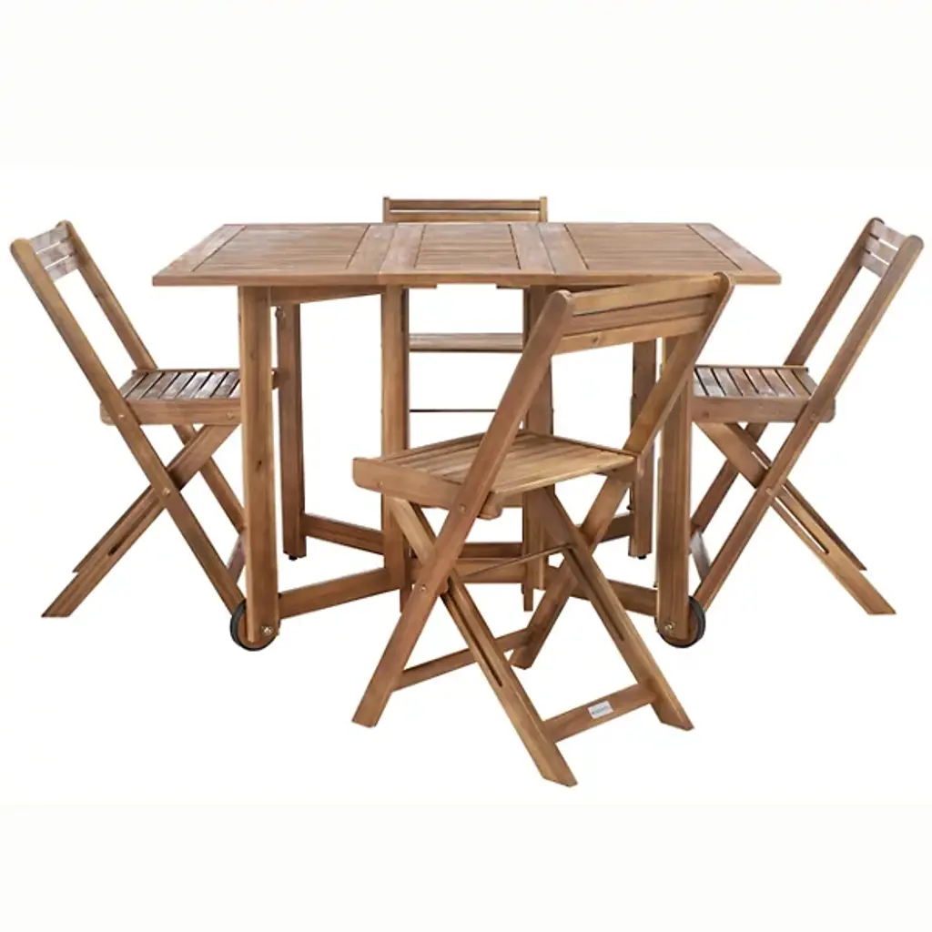 The Arballo Outdoor Table and 4 Pcs Chair from Alder & Ore feature an ingenious fold-and-tuck design that dramatically minimizes storage space. The acacia wood construction withstands outdoor conditions while maintaining its natural beauty. Each director-style chair folds completely flat and slides neatly under the collapsible rectangular table. Galvanized steel hardware ensures the smooth operation of all moving parts. This space-saving solution brings full-sized dining comfort to compact outdoor spaces, perfect for balconies and small patios.