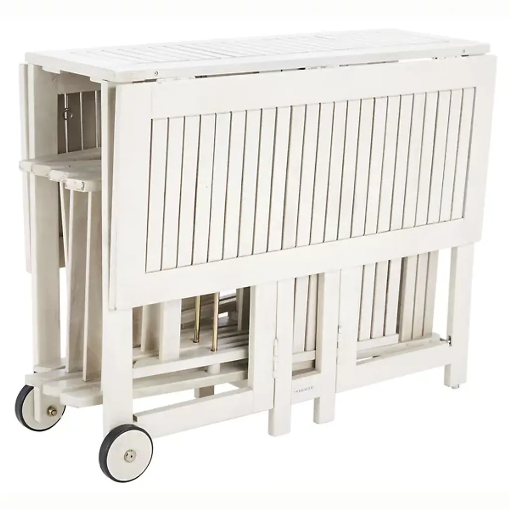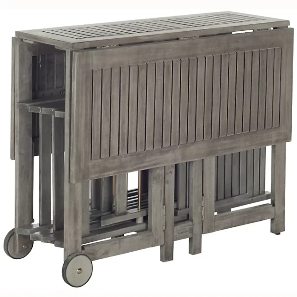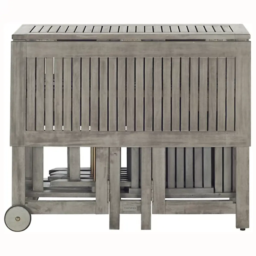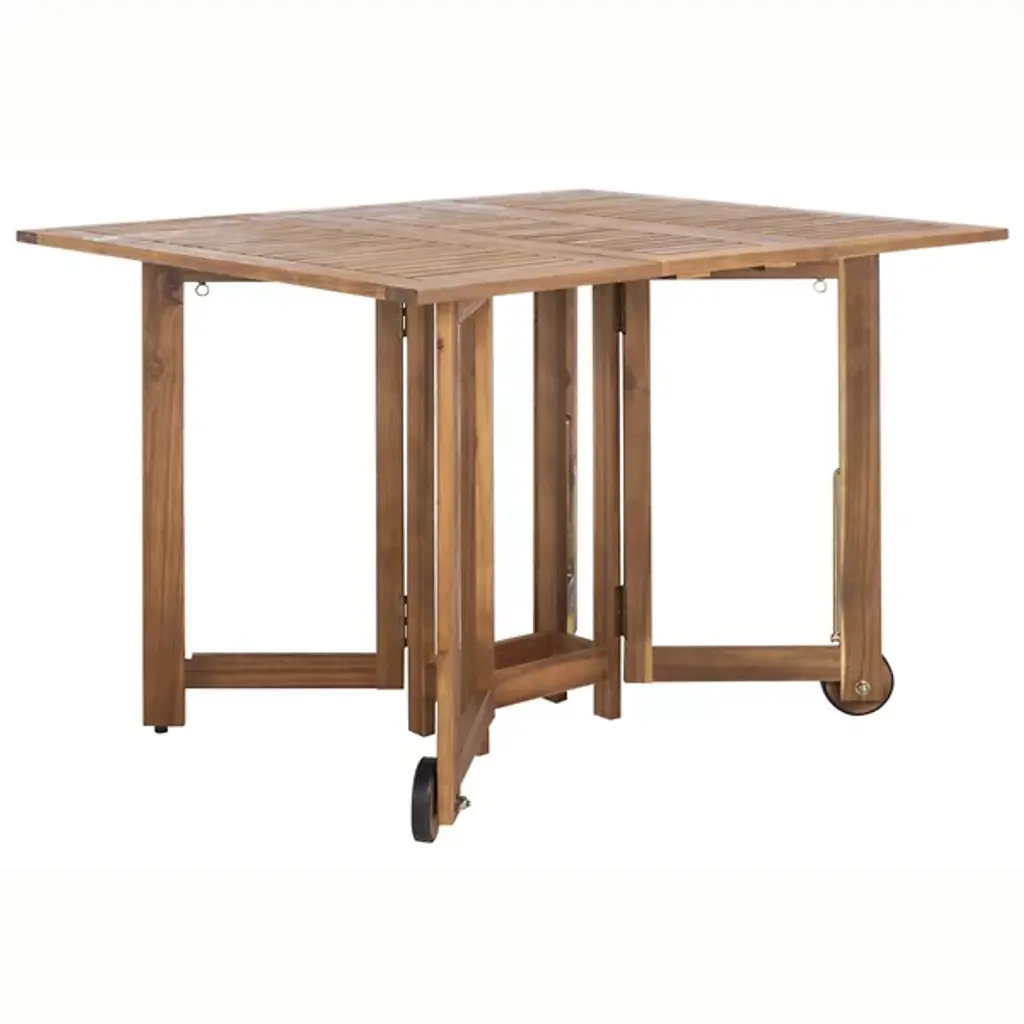 The Arballo Outdoor Table and 4 Pcs Chair from Alder & Ore feature an ingenious fold-and-tuck design that dramatically minimizes storage space. The acacia wood construction withstands outdoor conditions while maintaining its natural beauty. Each director-style chair folds completely flat and slides neatly under the collapsible rectangular table. Galvanized steel hardware ensures the smooth operation of all moving parts. This space-saving solution brings full-sized dining comfort to compact outdoor spaces, perfect for balconies and small patios.