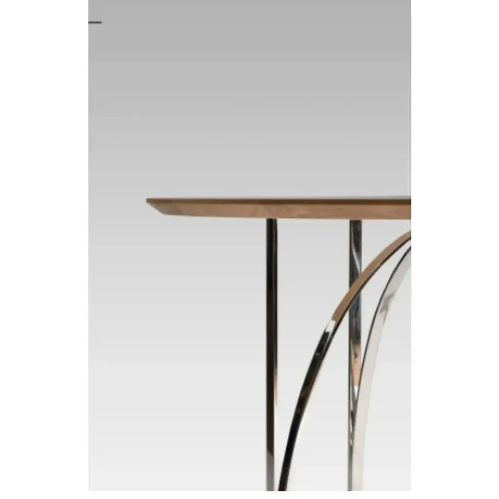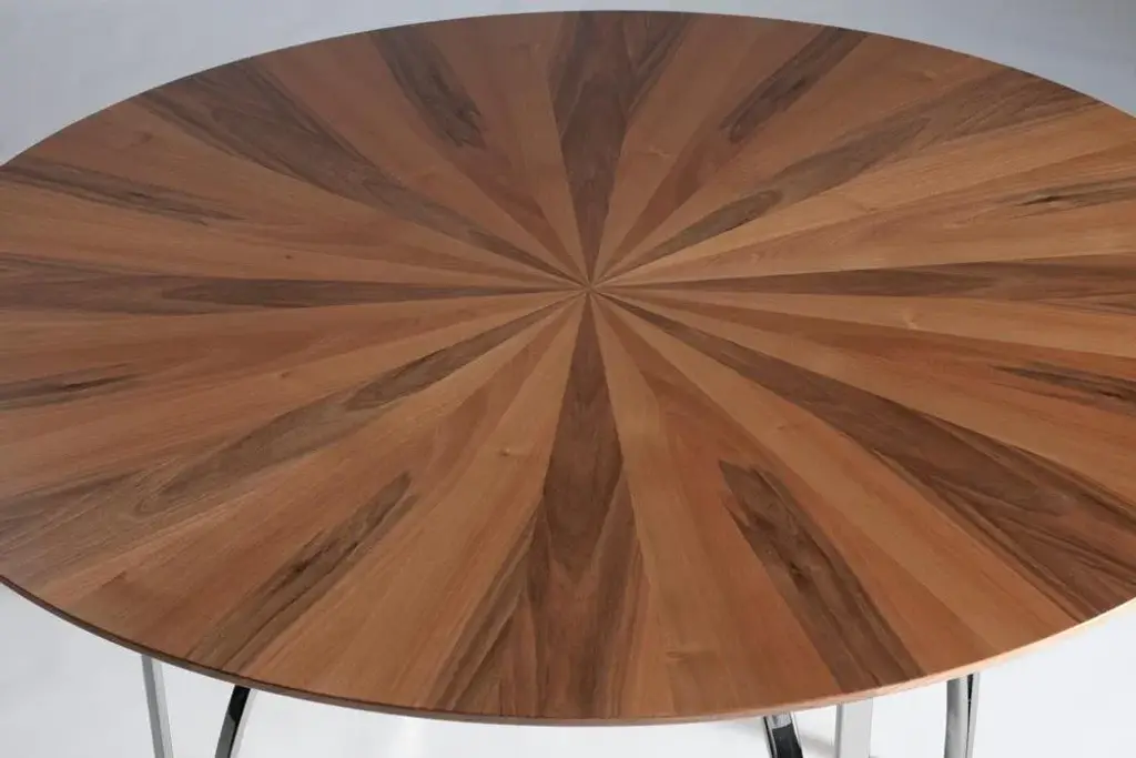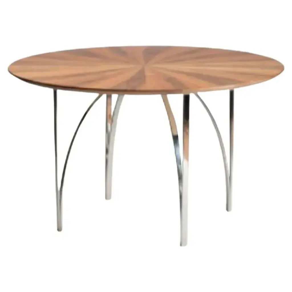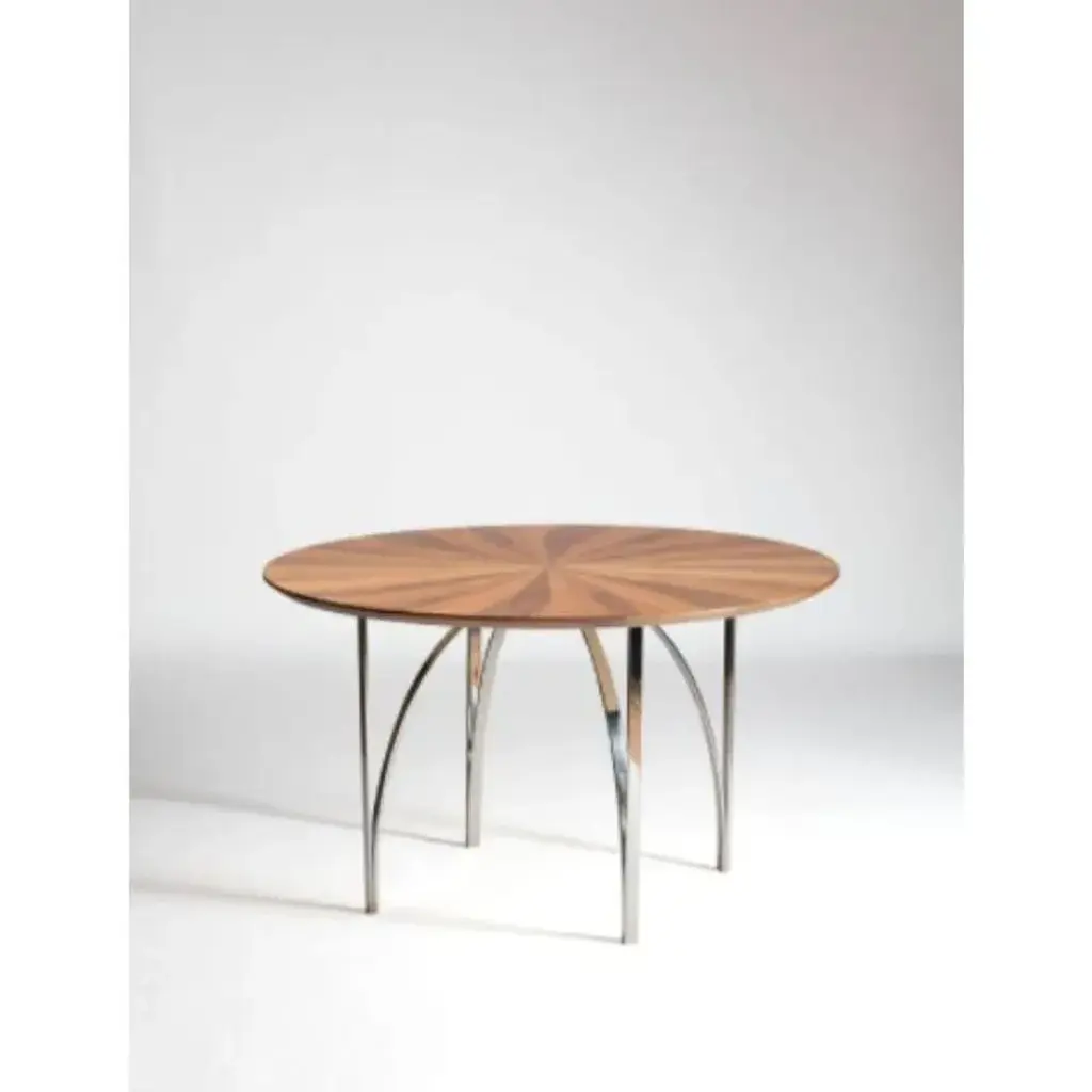 Archie european walnut table by serena confalonieri dimensions: d 130 cm x h 75 cm materials: canaletto walnut , steel or iron. Available in 4 versions : colored veneers, canaletto walnut veneer, european walnut and oak veneer. Legs in mirror polished steel, in matt black painted iron or chromed iron. A wooden top supported by steel arches: these are the pure and essential elements of archie table. Inspired by the trajectory of bouncing objects, archie is formed by a dynamic and light base, such as to create a dance of sinuous movements and references to the classic forms of arches. this piece is attributed to the mentioned designer/maker. It has no attribution mark and no official proof of authenticity, however it is well documented in design history. I take full responsibility for any authenticity issues arising from misattribution