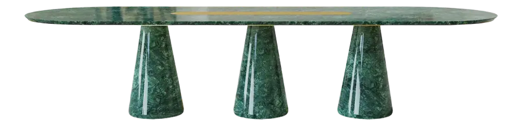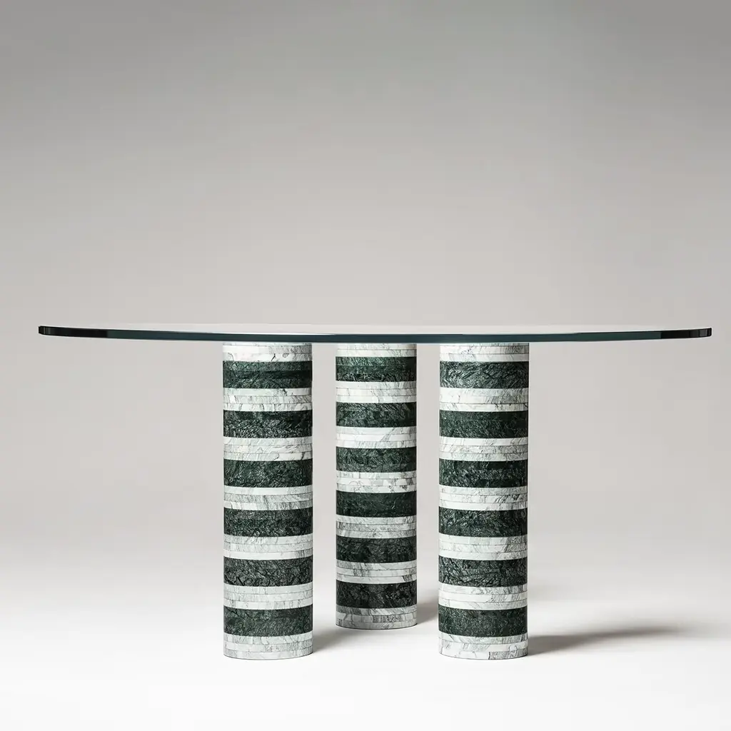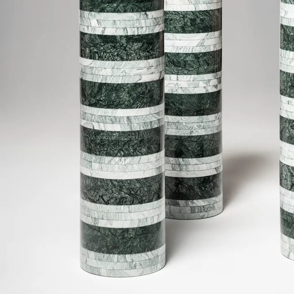 Circular Living table with three central column legs made up of rings in Verde Cipollino and Verde Alpi marble in a symmetrical sequence. Verde Cipollino, a pictorial material rich in veins, extracted from the Apuan Alps of Tuscany, is in contrast with the Verde Alpi, deliberately selected monochromatic to create a color-block effect. The three veined circles in Verde Cipollino stand out from the extra clear glass top.