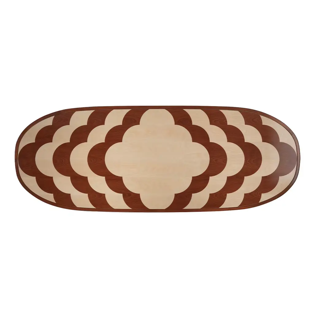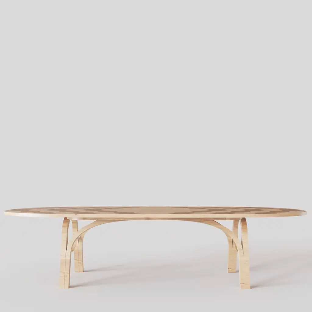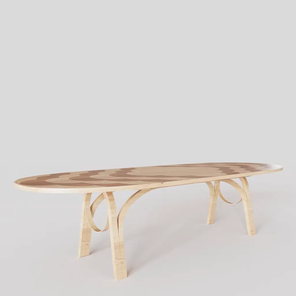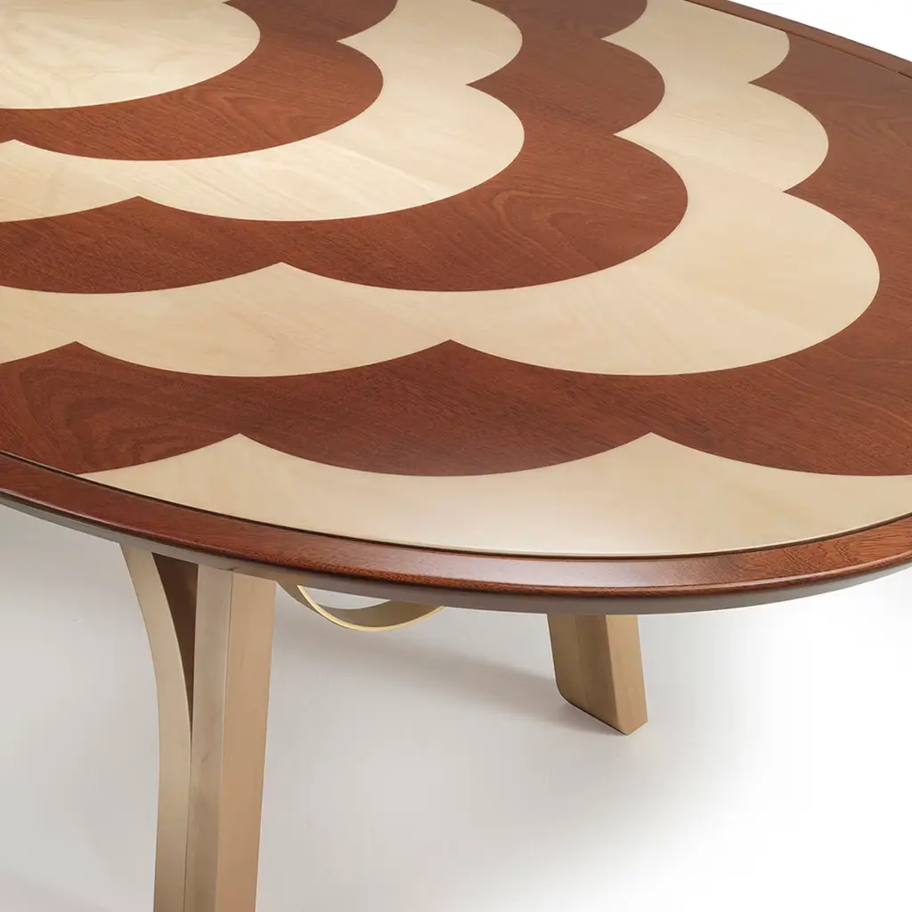 Archway is a table with significant dimensions and highly prized woodworking, celebrated by curvilinear forms and richness of shapes. The birch and mahogany woods selected for the surface harmoniously blend into the solid mahogany edge enhanced and accentuated by a brilliant shiny lacquer finish that completes and protects the woodwork. A brass ring, placed within the legs, represents another unusual element of this project in which tradition and contemporaneity merge.