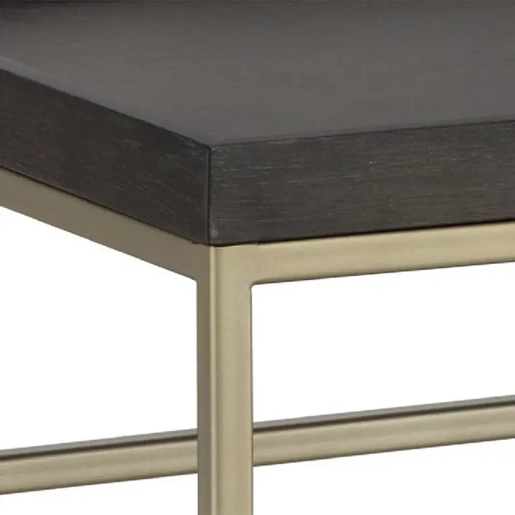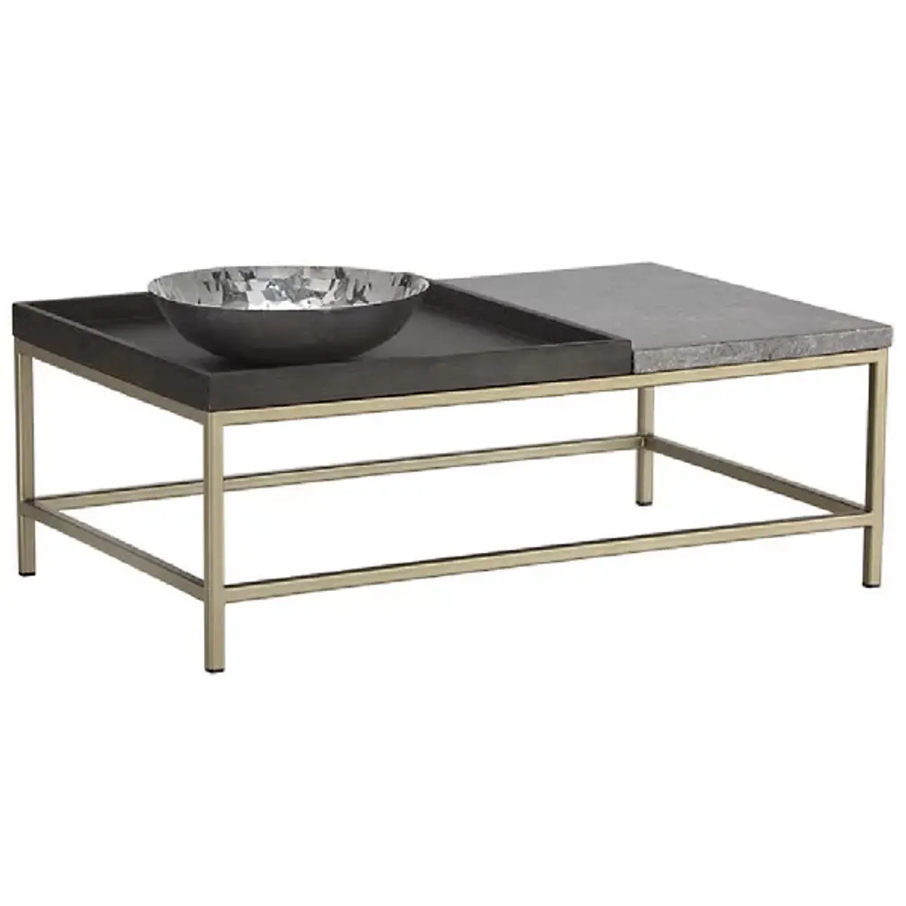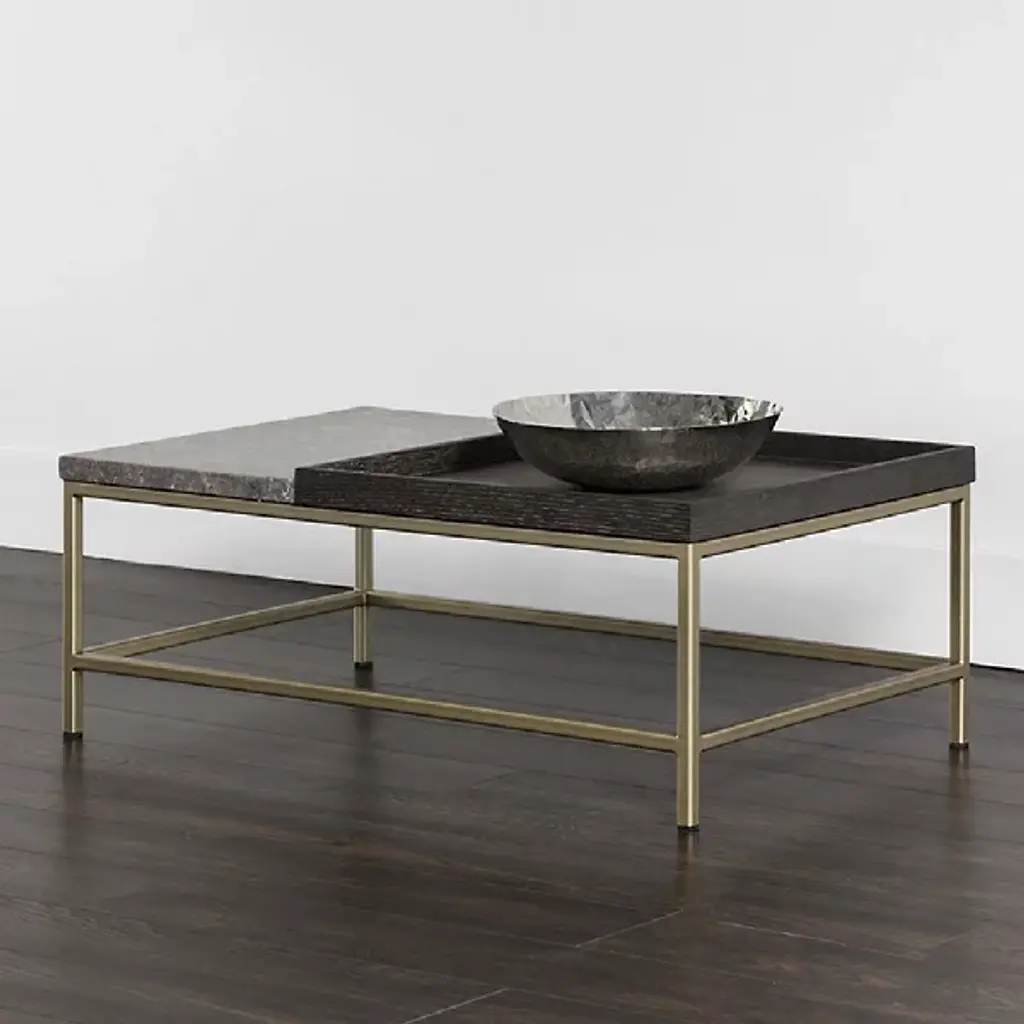 The Arden Coffee Table from Sunpan blends rustic charm with a minimalist design. It features a solid oak wood tray top in rich umber brown complemented by a sophisticated grey marble surface. The brushed gold iron frame adds a touch of elegance to the ensemble. It pairs with matching console and end tables as a coordinated set. The natural marble top showcases unique veining, pitting, fissures, and subtle color variations, ensuring each piece is a one-of-a-kind work of art that celebrates the inherent beauty of its materials.
