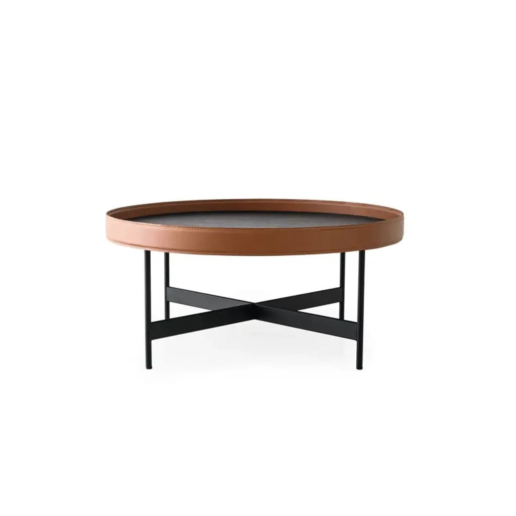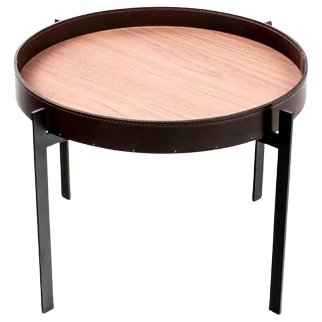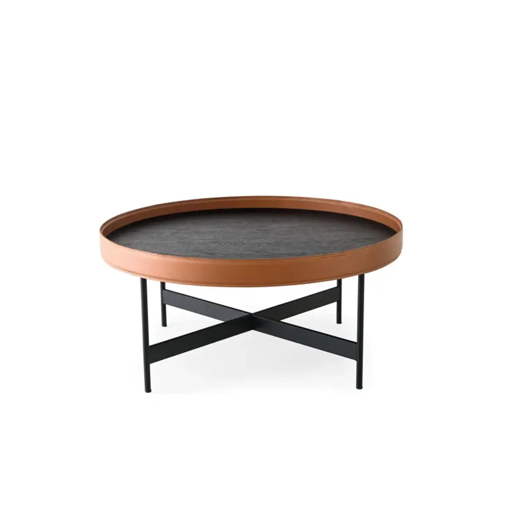 Range of complementary items made from tubular metal with a round wooden top featuring raised edges. Upholstered in regenerated leather. A new range of tables whose elegant simplicity is elevated by a harmonious aesthetic. The Arena has a frame in matt metal and a top in stained wood rimmed with a strip of regenerated leather. This fashion-inspired detail embraces the tabletop, turning it into a private personal sphere - a virtual protective Arena to retreat and take a break from the pressures of the day.