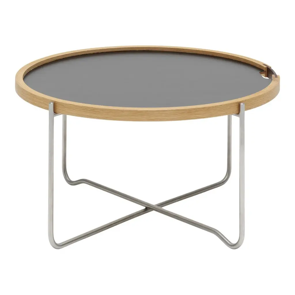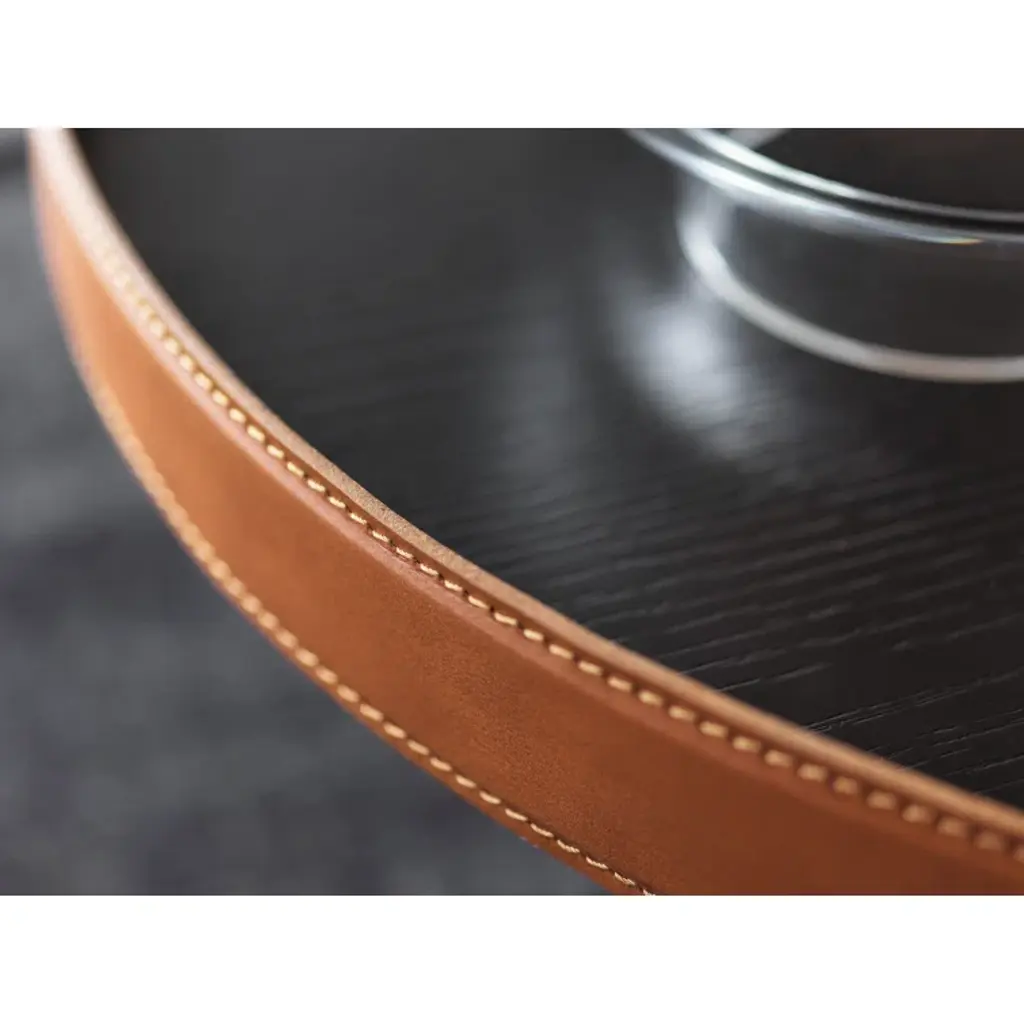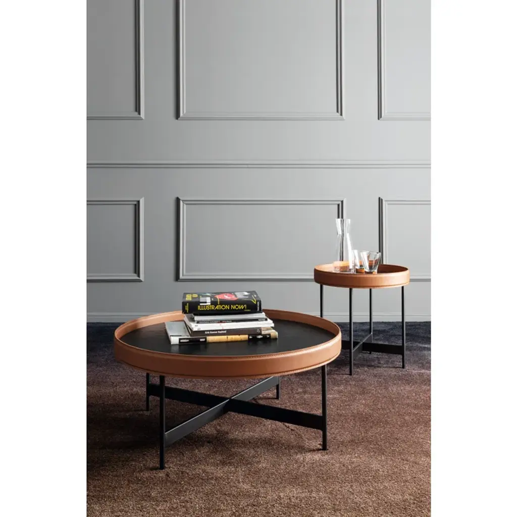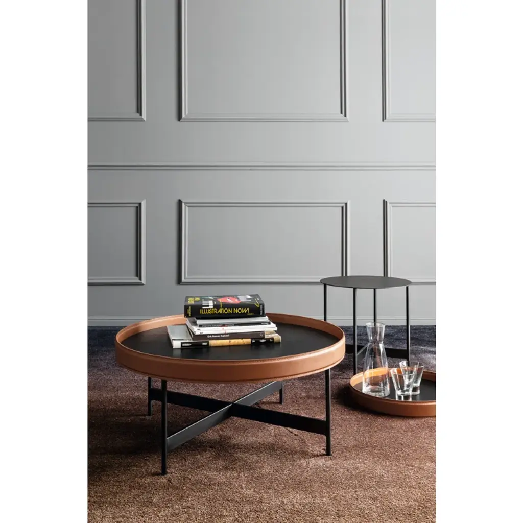 Range of complementary items made from tubular metal with a round wooden top featuring raised edges. Upholstered in regenerated leather. A new range of tables whose elegant simplicity is elevated by a harmonious aesthetic. The Arena has a frame in matt metal and a top in stained wood rimmed with a strip of regenerated leather. This fashion-inspired detail embraces the tabletop, turning it into a private personal sphere - a virtual protective Arena to retreat and take a break from the pressures of the day.