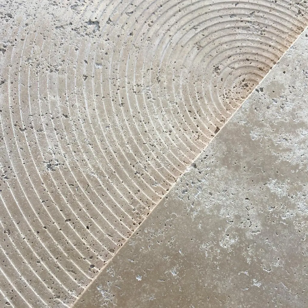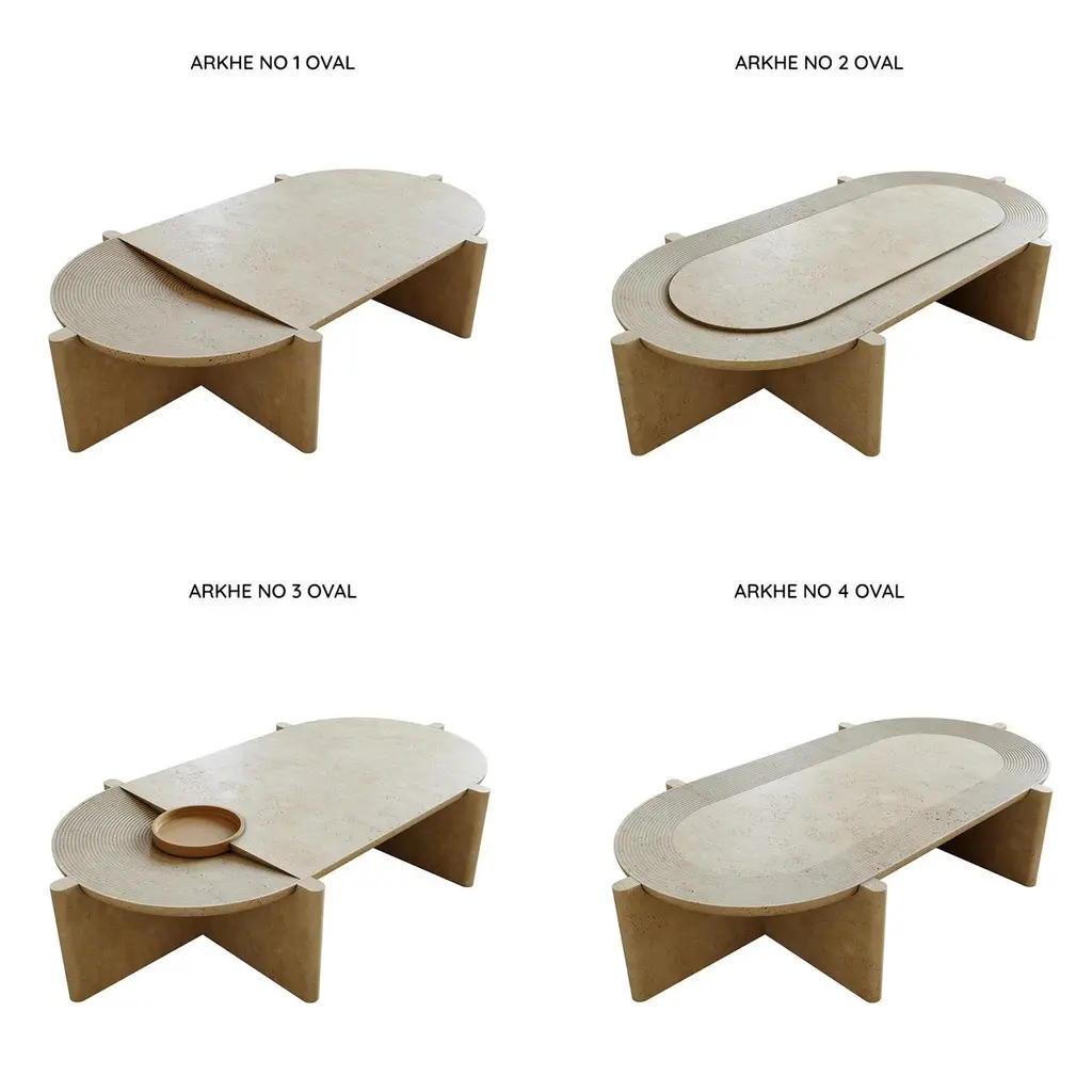 Designer Fulden Topaloğlu explains the inspiration behind the design:“Arkhe Collection is a tribute to the beautiful amphitheaters dispersed throughout the Mediterranean geography. As a lucky kid growing up in the Aegean coast, the visits to these archaeological sites was an indispensable tradition of our family summer vacations. These visits always left me in awe, as the imagery and sensations of visiting these majestic remains of ancient times always gave a larger than life feeling to the mind and soul of that little kid I was back then. Looking back, I must add that the feeling changed only a little.Arkhe collection is a tribute to these magical ruins of my childhood memories and to all the history, culture and myths they whisper to our collective consciousness.”Arkhe coffee table is a graceful combination of functionality, simplicity and sculptural posture. The natural beauty of travertine, exquisite craftsmanship and the inspiration coming from stunning amphitheaters of old times gives this table its timeless appeal. The design plays with geometry to create unique surfaces that appeal to the sight while dividing the table surface into areas with different functions. The inclined surface is intended to store and display books, newspapers and magazines, whereas the flat surface holds everyday objects like vases, candles, coffee cups. Produced by skilled craftsman out of travertine blocks, the delicate imperfections provided by unfilled honed travertine is a nod to the imperfections created by time on these monumental architectural wonders of the distant past. Arkhe coffee table also has different geometric variations as well as dimensional and material alternatives to offer answers for different spatial needs and tastes. Material: Honed unfilled beige travertineDimensions: W 172 cm, D 92 cm, H 35 cmCustomization is possible in dimensions and materials.Can be produced with different stone and marble types upon request.