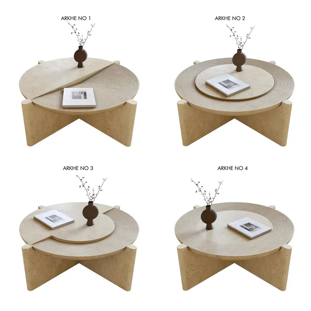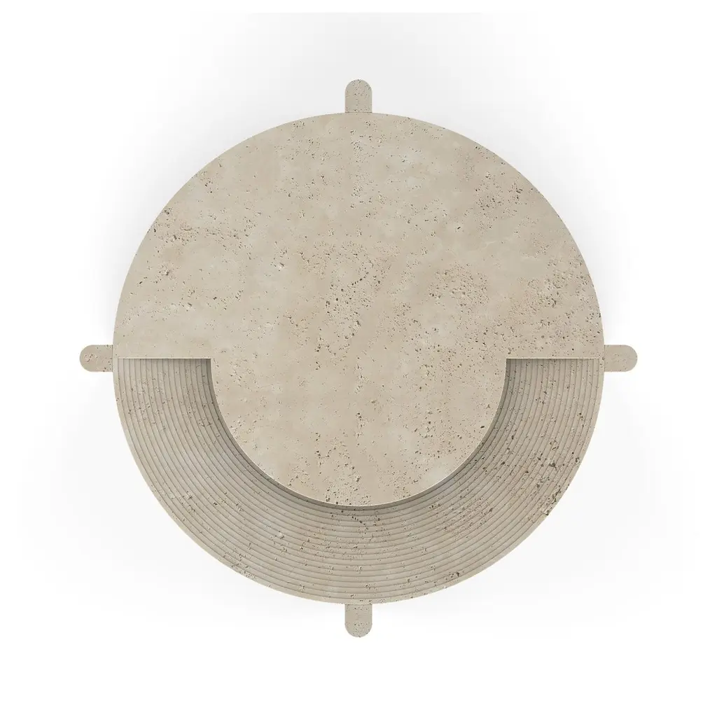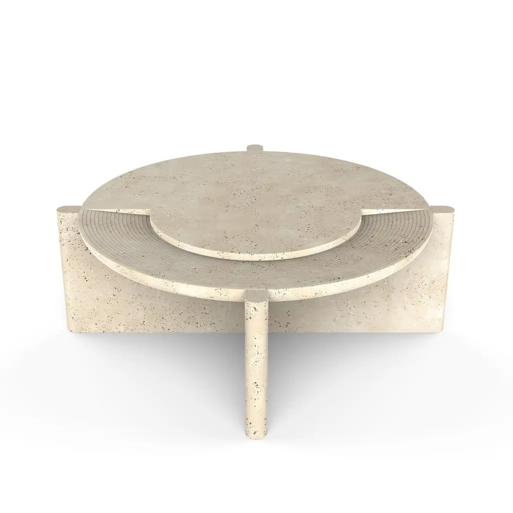 Designer Fulden Topaloğlu explains the inspiration behind the design:“Arkhe Collection is a tribute to the beautiful amphitheaters dispersed throughout the Mediterranean geography. As a lucky kid growing up in the Aegean coast, the visits to these archaeological sites was an indispensable tradition of our family summer vacations. These visits always left me in awe, as the imagery and sensations of visiting these majestic remains of ancient times always gave a larger than life feeling to the mind and soul of that little kid I was back then. Looking back, I must add that the feeling changed only a little.Arkhe collection is a tribute to these magical ruins of my childhood memories and to all the history, culture and myths they whisper to our collective consciousness.”Arkhe coffee table is a graceful combination of functionality, simplicity and sculptural posture. The natural beauty of travertine, exquisite craftsmanship and the inspiration coming from stunning amphitheaters of old times gives this table its timeless appeal. The design plays with geometry to create unique surfaces that appeal to the sight while dividing the table surface into areas with different functions. The inclined surface is intended to store and display books, newspapers and magazines, whereas the flat surface holds everyday objects like vases, candles, coffee cups. Produced by skilled craftsman out of travertine blocks, the delicate imperfections provided by unfilled honed travertine is a nod to the imperfections created by time on these monumental architectural wonders of the distant past. Arkhe coffee table also has different geometric variations as well as dimensional and material alternatives to offer answers for different spatial needs and tastes. Material: Honed unfilled beige travertineDimensions: W 102 cm, D 102 cm, H 35 cm (Table top diameter: 90 cm / 35.4 inch)Customization is possible in dimensions and materials.Can be produced with different stone and marble types upon request.
