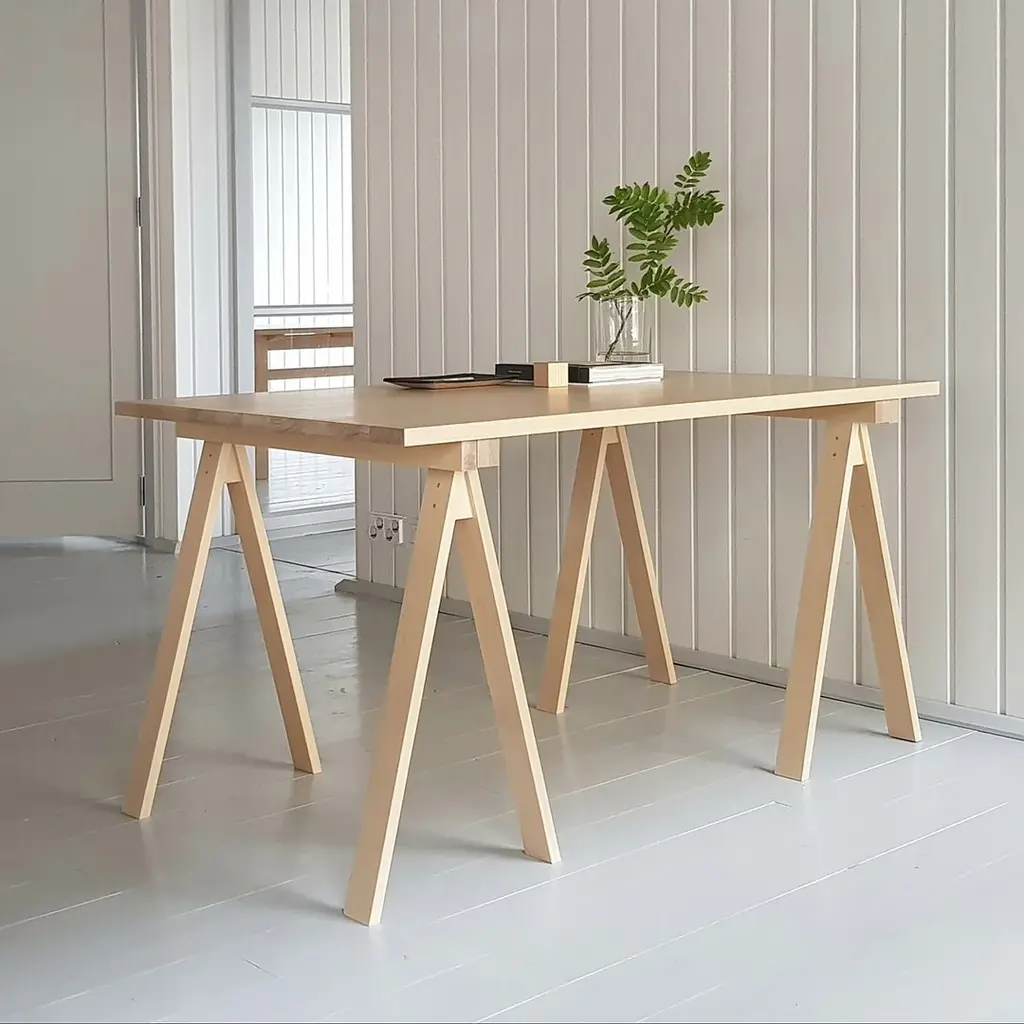 This solid wooden table top paired with the Arkitecture PPJ trestle legs. Together they build up a practical, durable solid wooden table.
