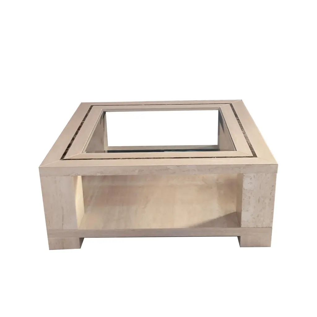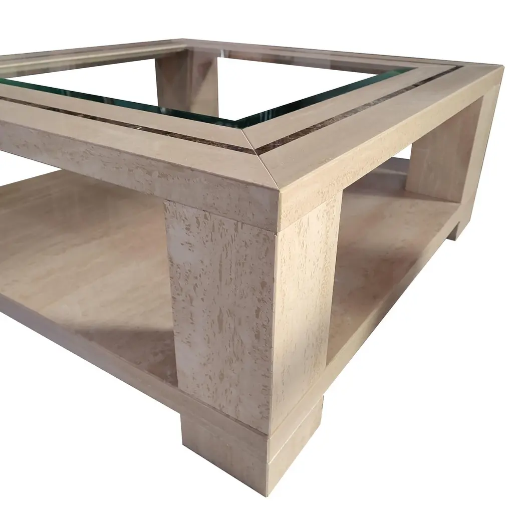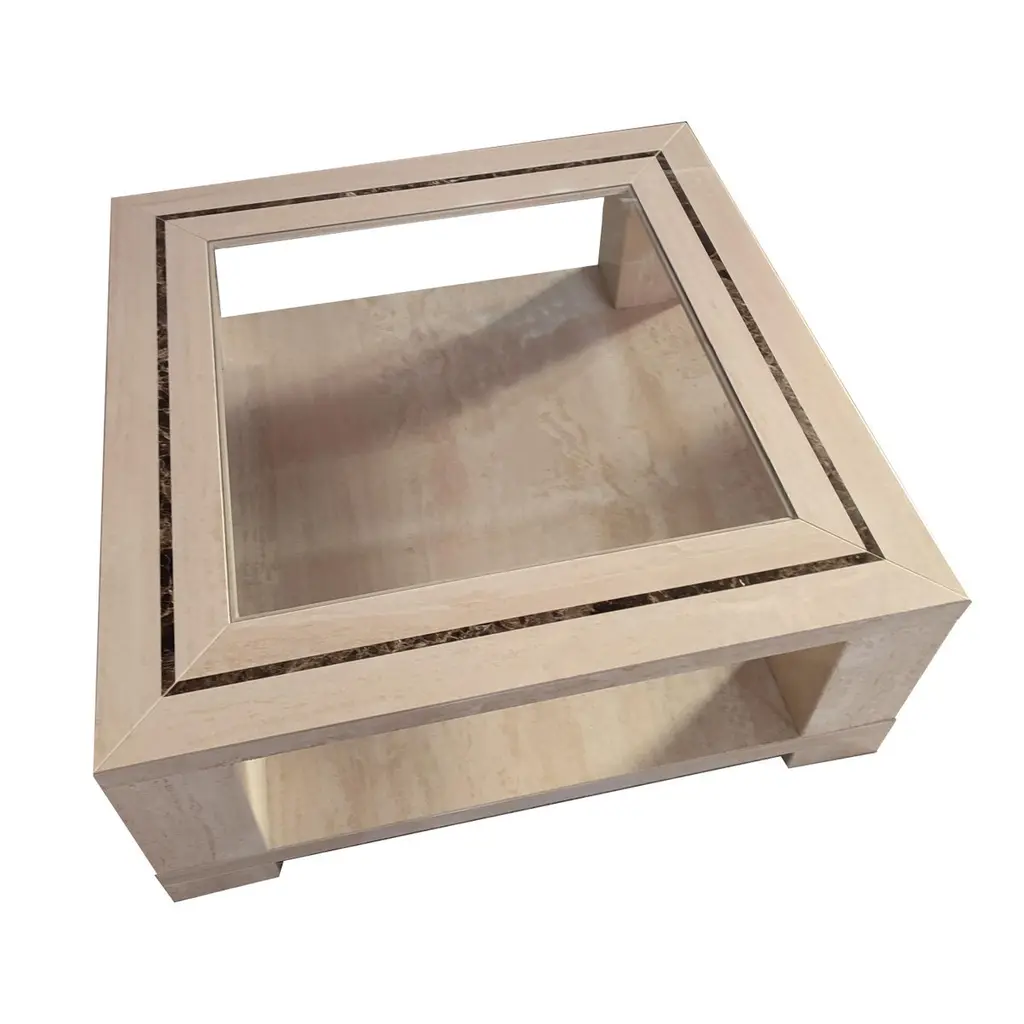 Aroa Marble Travertine Design Table Midcentury Original Marble Marquetry & BrownThe Aroa coffee table is an original piece from the 80's, manufactured by Creaciones Moll in Segovia, Spain. The Aroa table consists of a lower magazine rack in polished travertine marble and four legs that rise to a top surface with square frame in polished travertine marble and beveled inset glass. On the top surface is a marquetry frame in emperor brown marble. The combination of the travertine marble in polished finish along with the top marquetry in polished emperor brown marble is a detail of quality and style. A thin line of brown marble makes the perimeter around the entire surface of the Aroa coffee table.The Aroa coffee table is an original piece from the 80's, a MidCentury piece of furniture in travertine marble. A unique piece of design, with a perfect proportion of the design and made in a noble material such as travertine marble and emperor brown marble.The table model Aroa is an original design by Joaquín Moll and is manufactured in Spain in the 80s. The table is brand new as it was in stock at the Meddel factory in Segovia, Spain.