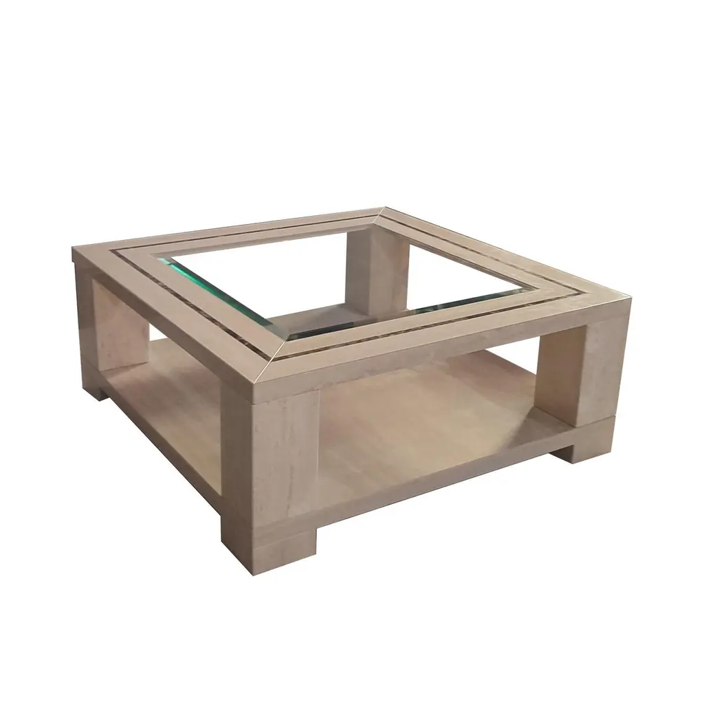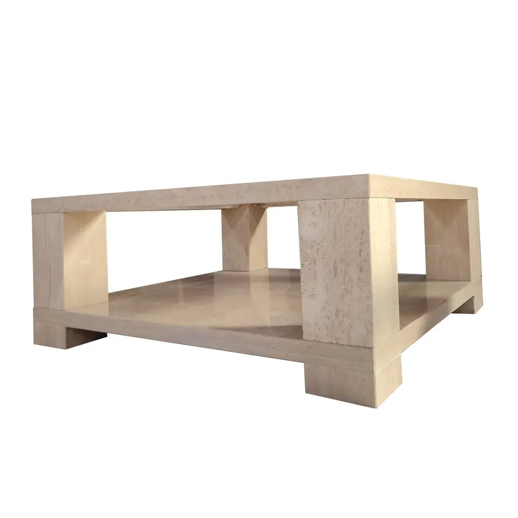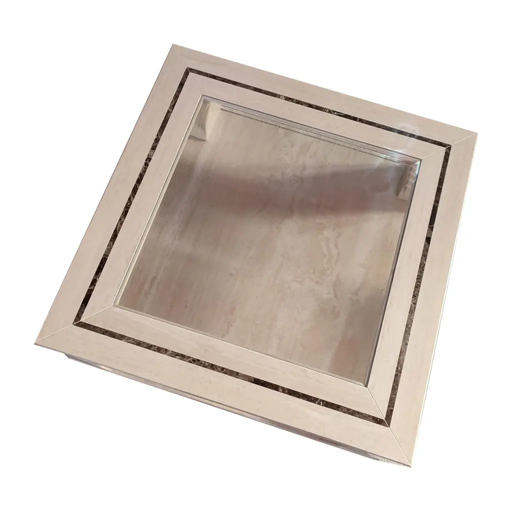Aroa Marble Travertine Design Table Midcentury Original Marble Marquetry & BrownThe Aroa coffee table is an original piece from the 80's, manufactured by Creaciones Moll in Segovia, Spain. The Aroa table consists of a lower magazine rack in polished travertine marble and four legs that rise to a top surface with square frame in polished travertine marble and beveled inset glass. On the top surface is a marquetry frame in emperor brown marble. The combination of the travertine marble in polished finish along with the top marquetry in polished emperor brown marble is a detail of quality and style. A thin line of brown marble makes the perimeter around the entire surface of the Aroa coffee table.The Aroa coffee table is an original piece from the 80's, a MidCentury piece of furniture in travertine marble. A unique piece of design, with a perfect proportion of the design and made in a noble material such as travertine marble and emperor brown marble.The table model Aroa is an original design by Joaquín Moll and is manufactured in Spain in the 80s. The table is brand new as it was in stock at the Meddel factory in Segovia, Spain.