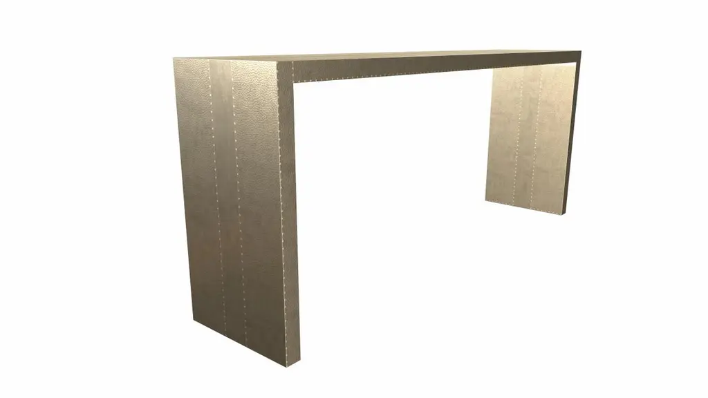 Alison Spear designed this elegant and minimal table for Stephanie Odegard during their trip together to Rajasthan, India. The craftsmen create patterns using different types of hammerings in the metal sheets clad over teak-wood structure.Crafted with utmost care and attention to detail, these Rectangular Console Tables are made to order and are available in twelve metal clad finishes, ensuring that you can choose the perfect one to match your individual style and taste. The use of high-quality materials and expert craftsmanship ensure that each Art Deco Rectangular Console Table is not only beautiful but also a true piece of art.The Straight legs and side arms of this Art Deco Rectangular Console Table are hand carved from solid pieces of teak. Pattern makers trace and cut complex forms that will cover the chair in a skin of copper, white bronze, brass or antiqued white bronze The metal finishes will tarnish over time. Regular non-abrasive household metal polishes can be used to restore the original luster.Overall, if you're looking for a piece of furniture that combines luxury, comfort, and style, then the Art Deco Rectangular Console Table is an excellent choice. With its distinctive curved profile and multiple finish options, this Chair set is sure to elevate the look of any room it is placed in, and be a beloved addition to your home for years to come.The images shown in this listing are shot in different lighting conditions and/or are 3D illustrations. We encourage our customers to please request a sample or a full sample set of 12 finishes so that they can experience the finish first hand. Art Deco Card Tables and Tea Console Tables Mid. Hammered in Brass by Alison SpearSize- 72"x 16"x 30"HMaterials - Brass, Metal sheet, Teak, Wood, MetalTechniques: Hand-Crafted, Hand-Carved, Metal Work, Wood Work, Metal Wrapping, PolishedPlease note that moisture in air, sudden change in temperature and natural movement of wood over time causes the metal to wrinkle or bubble up. We use well seasoned, reclaimed teak and high quality marine grade MDF (wherever technically possible) to avoid and delay the mentioned changes. However a perfect stability of metal cannot be guaranteed. Please note that our smooth finish metal clad pieces will have some unavoidable tool marks. This is proof that everything is done by hand. The smooth finish will not come out like a machine made perfect surface and the master artisan will do their best to make it look as good/clean/stable/perfect as he possibly can.The antique white bronze finish is hand done by using an acidic chemical over the white bronze finish to recreate a natural patination. Like with the natural patination of silver, copper, or brass, the final result and color uniformity of the patina cannot be guaranteed. The goal of this finish is to achieve rainbow-like shades with dull, shiny, cloudy, and streaky patches to give an illusion of antiquing. Please note:None of our metal clad pieces are treated with a protective “finish” thus enabling the items to age naturally over time. We will of course polish them well before we pack them. a) Copper oxidizes faster than the other metals. In six to twelve months it will most likely lose its shine and will gradually turn to different shades of brown and/or green/blue. This aging process and its effect is referred to as verdigris. After a year the piece should not change much more. Copper does not rust, but does require periodic cleaning in order to retain its original shine if that the preferred option. ('BRASSO' or any known copper polish can be used to polish copper).b) Brass retains its shine for far longer than others, but will tarnish if not cleaned on occasion. ('BRASSO' is made to polish brass).c) White bronze, has the least tendency to show age or tarnish. If kept in a controlled climate, this metal will hold its shine for years. It can be cleaned with a cleanser and polished with a cloth. d) The antiqued white bronze finish will react with the natural elements the fastest in the beginning but it too will stop reacting and will settle down in a stable state like copper after 6-12 months. Since it is already antiqued and looked like it is tarnished, as described in an earlier message, this fast reaction will not change the over all look. In that way this surface is most forgiving. The images shown in this listing are shot in different lighting conditions and/or are 3D illustrations. We encourage our customers to please request a sample or a full sample set of 12 finishes so that they can experience the finish first hand.