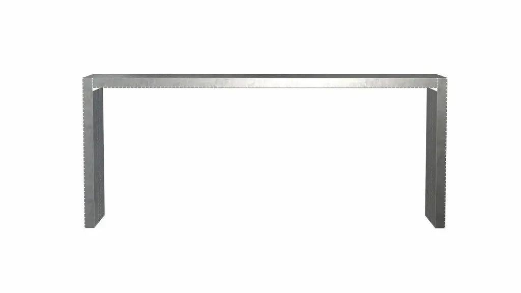 Alison Spear designed this elegant and minimal table for Stephanie Odegard during their trip together to Rajasthan, India. The craftsmen create patterns using different types of hammerings in the metal sheets clad over teak-wood structure.Crafted with utmost care and attention to detail, these Rectangular Console Tables are made to order and are available in twelve metal clad finishes, ensuring that you can choose the perfect one to match your individual style and taste. The use of high-quality materials and expert craftsmanship ensure that each Art Deco Rectangular Console Table is not only beautiful but also a true piece of art.The Straight legs and side arms of this Art Deco Rectangular Console Table are hand carved from solid pieces of teak. Pattern makers trace and cut complex forms that will cover the chair in a skin of copper, white bronze, brass or antiqued white bronze The metal finishes will tarnish over time. Regular non-abrasive household metal polishes can be used to restore the original luster.Overall, if you're looking for a piece of furniture that combines luxury, comfort, and style, then the Art Deco Rectangular Console Table is an excellent choice. With its distinctive curved profile and multiple finish options, this Chair set is sure to elevate the look of any room it is placed in, and be a beloved addition to your home for years to come.The images shown in this listing are shot in different lighting conditions and/or are 3D illustrations. We encourage our customers to please request a sample or a full sample set of 12 finishes so that they can experience the finish first hand. Art Deco Card Tables and Tea Tables Rectangular Console in Smooth White Bronze by Alison SpearSize- 72"x 16"x 30"HMaterials - White Bronze, Metal sheet, Teak, Wood, MetalTechniques: Hand-Crafted, Hand-Carved, Metal Work, Wood Work, Metal Wrapping, PolishedPlease note that moisture in air, sudden change in temperature and natural movement of wood over time causes the metal to wrinkle or bubble up. We use well seasoned, reclaimed teak and high quality marine grade MDF (wherever technically possible) to avoid and delay the mentioned changes. However a perfect stability of metal cannot be guaranteed. Please note that our smooth finish metal clad pieces will have some unavoidable tool marks. This is proof that everything is done by hand. The smooth finish will not come out like a machine made perfect surface and the master artisan will do their best to make it look as good/clean/stable/perfect as he possibly can.The antique white bronze finish is hand done by using an acidic chemical over the white bronze finish to recreate a natural patination. Like with the natural patination of silver, copper, or brass, the final result and color uniformity of the patina cannot be guaranteed. The goal of this finish is to achieve rainbow-like shades with dull, shiny, cloudy, and streaky patches to give an illusion of antiquing. Please note:None of our metal clad pieces are treated with a protective “finish” thus enabling the items to age naturally over time. We will of course polish them well before we pack them. a) Copper oxidizes faster than the other metals. In six to twelve months it will most likely lose its shine and will gradually turn to different shades of brown and/or green/blue. This aging process and its effect is referred to as verdigris. After a year the piece should not change much more. Copper does not rust, but does require periodic cleaning in order to retain its original shine if that the preferred option. ('BRASSO' or any known copper polish can be used to polish copper).b) Brass retains its shine for far longer than others, but will tarnish if not cleaned on occasion. ('BRASSO' is made to polish brass).c) White bronze, has the least tendency to show age or tarnish. If kept in a controlled climate, this metal will hold its shine for years. It can be cleaned with a cleanser and polished with a cloth. d) The antiqued white bronze finish will react with the natural elements the fastest in the beginning but it too will stop reacting and will settle down in a stable state like copper after 6-12 months. Since it is already antiqued and looked like it is tarnished, as described in an earlier message, this fast reaction will not change the over all look. In that way this surface is most forgiving. The images shown in this listing are shot in different lighting conditions and/or are 3D illustrations. We encourage our customers to please request a sample or a full sample set of 12 finishes so that they can experience the finish first hand.