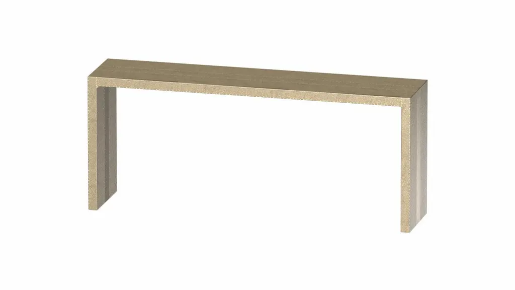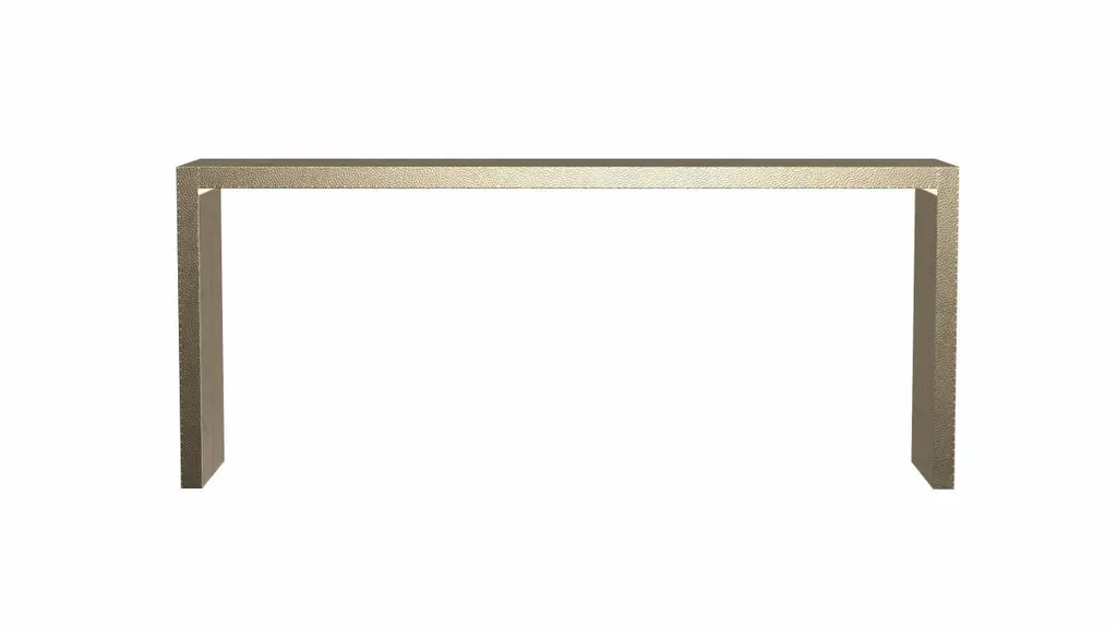 Alison Spear designed this elegant and minimal table for Stephanie Odegard during their trip together to Rajasthan, India. The craftsmen create patterns using different types of hammerings in the metal sheets clad over teak-wood structure.Crafted with utmost care and attention to detail, these Rectangular Console Tables are made to order and are available in twelve metal clad finishes, ensuring that you can choose the perfect one to match your individual style and taste. The use of high-quality materials and expert craftsmanship ensure that each Art Deco Rectangular Console Table is not only beautiful but also a true piece of art.The Straight legs and side arms of this Art Deco Rectangular Console Table are hand carved from solid pieces of teak. Pattern makers trace and cut complex forms that will cover the chair in a skin of copper, white bronze, brass or antiqued white bronze The metal finishes will tarnish over time. Regular non-abrasive household metal polishes can be used to restore the original luster.Overall, if you're looking for a piece of furniture that combines luxury, comfort, and style, then the Art Deco Rectangular Console Table is an excellent choice. With its distinctive curved profile and multiple finish options, this Chair set is sure to elevate the look of any room it is placed in, and be a beloved addition to your home for years to come.The images shown in this listing are shot in different lighting conditions and/or are 3D illustrations. We encourage our customers to please request a sample or a full sample set of 12 finishes so that they can experience the finish first hand. Art Deco Desks and Writing Console Tables Mid. Hammered in Brass by Alison SpearSize- 72"x 16"x 30"HMaterials - Brass, Metal sheet, Teak, Wood, MetalTechniques: Hand-Crafted, Hand-Carved, Metal Work, Wood Work, Metal Wrapping, PolishedPlease note that moisture in air, sudden change in temperature and natural movement of wood over time causes the metal to wrinkle or bubble up. We use well seasoned, reclaimed teak and high quality marine grade MDF (wherever technically possible) to avoid and delay the mentioned changes. However a perfect stability of metal cannot be guaranteed. Please note that our smooth finish metal clad pieces will have some unavoidable tool marks. This is proof that everything is done by hand. The smooth finish will not come out like a machine made perfect surface and the master artisan will do their best to make it look as good/clean/stable/perfect as he possibly can.The antique white bronze finish is hand done by using an acidic chemical over the white bronze finish to recreate a natural patination. Like with the natural patination of silver, copper, or brass, the final result and color uniformity of the patina cannot be guaranteed. The goal of this finish is to achieve rainbow-like shades with dull, shiny, cloudy, and streaky patches to give an illusion of antiquing. Please note:None of our metal clad pieces are treated with a protective “finish” thus enabling the items to age naturally over time. We will of course polish them well before we pack them. a) Copper oxidizes faster than the other metals. In six to twelve months it will most likely lose its shine and will gradually turn to different shades of brown and/or green/blue. This aging process and its effect is referred to as verdigris. After a year the piece should not change much more. Copper does not rust, but does require periodic cleaning in order to retain its original shine if that the preferred option. ('BRASSO' or any known copper polish can be used to polish copper).b) Brass retains its shine for far longer than others, but will tarnish if not cleaned on occasion. ('BRASSO' is made to polish brass).c) White bronze, has the least tendency to show age or tarnish. If kept in a controlled climate, this metal will hold its shine for years. It can be cleaned with a cleanser and polished with a cloth. d) The antiqued white bronze finish will react with the natural elements the fastest in the beginning but it too will stop reacting and will settle down in a stable state like copper after 6-12 months. Since it is already antiqued and looked like it is tarnished, as described in an earlier message, this fast reaction will not change the over all look. In that way this surface is most forgiving. The images shown in this listing are shot in different lighting conditions and/or are 3D illustrations. We encourage our customers to please request a sample or a full sample set of 12 finishes so that they can experience the finish first hand.
