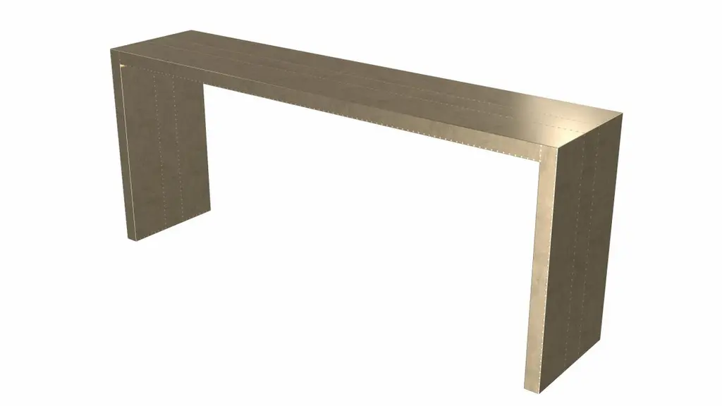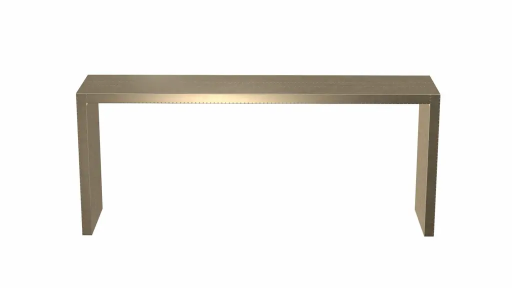 Alison Spear designed this elegant and minimal table for Stephanie Odegard during their trip together to Rajasthan, India. The craftsmen create patterns using different types of hammerings in the metal sheets clad over teak-wood structure.Crafted with utmost care and attention to detail, these Rectangular Console Tables are made to order and are available in twelve metal clad finishes, ensuring that you can choose the perfect one to match your individual style and taste. The use of high-quality materials and expert craftsmanship ensure that each Art Deco Rectangular Console Table is not only beautiful but also a true piece of art.The Straight legs and side arms of this Art Deco Rectangular Console Table are hand carved from solid pieces of teak. Pattern makers trace and cut complex forms that will cover the chair in a skin of copper, white bronze, brass or antiqued white bronze The metal finishes will tarnish over time. Regular non-abrasive household metal polishes can be used to restore the original luster.Overall, if you're looking for a piece of furniture that combines luxury, comfort, and style, then the Art Deco Rectangular Console Table is an excellent choice. With its distinctive curved profile and multiple finish options, this Chair set is sure to elevate the look of any room it is placed in, and be a beloved addition to your home for years to come.The images shown in this listing are shot in different lighting conditions and/or are 3D illustrations. We encourage our customers to please request a sample or a full sample set of 12 finishes so that they can experience the finish first hand. Art Deco Coffee and Cocktail Tables Rectangular Console in Smooth Brass by Alison SpearSize- 72"x 16"x 30"HMaterials - Brass, Metal sheet, Teak, Wood, MetalTechniques: Hand-Crafted, Hand-Carved, Metal Work, Wood Work, Metal Wrapping, PolishedPlease note that moisture in air, sudden change in temperature and natural movement of wood over time causes the metal to wrinkle or bubble up. We use well seasoned, reclaimed teak and high quality marine grade MDF (wherever technically possible) to avoid and delay the mentioned changes. However a perfect stability of metal cannot be guaranteed. Please note that our smooth finish metal clad pieces will have some unavoidable tool marks. This is proof that everything is done by hand. The smooth finish will not come out like a machine made perfect surface and the master artisan will do their best to make it look as good/clean/stable/perfect as he possibly can.The antique white bronze finish is hand done by using an acidic chemical over the white bronze finish to recreate a natural patination. Like with the natural patination of silver, copper, or brass, the final result and color uniformity of the patina cannot be guaranteed. The goal of this finish is to achieve rainbow-like shades with dull, shiny, cloudy, and streaky patches to give an illusion of antiquing. Please note:None of our metal clad pieces are treated with a protective “finish” thus enabling the items to age naturally over time. We will of course polish them well before we pack them. a) Copper oxidizes faster than the other metals. In six to twelve months it will most likely lose its shine and will gradually turn to different shades of brown and/or green/blue. This aging process and its effect is referred to as verdigris. After a year the piece should not change much more. Copper does not rust, but does require periodic cleaning in order to retain its original shine if that the preferred option. ('BRASSO' or any known copper polish can be used to polish copper).b) Brass retains its shine for far longer than others, but will tarnish if not cleaned on occasion. ('BRASSO' is made to polish brass).c) White bronze, has the least tendency to show age or tarnish. If kept in a controlled climate, this metal will hold its shine for years. It can be cleaned with a cleanser and polished with a cloth. d) The antiqued white bronze finish will react with the natural elements the fastest in the beginning but it too will stop reacting and will settle down in a stable state like copper after 6-12 months. Since it is already antiqued and looked like it is tarnished, as described in an earlier message, this fast reaction will not change the over all look. In that way this surface is most forgiving. The images shown in this listing are shot in different lighting conditions and/or are 3D illustrations. We encourage our customers to please request a sample or a full sample set of 12 finishes so that they can experience the finish first hand.
