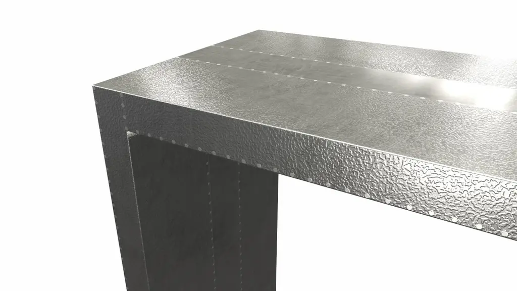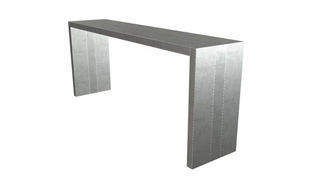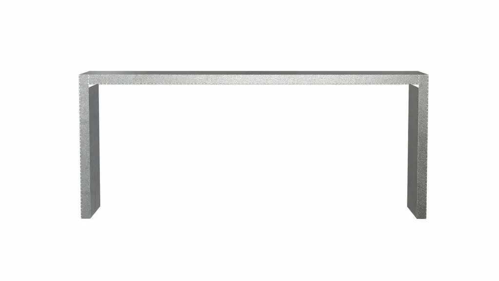 Alison Spear designed this elegant and minimal table for Stephanie Odegard during their trip together to Rajasthan, India. The craftsmen create patterns using different types of hammerings in the metal sheets clad over teak-wood structure.Crafted with utmost care and attention to detail, these Rectangular Console Tables are made to order and are available in twelve metal clad finishes, ensuring that you can choose the perfect one to match your individual style and taste. The use of high-quality materials and expert craftsmanship ensure that each Art Deco Rectangular Console Table is not only beautiful but also a true piece of art.The Straight legs and side arms of this Art Deco Rectangular Console Table are hand carved from solid pieces of teak. Pattern makers trace and cut complex forms that will cover the chair in a skin of copper, white bronze, brass or antiqued white bronze The metal finishes will tarnish over time. Regular non-abrasive household metal polishes can be used to restore the original luster.Overall, if you're looking for a piece of furniture that combines luxury, comfort, and style, then the Art Deco Rectangular Console Table is an excellent choice. With its distinctive curved profile and multiple finish options, this Chair set is sure to elevate the look of any room it is placed in, and be a beloved addition to your home for years to come.The images shown in this listing are shot in different lighting conditions and/or are 3D illustrations. We encourage our customers to please request a sample or a full sample set of 12 finishes so that they can experience the finish first hand. Art deco Conference Console Tables in White Bronze Fine Hammered by Alison SpearSize- 72"x 16"x 30"HMaterials - White Bronze, Metal sheet, Teak, Wood, MetalTechniques: Hand-Crafted, Hand-Carved, Metal Work, Wood Work, Metal Wrapping, PolishedPlease note that moisture in air, sudden change in temperature and natural movement of wood over time causes the metal to wrinkle or bubble up. We use well seasoned, reclaimed teak and high quality marine grade MDF (wherever technically possible) to avoid and delay the mentioned changes. However a perfect stability of metal cannot be guaranteed. Please note that our smooth finish metal clad pieces will have some unavoidable tool marks. This is proof that everything is done by hand. The smooth finish will not come out like a machine made perfect surface and the master artisan will do their best to make it look as good/clean/stable/perfect as he possibly can.The antique white bronze finish is hand done by using an acidic chemical over the white bronze finish to recreate a natural patination. Like with the natural patination of silver, copper, or brass, the final result and color uniformity of the patina cannot be guaranteed. The goal of this finish is to achieve rainbow-like shades with dull, shiny, cloudy, and streaky patches to give an illusion of antiquing. Please note:None of our metal clad pieces are treated with a protective “finish” thus enabling the items to age naturally over time. We will of course polish them well before we pack them. a) Copper oxidizes faster than the other metals. In six to twelve months it will most likely lose its shine and will gradually turn to different shades of brown and/or green/blue. This aging process and its effect is referred to as verdigris. After a year the piece should not change much more. Copper does not rust, but does require periodic cleaning in order to retain its original shine if that the preferred option. ('BRASSO' or any known copper polish can be used to polish copper).b) Brass retains its shine for far longer than others, but will tarnish if not cleaned on occasion. ('BRASSO' is made to polish brass).c) White bronze, has the least tendency to show age or tarnish. If kept in a controlled climate, this metal will hold its shine for years. It can be cleaned with a cleanser and polished with a cloth. d) The antiqued white bronze finish will react with the natural elements the fastest in the beginning but it too will stop reacting and will settle down in a stable state like copper after 6-12 months. Since it is already antiqued and looked like it is tarnished, as described in an earlier message, this fast reaction will not change the over all look. In that way this surface is most forgiving. The images shown in this listing are shot in different lighting conditions and/or are 3D illustrations. We encourage our customers to please request a sample or a full sample set of 12 finishes so that they can experience the finish first hand.
