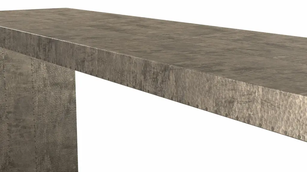 Alison Spear designed this elegant and minimal table for Stephanie Odegard during their trip together to Rajasthan, India. The craftsmen create patterns using different types of hammerings in the metal sheets clad over teak-wood structure.Crafted with utmost care and attention to detail, these Rectangular Console Tables are made to order and are available in twelve metal clad finishes, ensuring that you can choose the perfect one to match your individual style and taste. The use of high-quality materials and expert craftsmanship ensure that each Art Deco Rectangular Console Table is not only beautiful but also a true piece of art.The Straight legs and side arms of this Art Deco Rectangular Console Table are hand carved from solid pieces of teak. Pattern makers trace and cut complex forms that will cover the chair in a skin of copper, white bronze, brass or antiqued white bronze The metal finishes will tarnish over time. Regular non-abrasive household metal polishes can be used to restore the original luster.Overall, if you're looking for a piece of furniture that combines luxury, comfort, and style, then the Art Deco Rectangular Console Table is an excellent choice. With its distinctive curved profile and multiple finish options, this Chair set is sure to elevate the look of any room it is placed in, and be a beloved addition to your home for years to come.The images shown in this listing are shot in different lighting conditions and/or are 3D illustrations. We encourage our customers to please request a sample or a full sample set of 12 finishes so that they can experience the finish first hand. Art Deco Game Console Tables in Antique Bronze Mid. Hammered by Alison SpearSize- 72"x 16"x 30"HMaterials - Antique Bronze, Metal sheet, Teak, Wood, MetalTechniques: Hand-Crafted, Hand-Carved, Metal Work, Wood Work, Metal Wrapping, PolishedPlease note that moisture in air, sudden change in temperature and natural movement of wood over time causes the metal to wrinkle or bubble up. We use well seasoned, reclaimed teak and high quality marine grade MDF (wherever technically possible) to avoid and delay the mentioned changes. However a perfect stability of metal cannot be guaranteed. Please note that our smooth finish metal clad pieces will have some unavoidable tool marks. This is proof that everything is done by hand. The smooth finish will not come out like a machine made perfect surface and the master artisan will do their best to make it look as good/clean/stable/perfect as he possibly can.The antique white bronze finish is hand done by using an acidic chemical over the white bronze finish to recreate a natural patination. Like with the natural patination of silver, copper, or brass, the final result and color uniformity of the patina cannot be guaranteed. The goal of this finish is to achieve rainbow-like shades with dull, shiny, cloudy, and streaky patches to give an illusion of antiquing. Please note:None of our metal clad pieces are treated with a protective “finish” thus enabling the items to age naturally over time. We will of course polish them well before we pack them. a) Copper oxidizes faster than the other metals. In six to twelve months it will most likely lose its shine and will gradually turn to different shades of brown and/or green/blue. This aging process and its effect is referred to as verdigris. After a year the piece should not change much more. Copper does not rust, but does require periodic cleaning in order to retain its original shine if that the preferred option. ('BRASSO' or any known copper polish can be used to polish copper).b) Brass retains its shine for far longer than others, but will tarnish if not cleaned on occasion. ('BRASSO' is made to polish brass).c) White bronze, has the least tendency to show age or tarnish. If kept in a controlled climate, this metal will hold its shine for years. It can be cleaned with a cleanser and polished with a cloth. d) The antiqued white bronze finish will react with the natural elements the fastest in the beginning but it too will stop reacting and will settle down in a stable state like copper after 6-12 months. Since it is already antiqued and looked like it is tarnished, as described in an earlier message, this fast reaction will not change the over all look. In that way this surface is most forgiving. The images shown in this listing are shot in different lighting conditions and/or are 3D illustrations. We encourage our customers to please request a sample or a full sample set of 12 finishes so that they can experience the finish first hand.