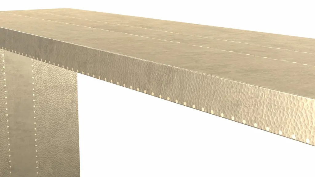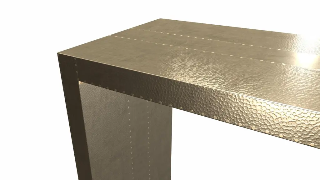 Alison Spear designed this elegant and minimal table for Stephanie Odegard during their trip together to Rajasthan, India. The craftsmen create patterns using different types of hammerings in the metal sheets clad over teak-wood structure.Crafted with utmost care and attention to detail, these Rectangular Console Tables are made to order and are available in twelve metal clad finishes, ensuring that you can choose the perfect one to match your individual style and taste. The use of high-quality materials and expert craftsmanship ensure that each Art Deco Rectangular Console Table is not only beautiful but also a true piece of art.The Straight legs and side arms of this Art Deco Rectangular Console Table are hand carved from solid pieces of teak. Pattern makers trace and cut complex forms that will cover the chair in a skin of copper, white bronze, brass or antiqued white bronze The metal finishes will tarnish over time. Regular non-abrasive household metal polishes can be used to restore the original luster.Overall, if you're looking for a piece of furniture that combines luxury, comfort, and style, then the Art Deco Rectangular Console Table is an excellent choice. With its distinctive curved profile and multiple finish options, this Chair set is sure to elevate the look of any room it is placed in, and be a beloved addition to your home for years to come.The images shown in this listing are shot in different lighting conditions and/or are 3D illustrations. We encourage our customers to please request a sample or a full sample set of 12 finishes so that they can experience the finish first hand. Art Deco Game Console Tables Mid. Hammered in Brass by Alison SpearSize- 72"x 16"x 30"HMaterials - Brass, Metal sheet, Teak, Wood, MetalTechniques: Hand-Crafted, Hand-Carved, Metal Work, Wood Work, Metal Wrapping, PolishedPlease note that moisture in air, sudden change in temperature and natural movement of wood over time causes the metal to wrinkle or bubble up. We use well seasoned, reclaimed teak and high quality marine grade MDF (wherever technically possible) to avoid and delay the mentioned changes. However a perfect stability of metal cannot be guaranteed. Please note that our smooth finish metal clad pieces will have some unavoidable tool marks. This is proof that everything is done by hand. The smooth finish will not come out like a machine made perfect surface and the master artisan will do their best to make it look as good/clean/stable/perfect as he possibly can.The antique white bronze finish is hand done by using an acidic chemical over the white bronze finish to recreate a natural patination. Like with the natural patination of silver, copper, or brass, the final result and color uniformity of the patina cannot be guaranteed. The goal of this finish is to achieve rainbow-like shades with dull, shiny, cloudy, and streaky patches to give an illusion of antiquing. Please note:None of our metal clad pieces are treated with a protective “finish” thus enabling the items to age naturally over time. We will of course polish them well before we pack them. a) Copper oxidizes faster than the other metals. In six to twelve months it will most likely lose its shine and will gradually turn to different shades of brown and/or green/blue. This aging process and its effect is referred to as verdigris. After a year the piece should not change much more. Copper does not rust, but does require periodic cleaning in order to retain its original shine if that the preferred option. ('BRASSO' or any known copper polish can be used to polish copper).b) Brass retains its shine for far longer than others, but will tarnish if not cleaned on occasion. ('BRASSO' is made to polish brass).c) White bronze, has the least tendency to show age or tarnish. If kept in a controlled climate, this metal will hold its shine for years. It can be cleaned with a cleanser and polished with a cloth. d) The antiqued white bronze finish will react with the natural elements the fastest in the beginning but it too will stop reacting and will settle down in a stable state like copper after 6-12 months. Since it is already antiqued and looked like it is tarnished, as described in an earlier message, this fast reaction will not change the over all look. In that way this surface is most forgiving. The images shown in this listing are shot in different lighting conditions and/or are 3D illustrations. We encourage our customers to please request a sample or a full sample set of 12 finishes so that they can experience the finish first hand.