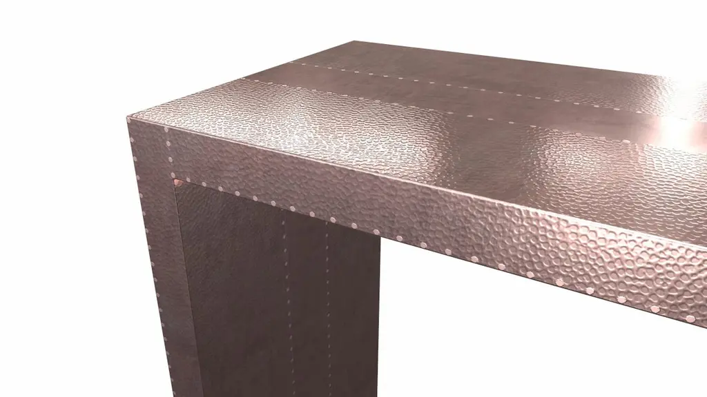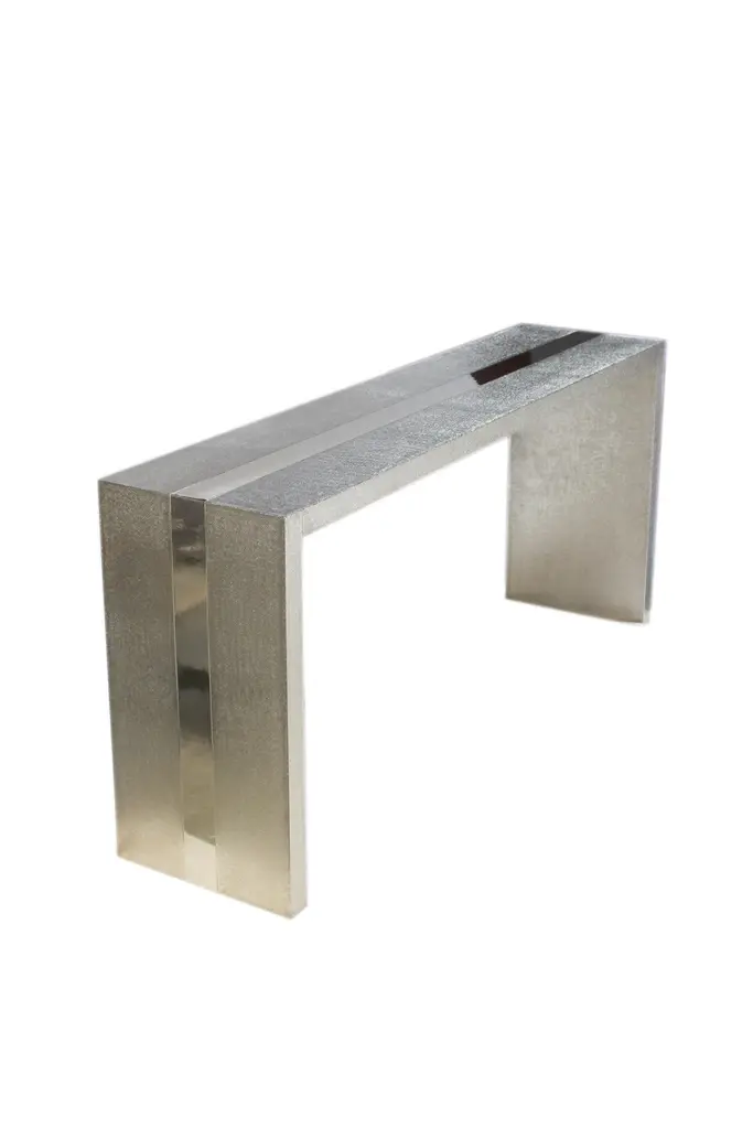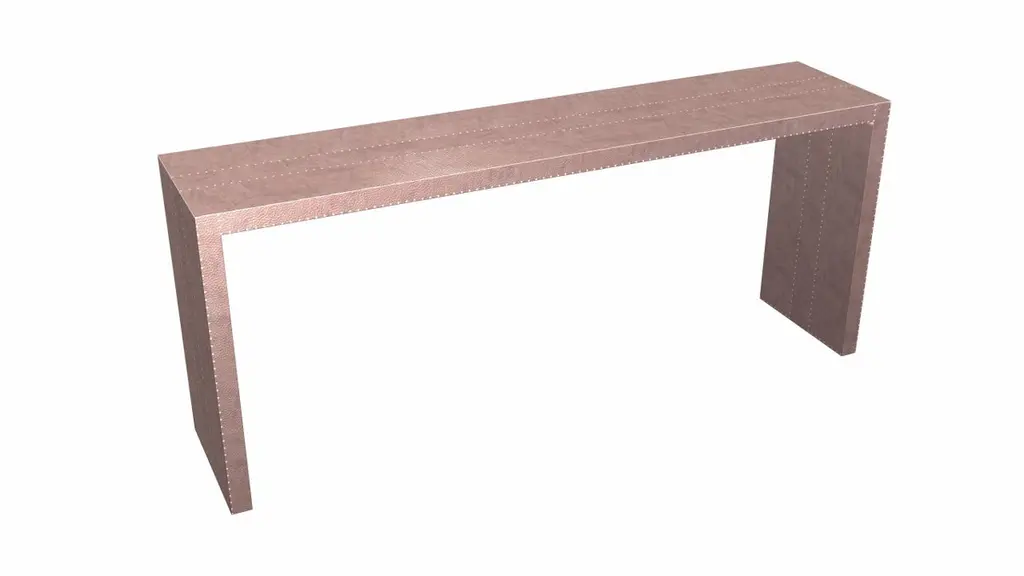 Alison Spear designed this elegant and minimal table for Stephanie Odegard during their trip together to Rajasthan, India. The craftsmen create patterns using different types of hammerings in the metal sheets clad over teak-wood structure.Crafted with utmost care and attention to detail, these Rectangular Console Tables are made to order and are available in twelve metal clad finishes, ensuring that you can choose the perfect one to match your individual style and taste. The use of high-quality materials and expert craftsmanship ensure that each Art Deco Rectangular Console Table is not only beautiful but also a true piece of art.The Straight legs and side arms of this Art Deco Rectangular Console Table are hand carved from solid pieces of teak. Pattern makers trace and cut complex forms that will cover the chair in a skin of copper, white bronze, brass or antiqued white bronze The metal finishes will tarnish over time. Regular non-abrasive household metal polishes can be used to restore the original luster.Overall, if you're looking for a piece of furniture that combines luxury, comfort, and style, then the Art Deco Rectangular Console Table is an excellent choice. With its distinctive curved profile and multiple finish options, this Chair set is sure to elevate the look of any room it is placed in, and be a beloved addition to your home for years to come.The images shown in this listing are shot in different lighting conditions and/or are 3D illustrations. We encourage our customers to please request a sample or a full sample set of 12 finishes so that they can experience the finish first hand. Art Deco Game Console Tables Mid.Hammered in Copper by Alison SpearSize- 72"x 16"x 30"HMaterials - Copper, Metal sheet, Teak, Wood, MetalTechniques: Hand-Crafted, Hand-Carved, Metal Work, Wood Work, Metal Wrapping, PolishedPlease note that moisture in air, sudden change in temperature and natural movement of wood over time causes the metal to wrinkle or bubble up. We use well seasoned, reclaimed teak and high quality marine grade MDF (wherever technically possible) to avoid and delay the mentioned changes. However a perfect stability of metal cannot be guaranteed. Please note that our smooth finish metal clad pieces will have some unavoidable tool marks. This is proof that everything is done by hand. The smooth finish will not come out like a machine made perfect surface and the master artisan will do their best to make it look as good/clean/stable/perfect as he possibly can.The antique white bronze finish is hand done by using an acidic chemical over the white bronze finish to recreate a natural patination. Like with the natural patination of silver, copper, or brass, the final result and color uniformity of the patina cannot be guaranteed. The goal of this finish is to achieve rainbow-like shades with dull, shiny, cloudy, and streaky patches to give an illusion of antiquing. Please note:None of our metal clad pieces are treated with a protective “finish” thus enabling the items to age naturally over time. We will of course polish them well before we pack them. a) Copper oxidizes faster than the other metals. In six to twelve months it will most likely lose its shine and will gradually turn to different shades of brown and/or green/blue. This aging process and its effect is referred to as verdigris. After a year the piece should not change much more. Copper does not rust, but does require periodic cleaning in order to retain its original shine if that the preferred option. ('BRASSO' or any known copper polish can be used to polish copper).b) Brass retains its shine for far longer than others, but will tarnish if not cleaned on occasion. ('BRASSO' is made to polish brass).c) White bronze, has the least tendency to show age or tarnish. If kept in a controlled climate, this metal will hold its shine for years. It can be cleaned with a cleanser and polished with a cloth. d) The antiqued white bronze finish will react with the natural elements the fastest in the beginning but it too will stop reacting and will settle down in a stable state like copper after 6-12 months. Since it is already antiqued and looked like it is tarnished, as described in an earlier message, this fast reaction will not change the over all look. In that way this surface is most forgiving. The images shown in this listing are shot in different lighting conditions and/or are 3D illustrations. We encourage our customers to please request a sample or a full sample set of 12 finishes so that they can experience the finish first hand.